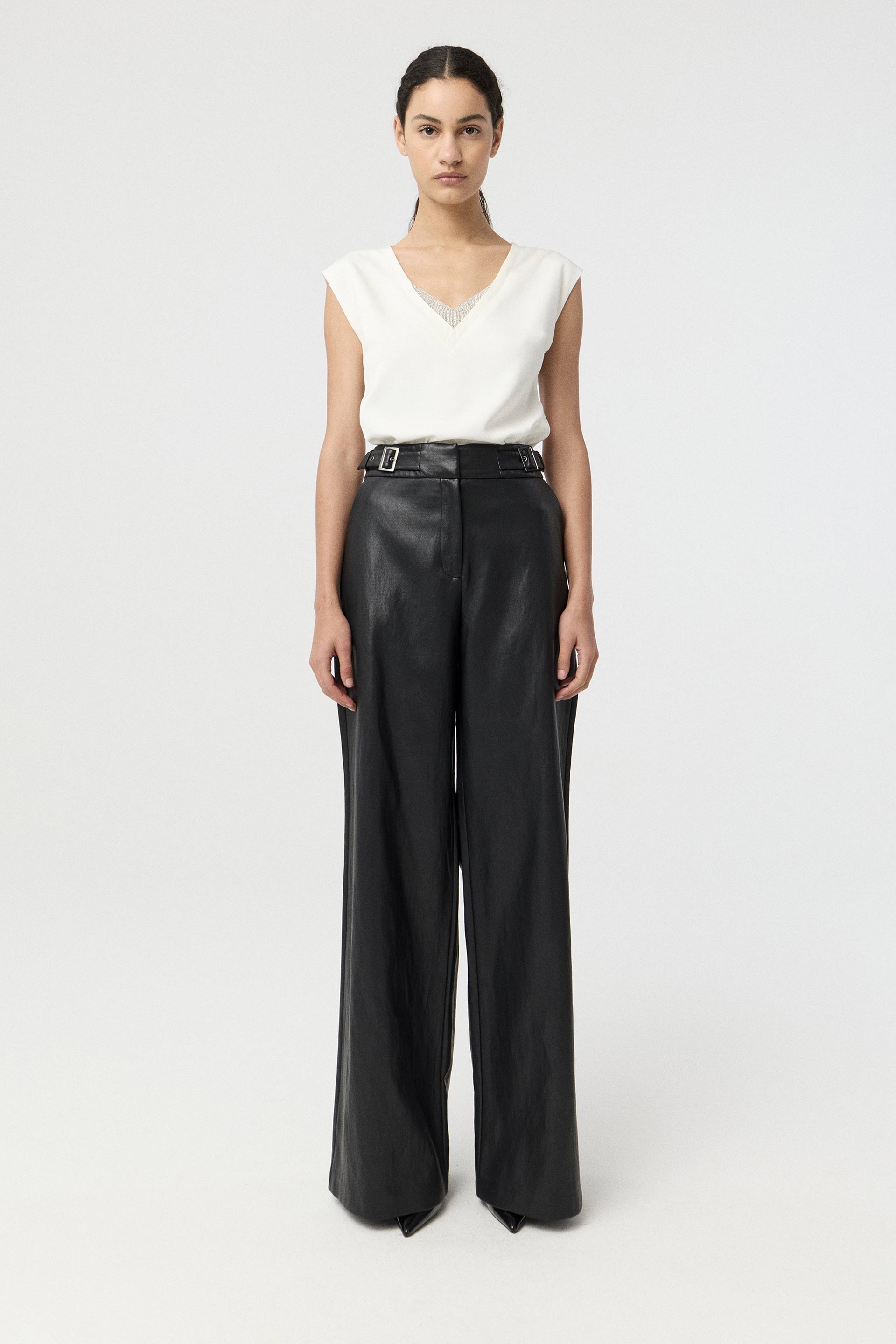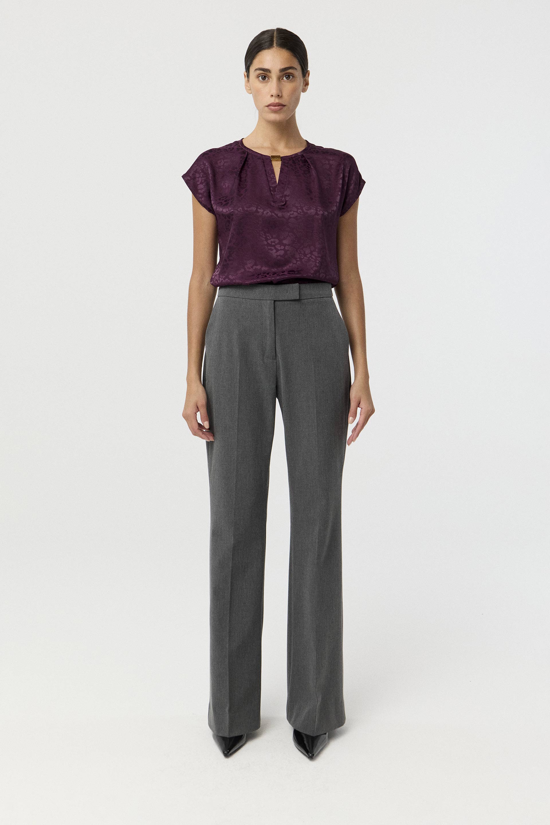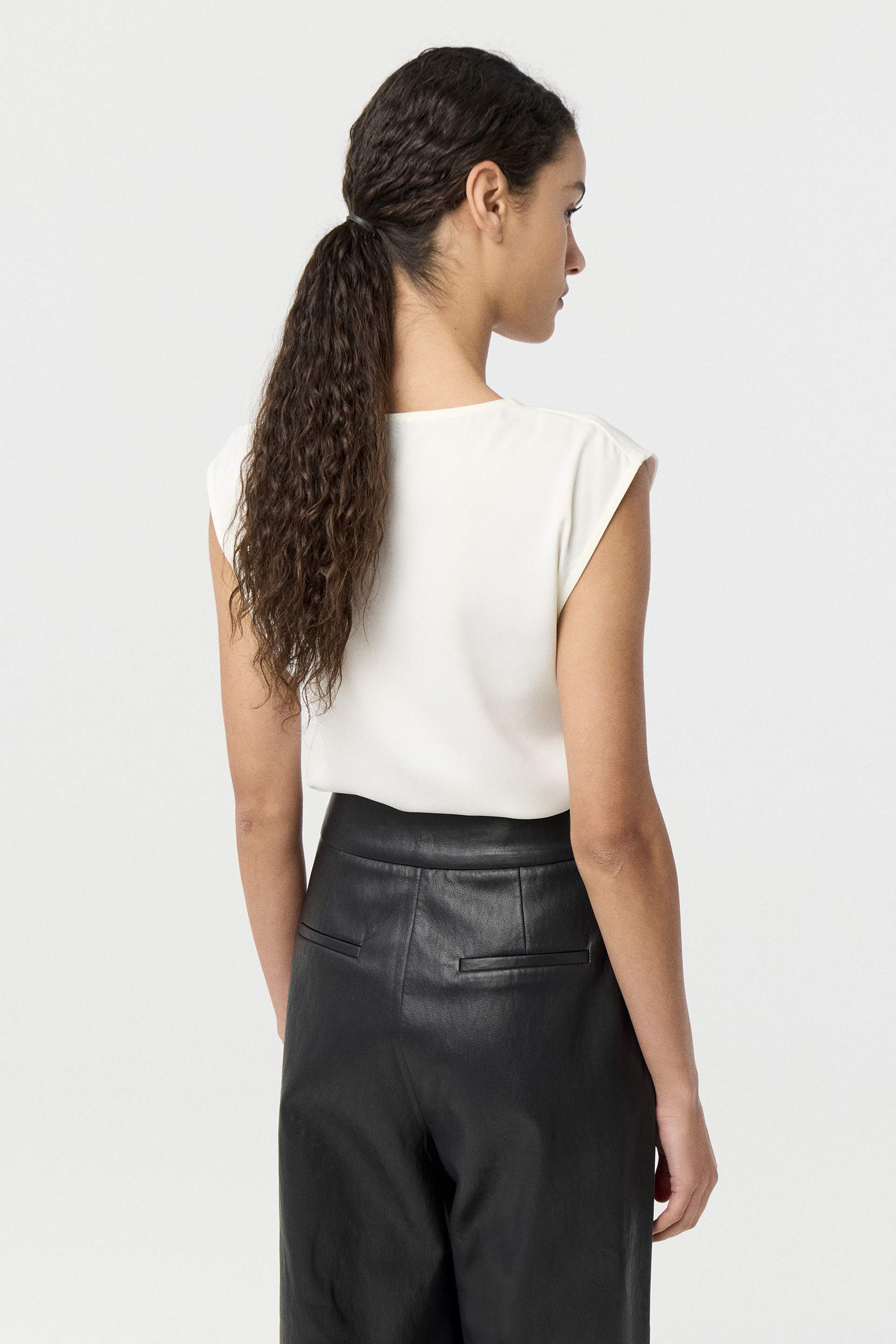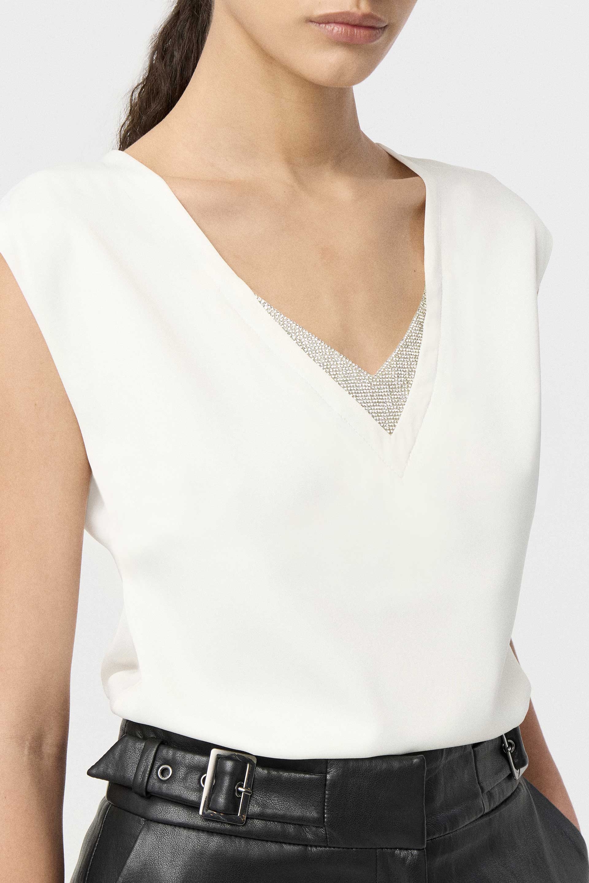 Blusa de satén opaco de calce al cuerpo. Manga corta, hombros caídos y escote en V con aplique de strass. Este top eleva tu look de noche al instante.