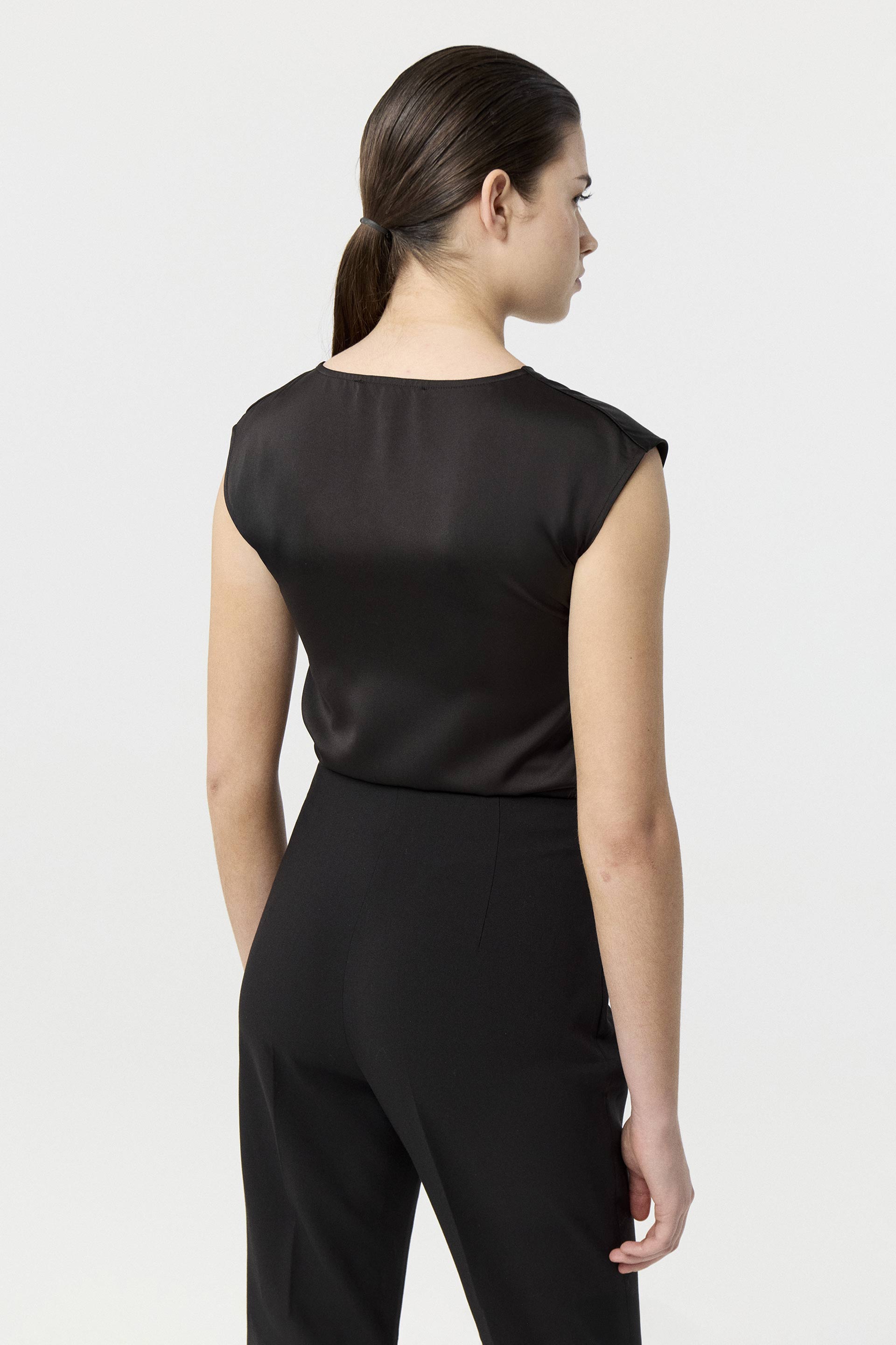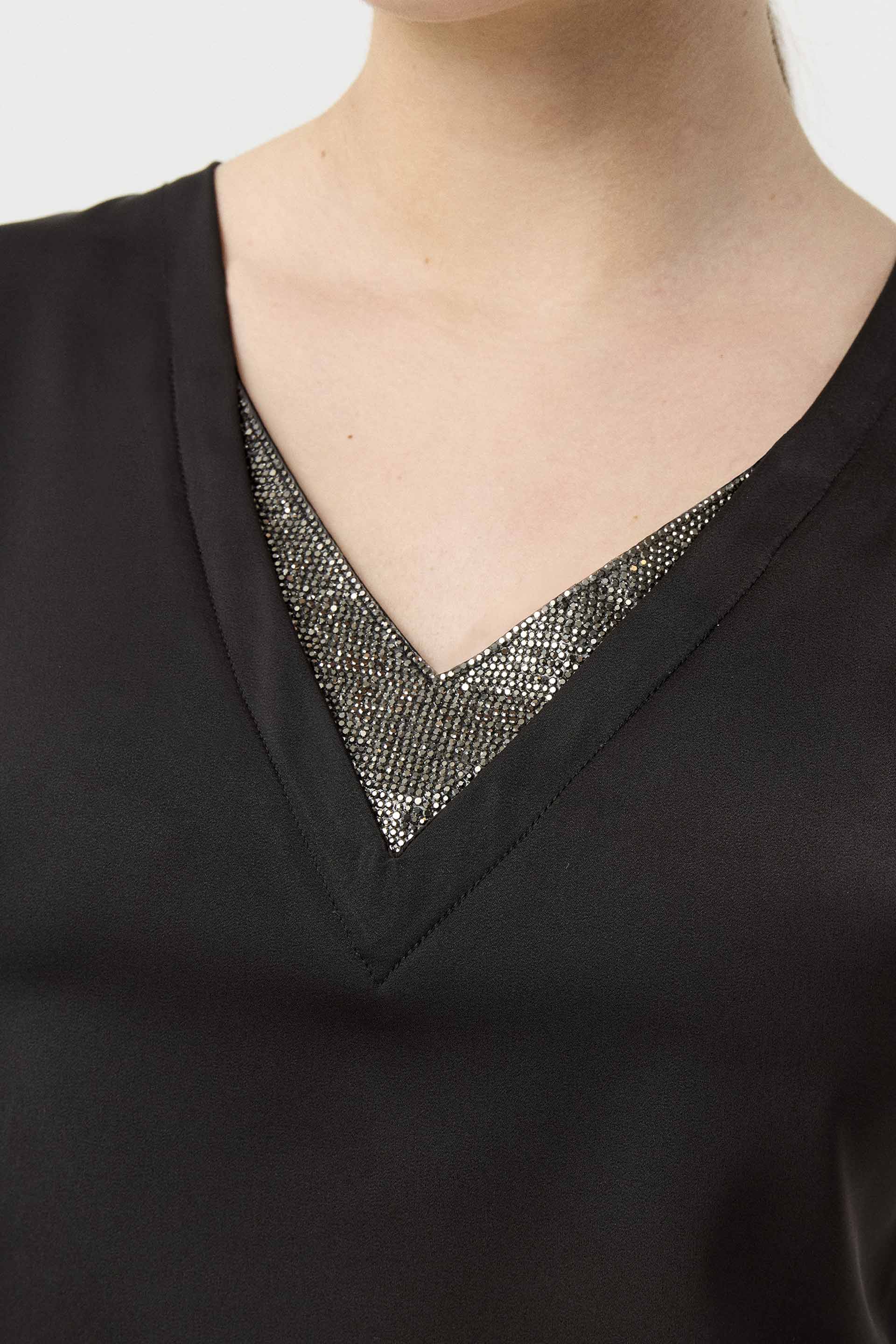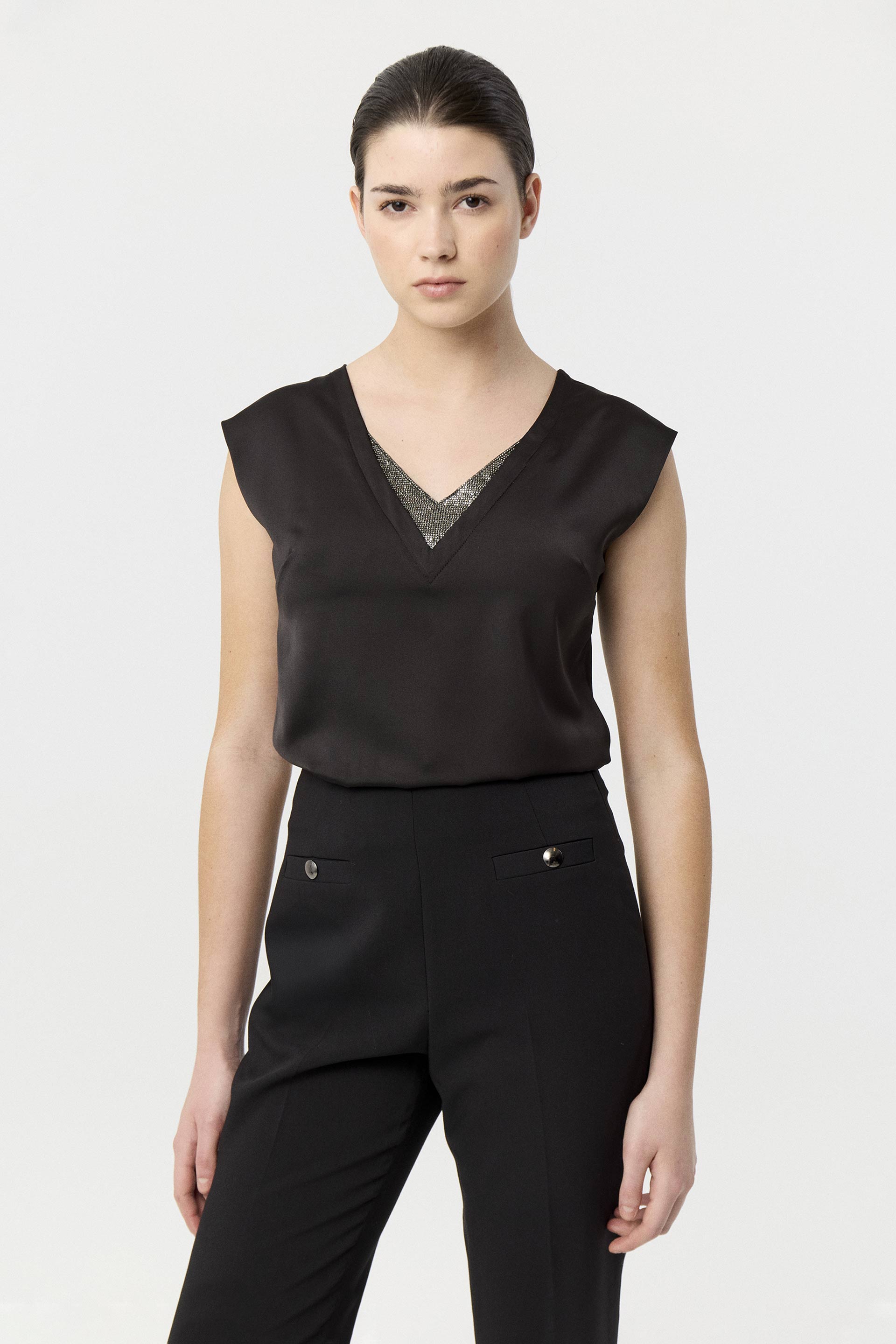 Blusa de satén opaco de calce al cuerpo. Manga corta, hombros caídos y escote en V con aplique de strass. Este top eleva tu look de noche al instante.