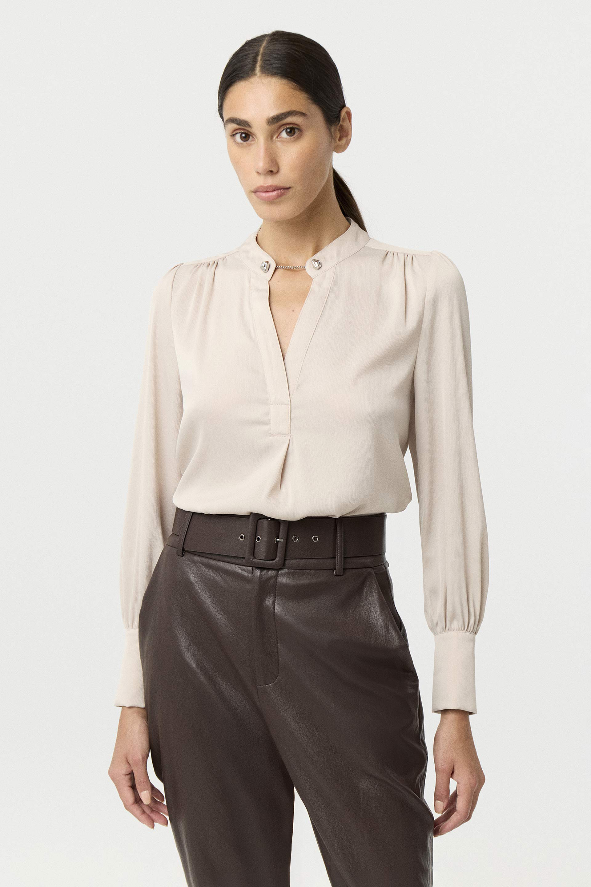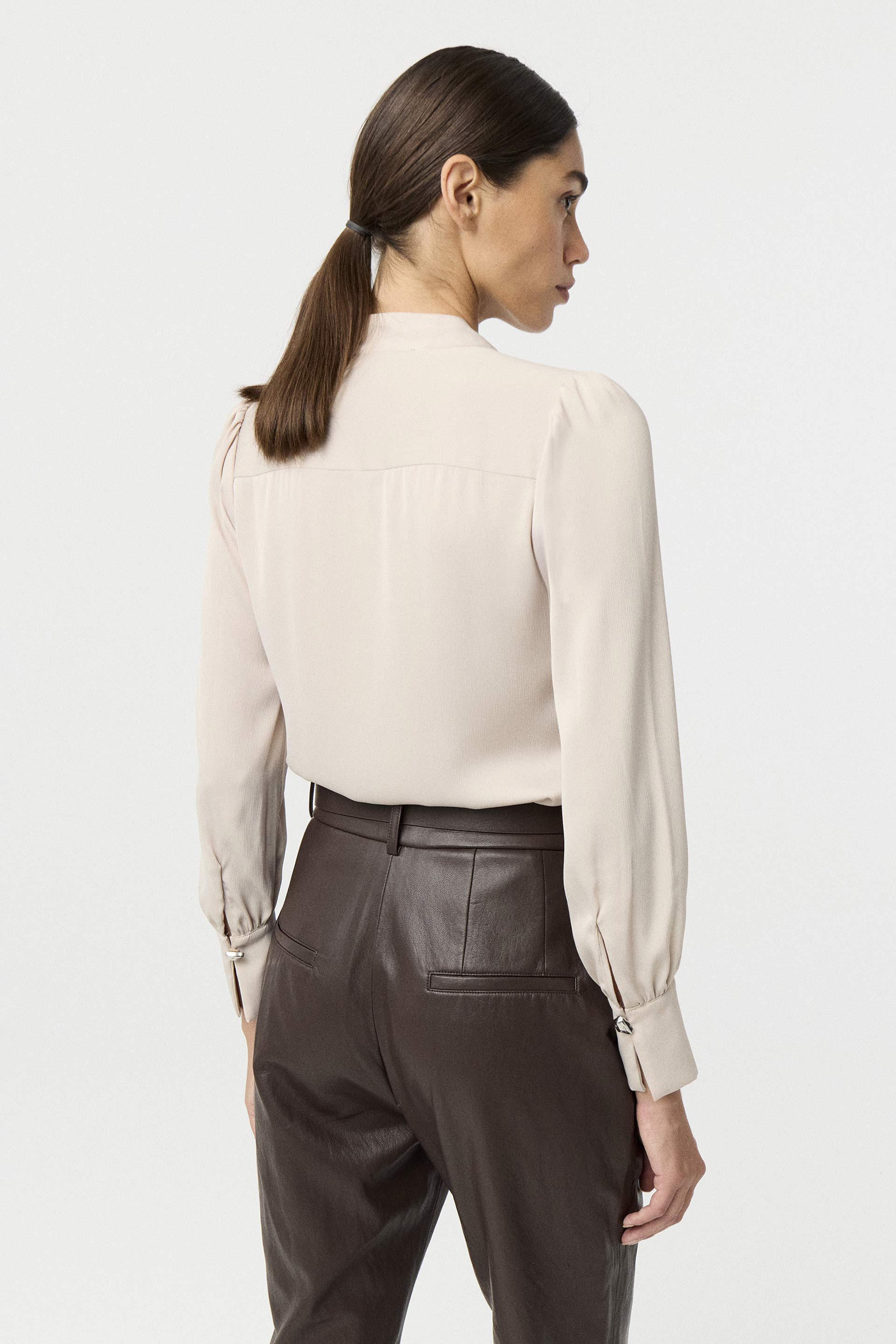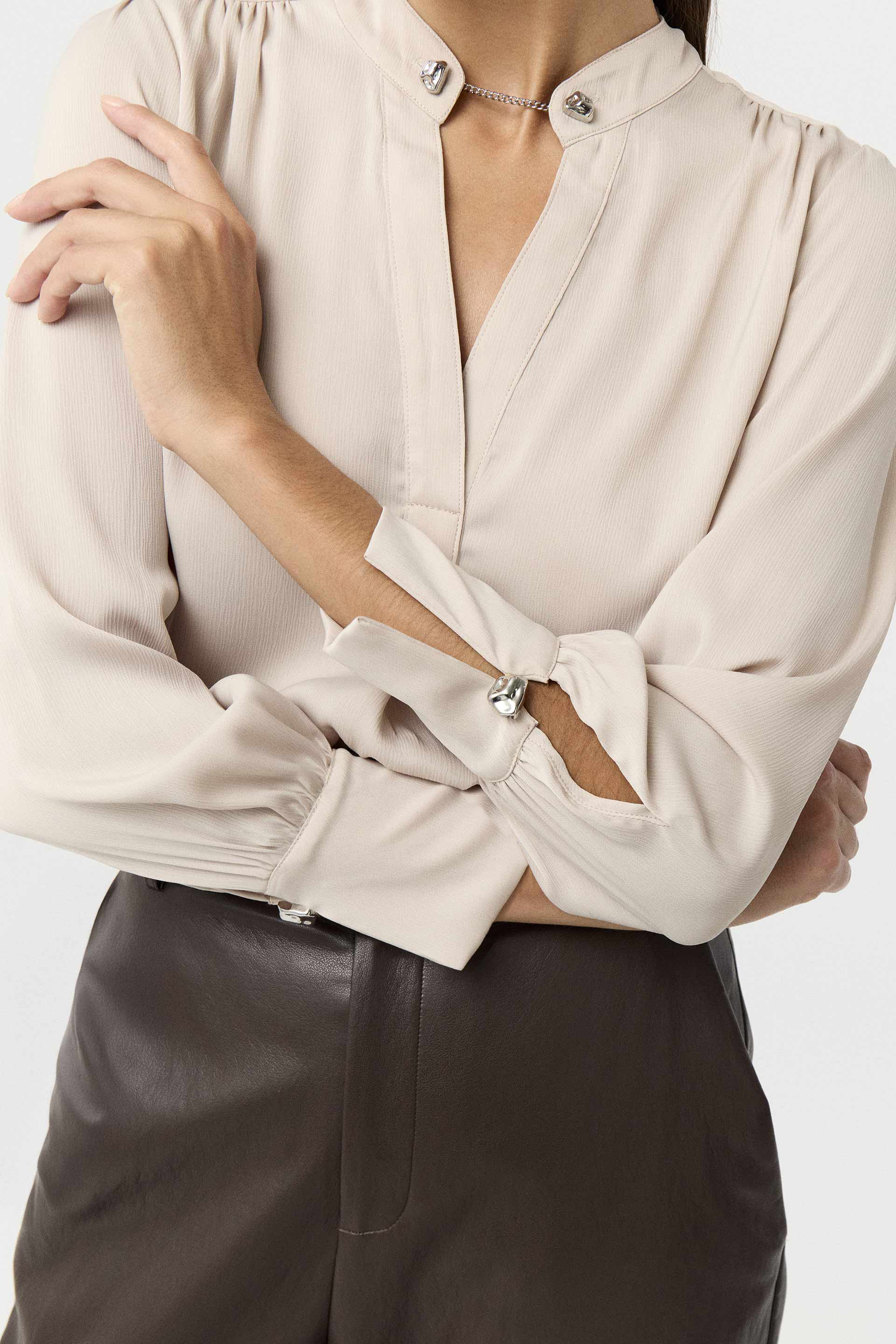 Blusa de sedita plisada de calce relajado. Mangas largas con puños altos, cartera cruzada con tablón y cuello mao con gemelo metálico. Liviana, luminosa y con movimiento. La aliada perfecta para elevar cualquier look sastrero sin esfuerzo.