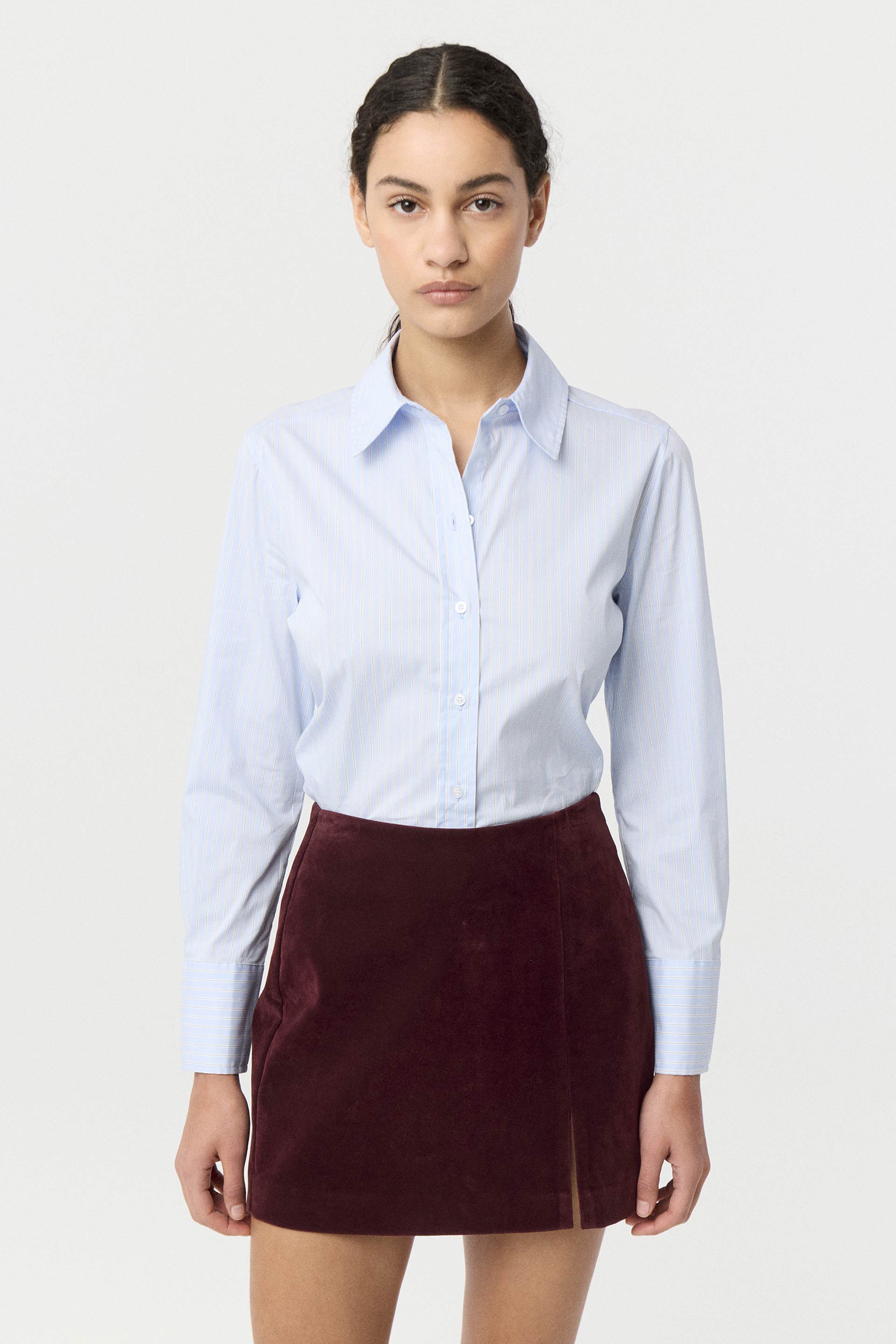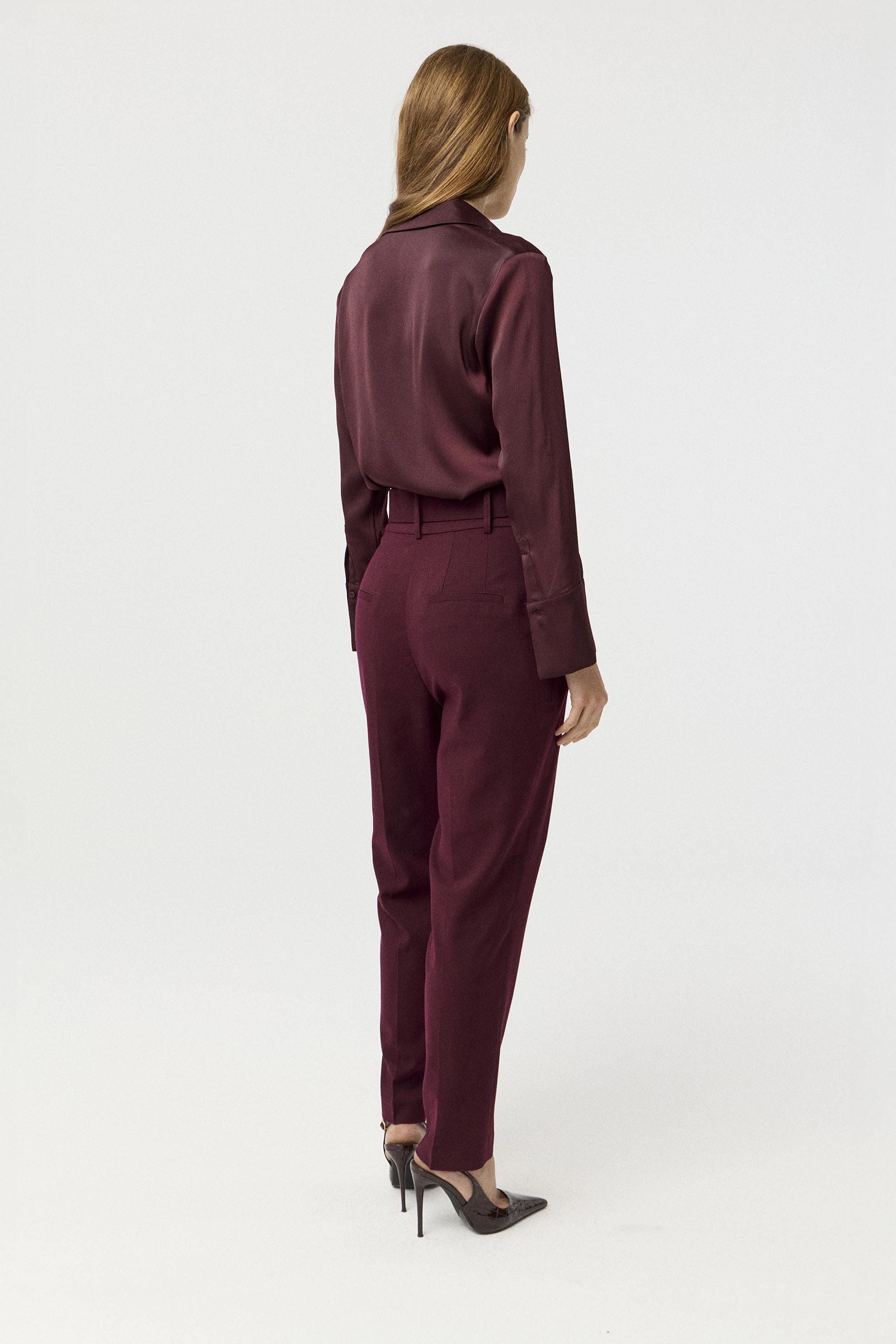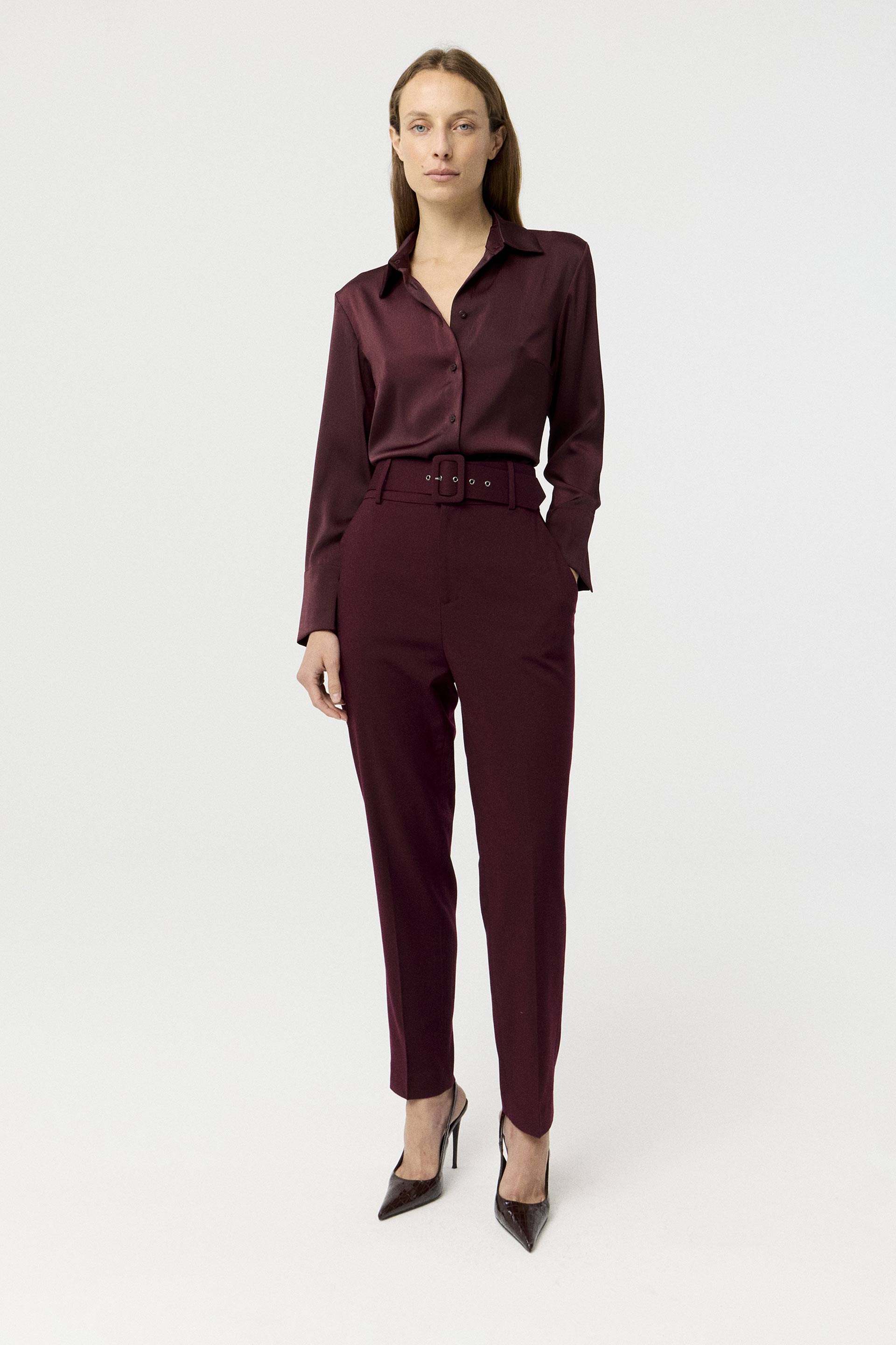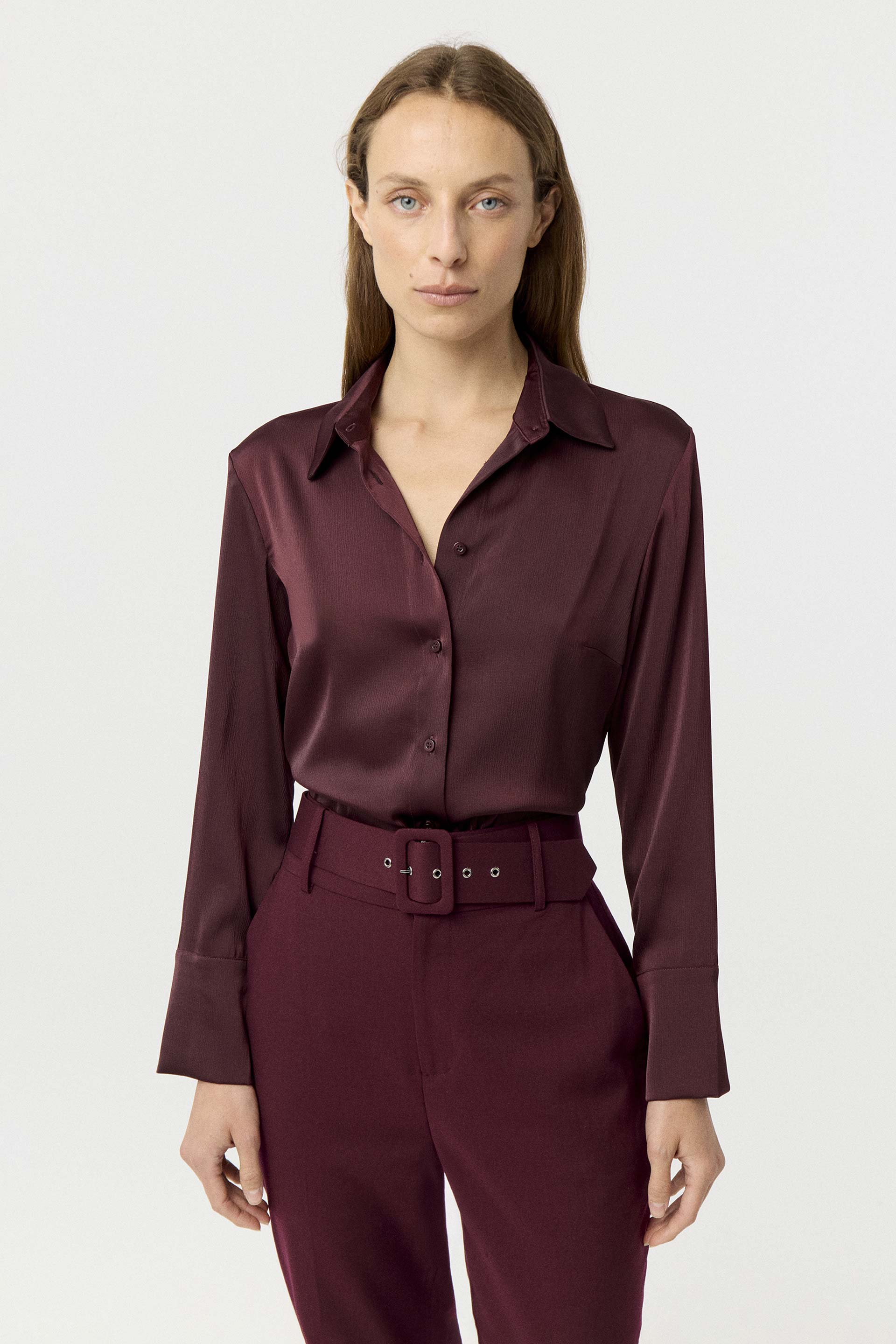 Camisa de satén texturado de calce al cuerpo. Mangas largas con puños altos, cuello camisa clásico y botones a tono. Un básico de calidad infaltable en cualquier guardarropas.