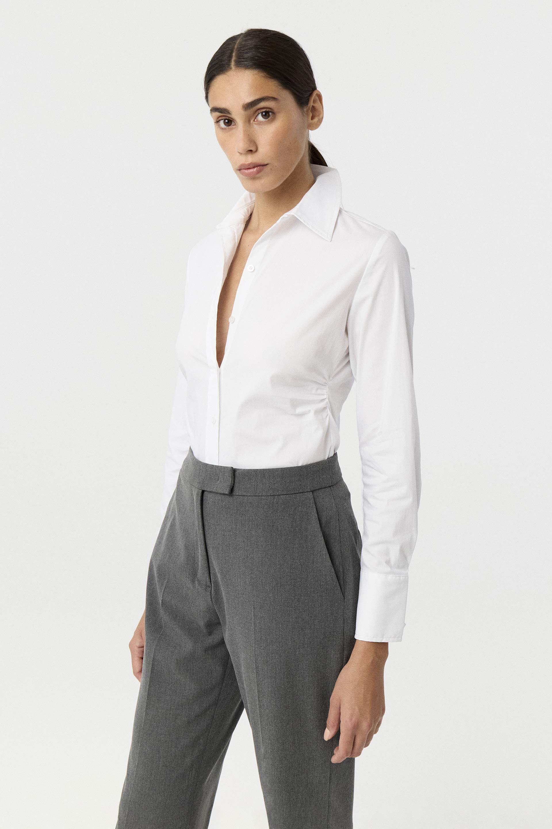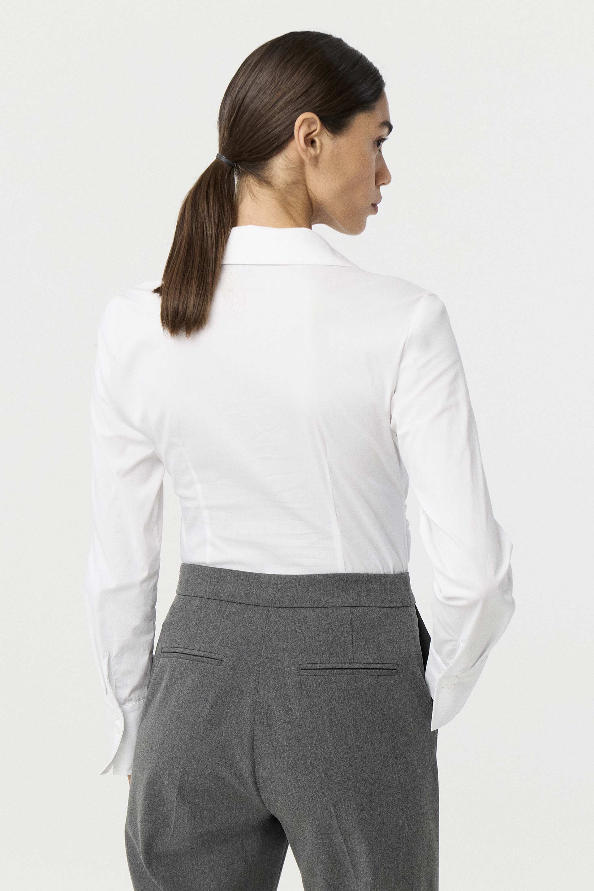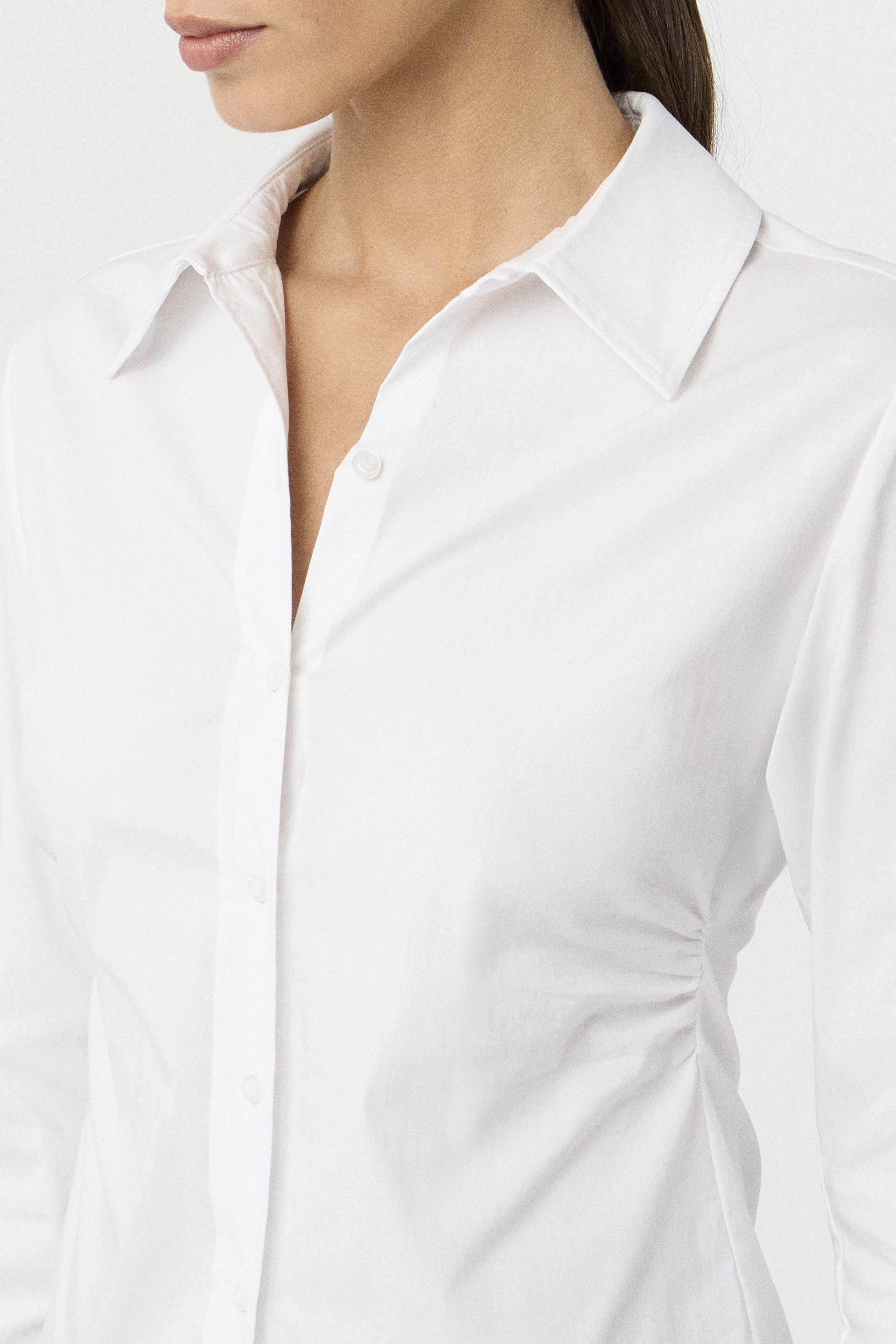 Camisa de poplín elastizado de calce al cuerpo. Mangas largas con puño alto, cuello camisa clásico con botones a tono y frunces laterales que realzan la cintura. Un básico práctico, actual y siempre vigente: la camisa que nunca falla.