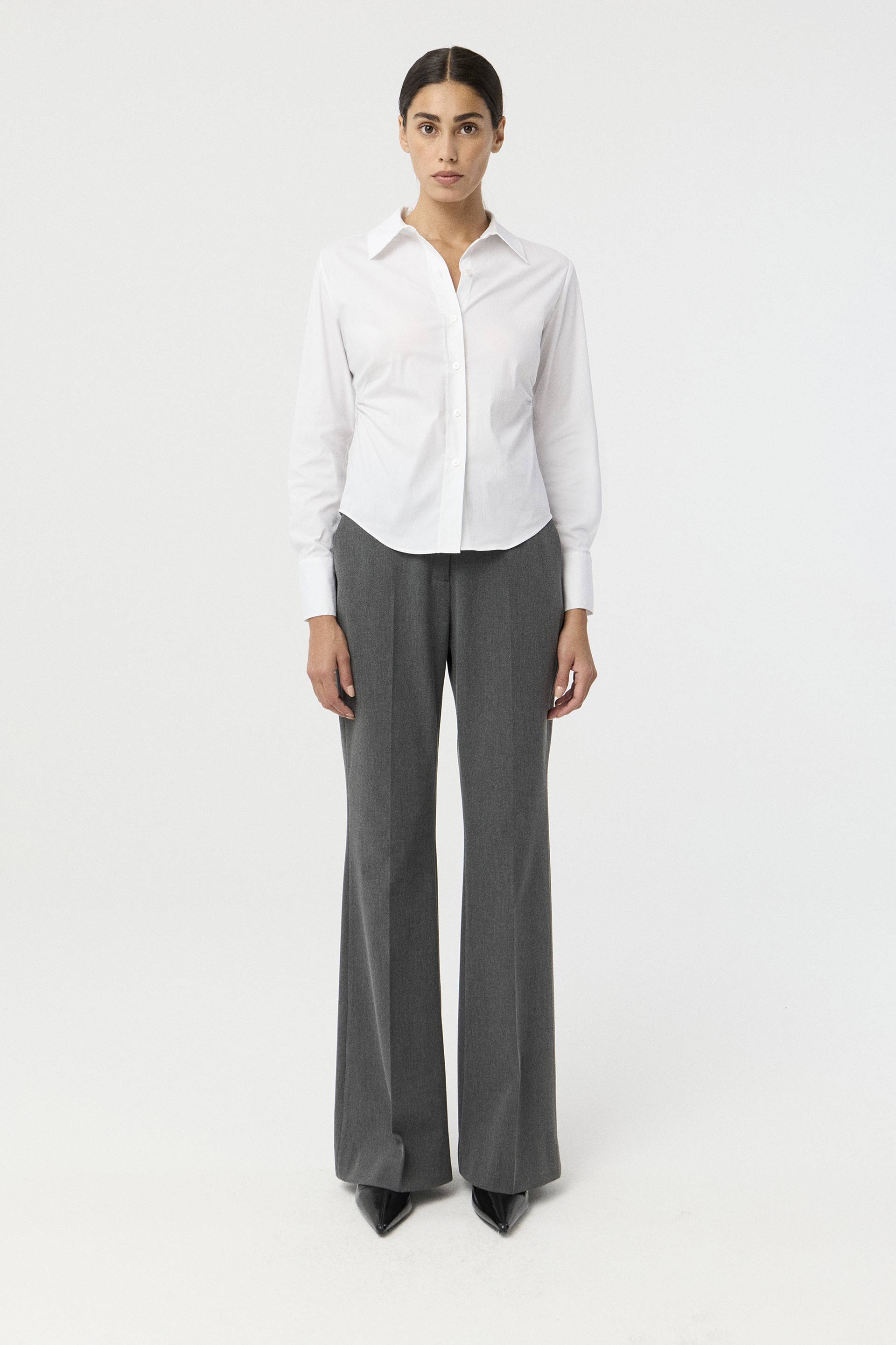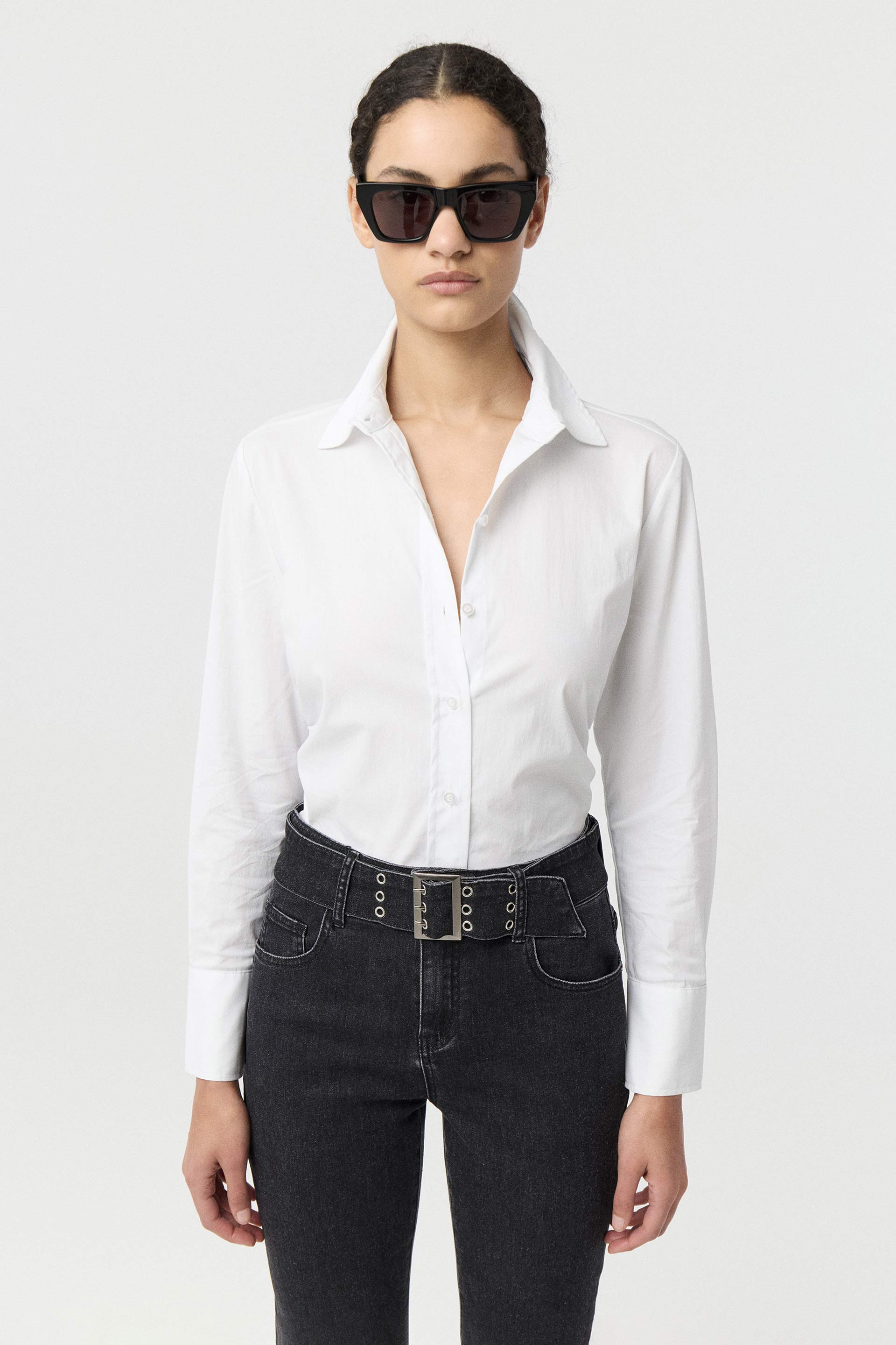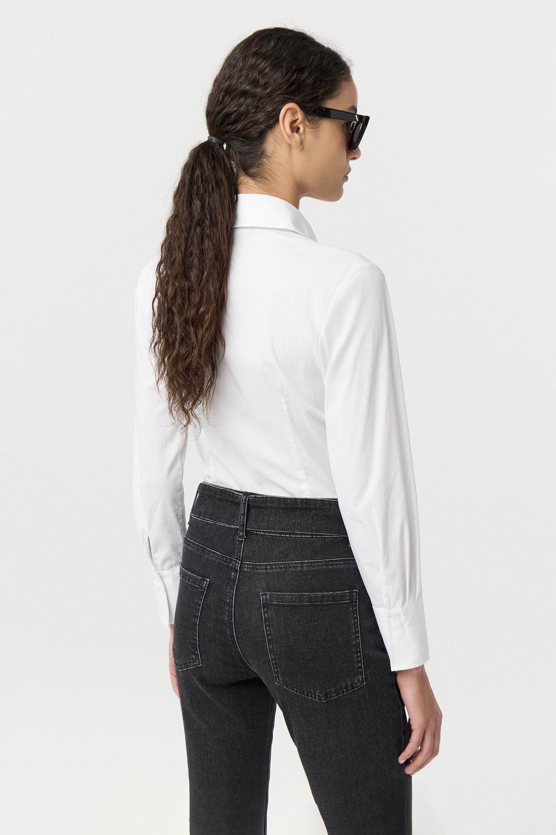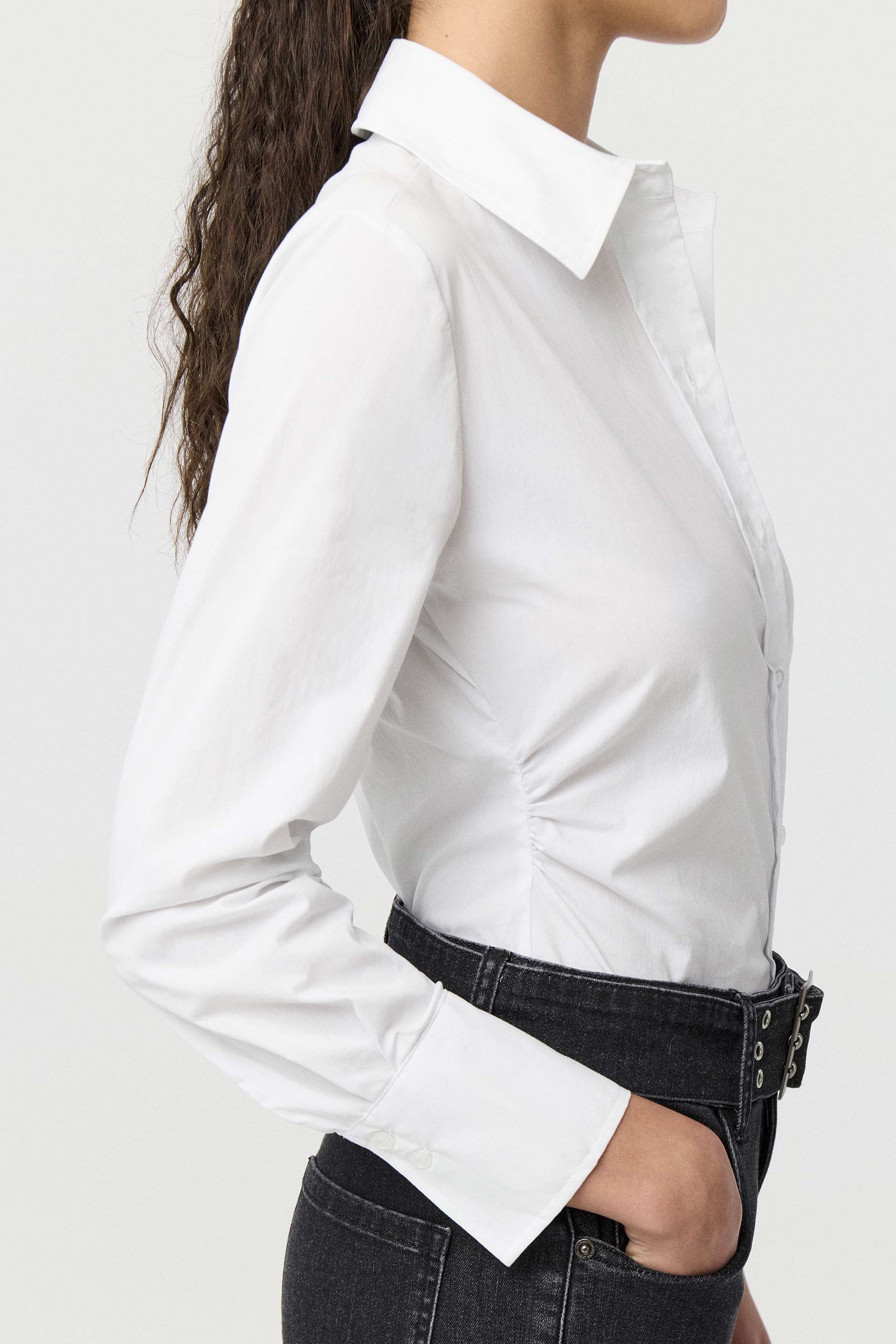 Camisa de poplín elastizado de calce al cuerpo. Mangas largas con puño alto, cuello camisa clásico con botones a tono y frunces laterales que realzan la cintura. Un básico práctico, actual y siempre vigente: la camisa que nunca falla.