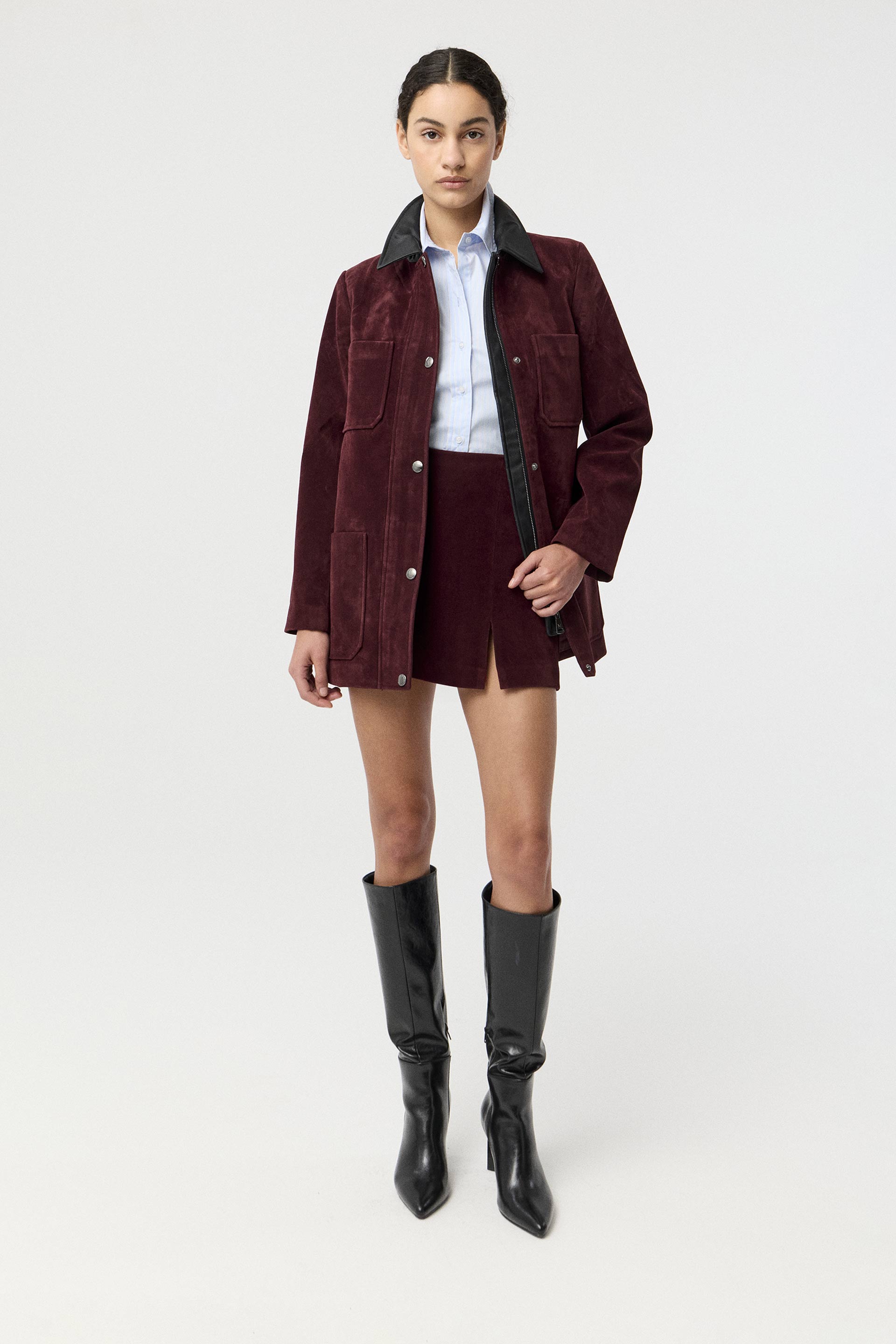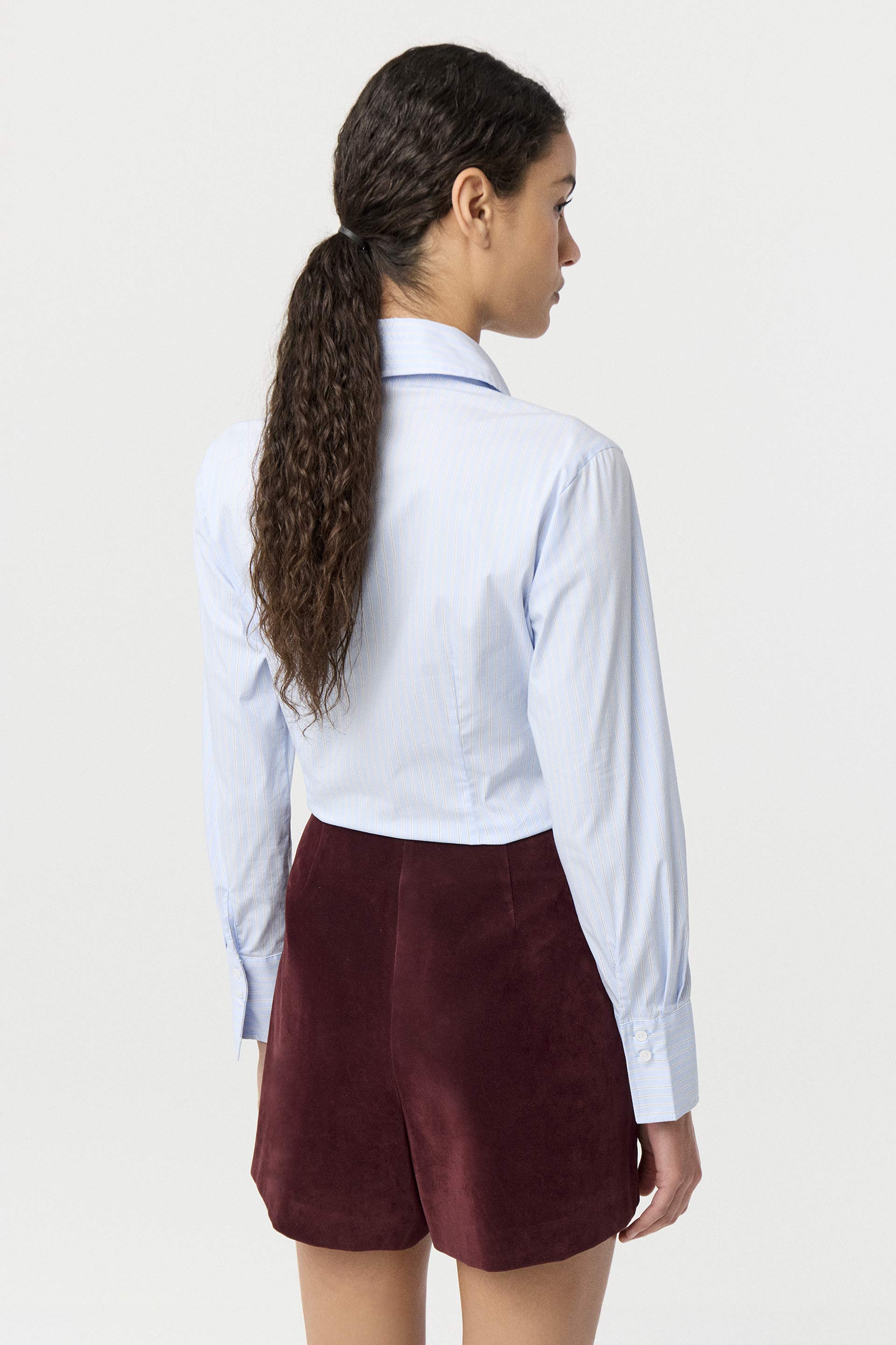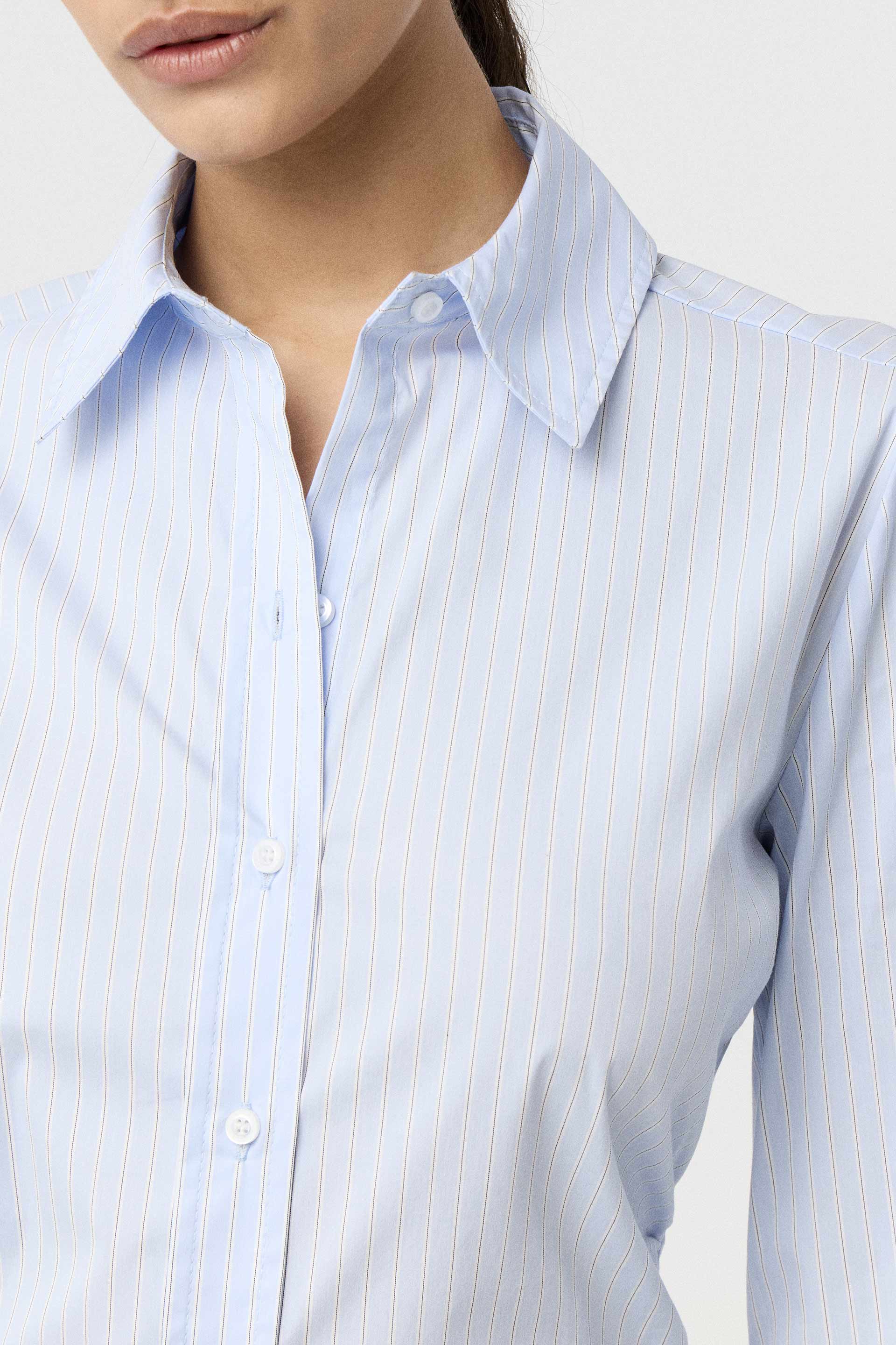 Camisa de poplín elastizado de calce al cuerpo. Mangas largas con puño alto, cuello camisa clásico con botones a tono y frunces laterales que realzan la cintura. Un básico práctico, actual y siempre vigente: la camisa que nunca falla.