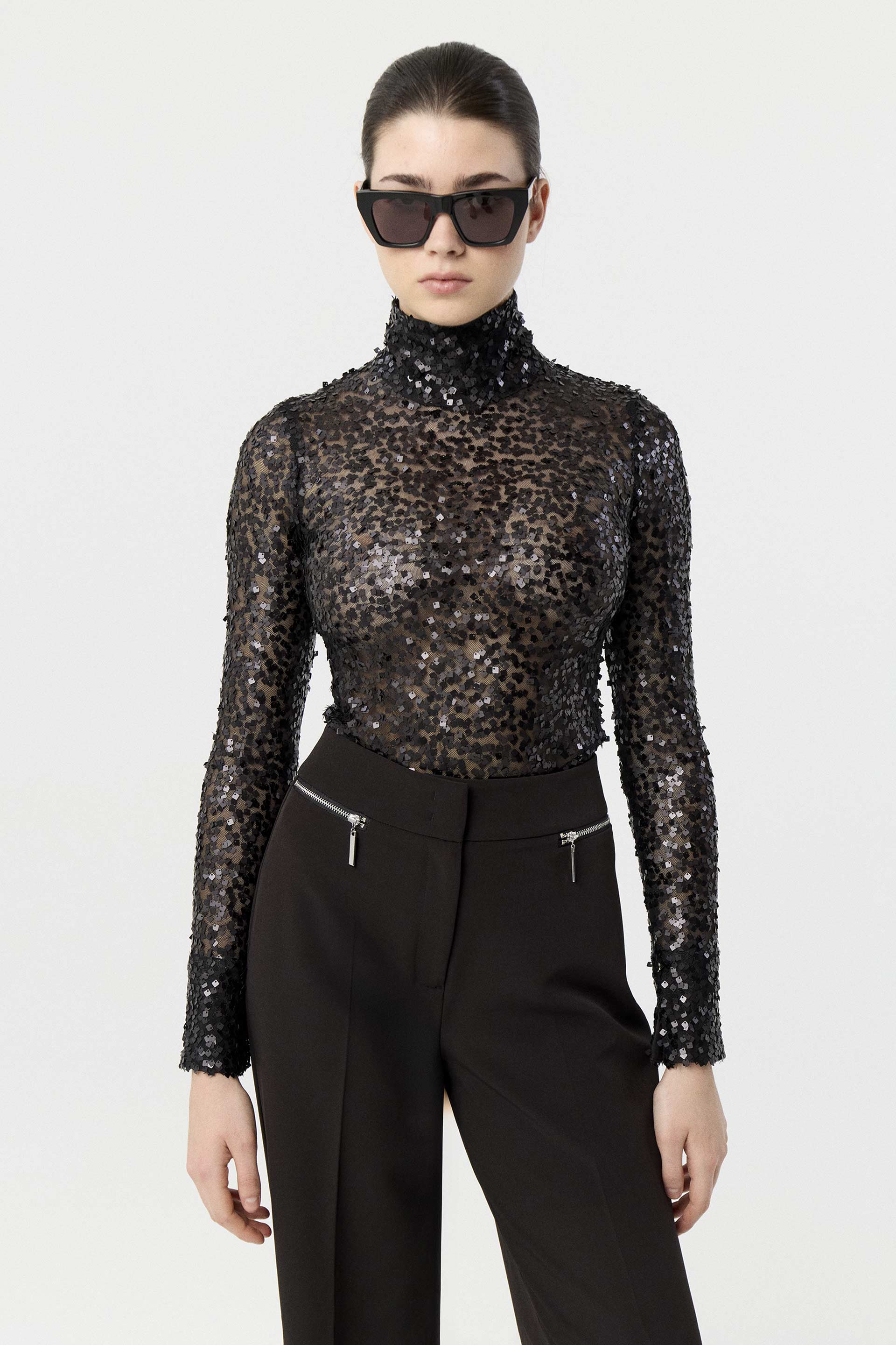 Polera de lentejuelas con base elastizada y calce anatómico. Mangas largas con puños y cuello alto. Brillá sin pedir permiso: la prenda perfecta para un look icónico y con actitud.