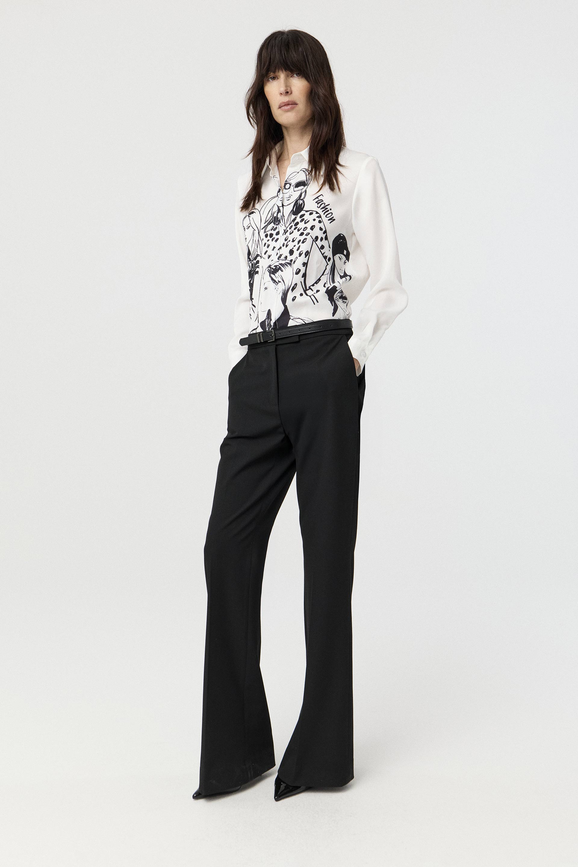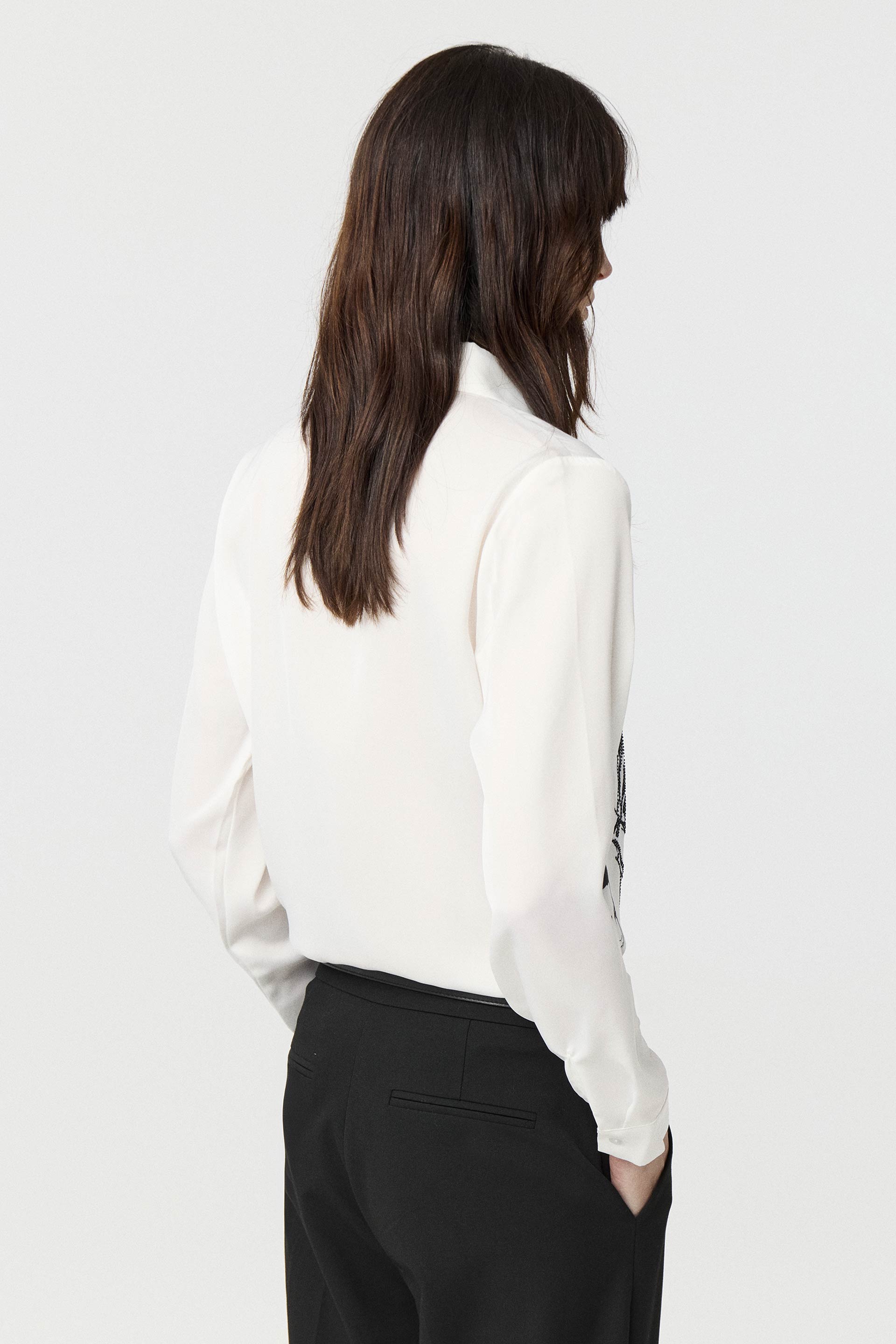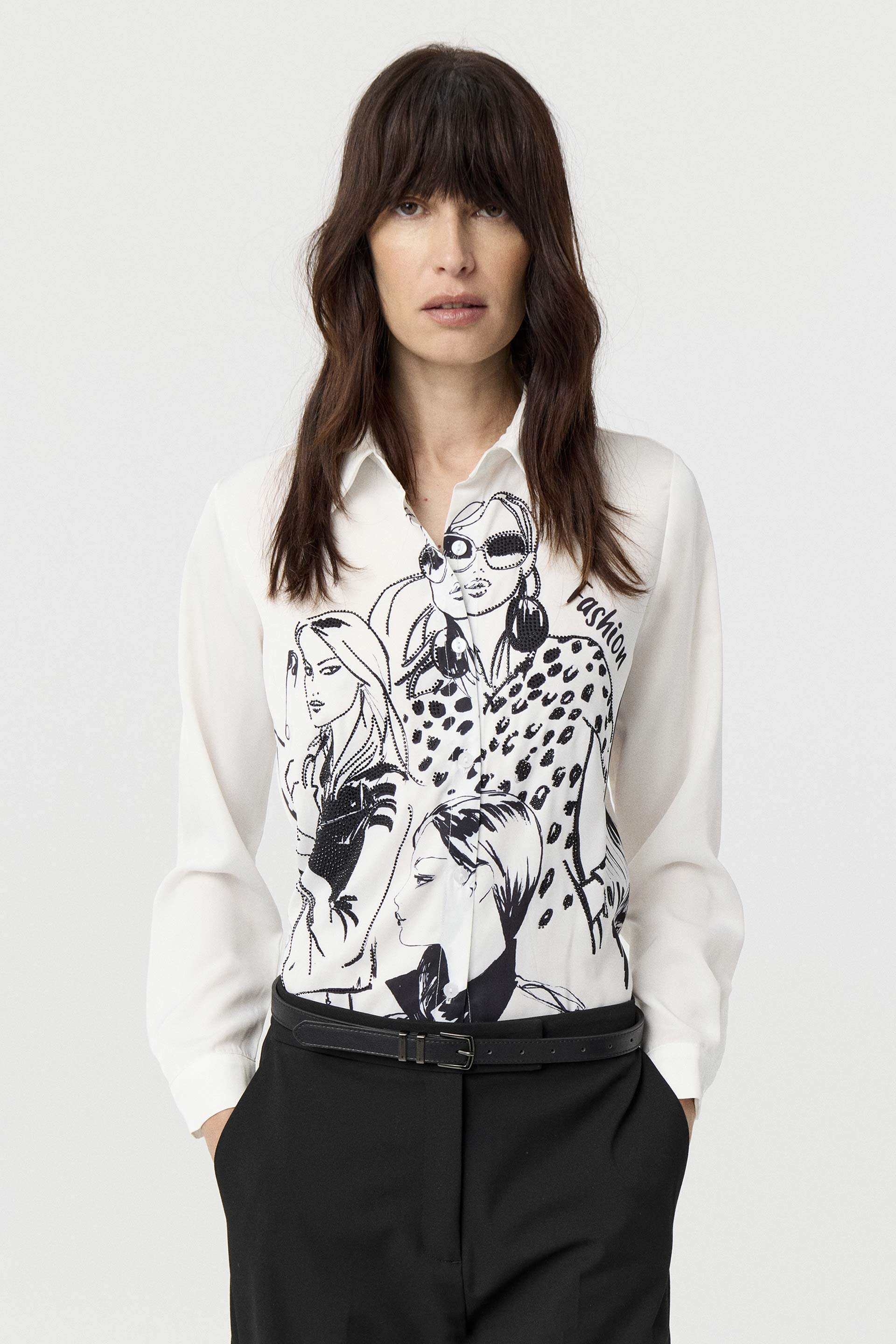 Camisa de satén opaco con estampa central, de calce relajado. Mangas largas, cuello camisa clásico y maxi print con cristales termo fusionados. Un ítem único para quienes buscan un look moderno y descontracturado.