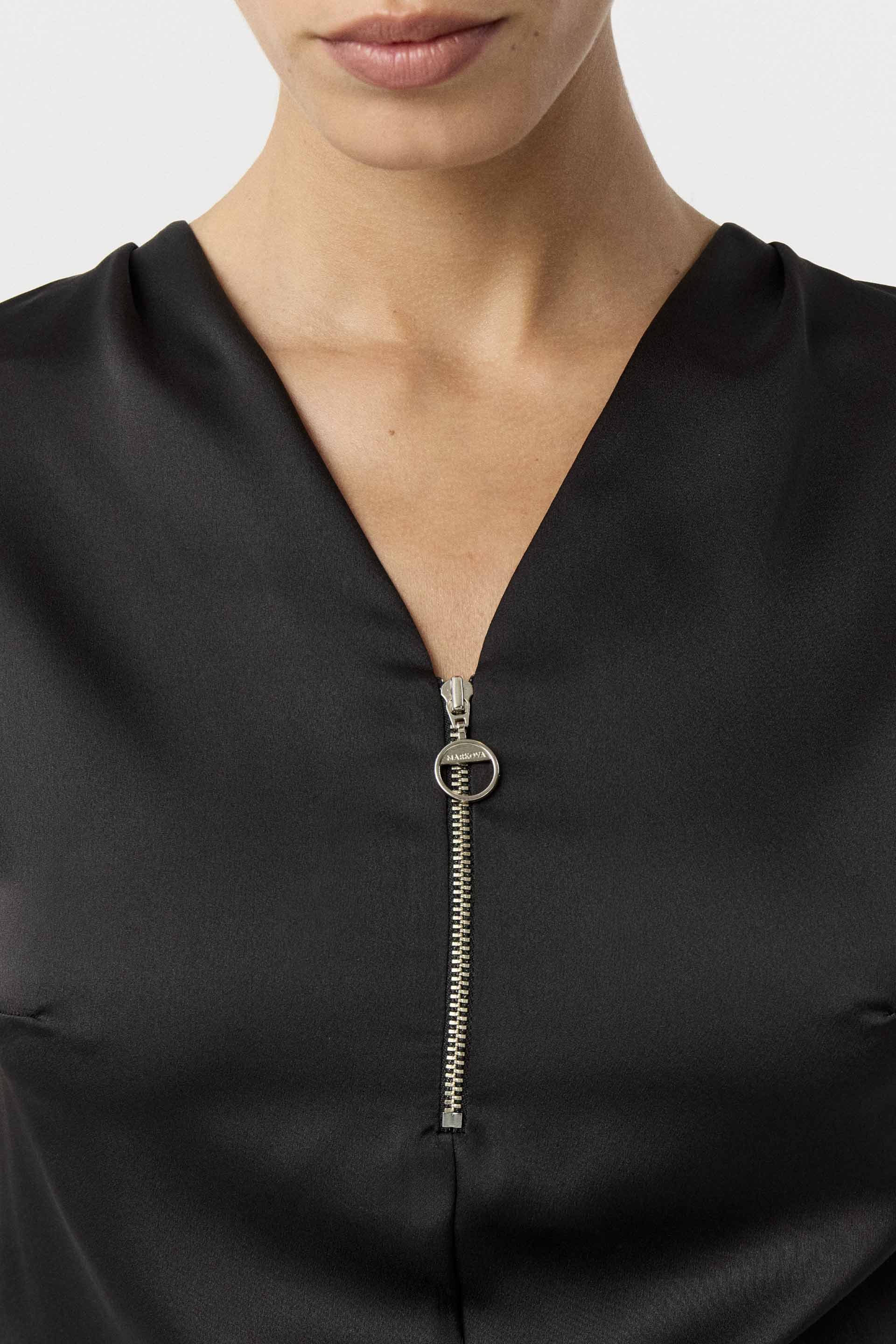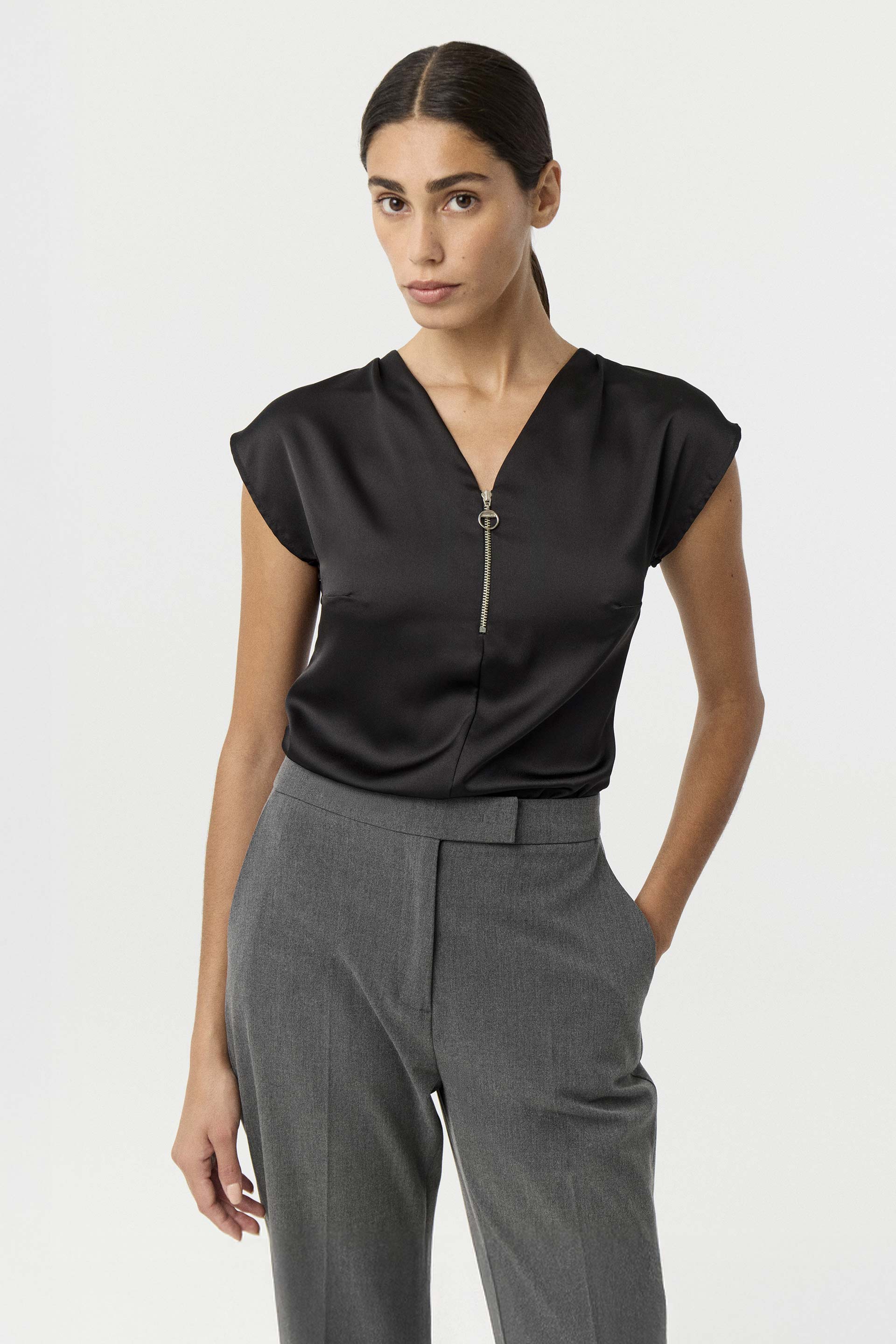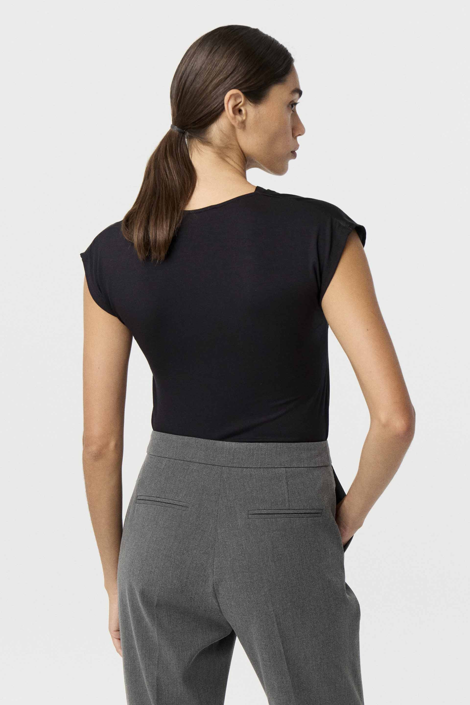 Remera de sedita con combinación de viscosa elastizada a tono en la espalda. De calce relajado, con escote en V y cierre metálico personalizado, y hombros caídos que le dan un toque descontracturado. Ideal para estar cómoda sin resignar un look formal y actual.