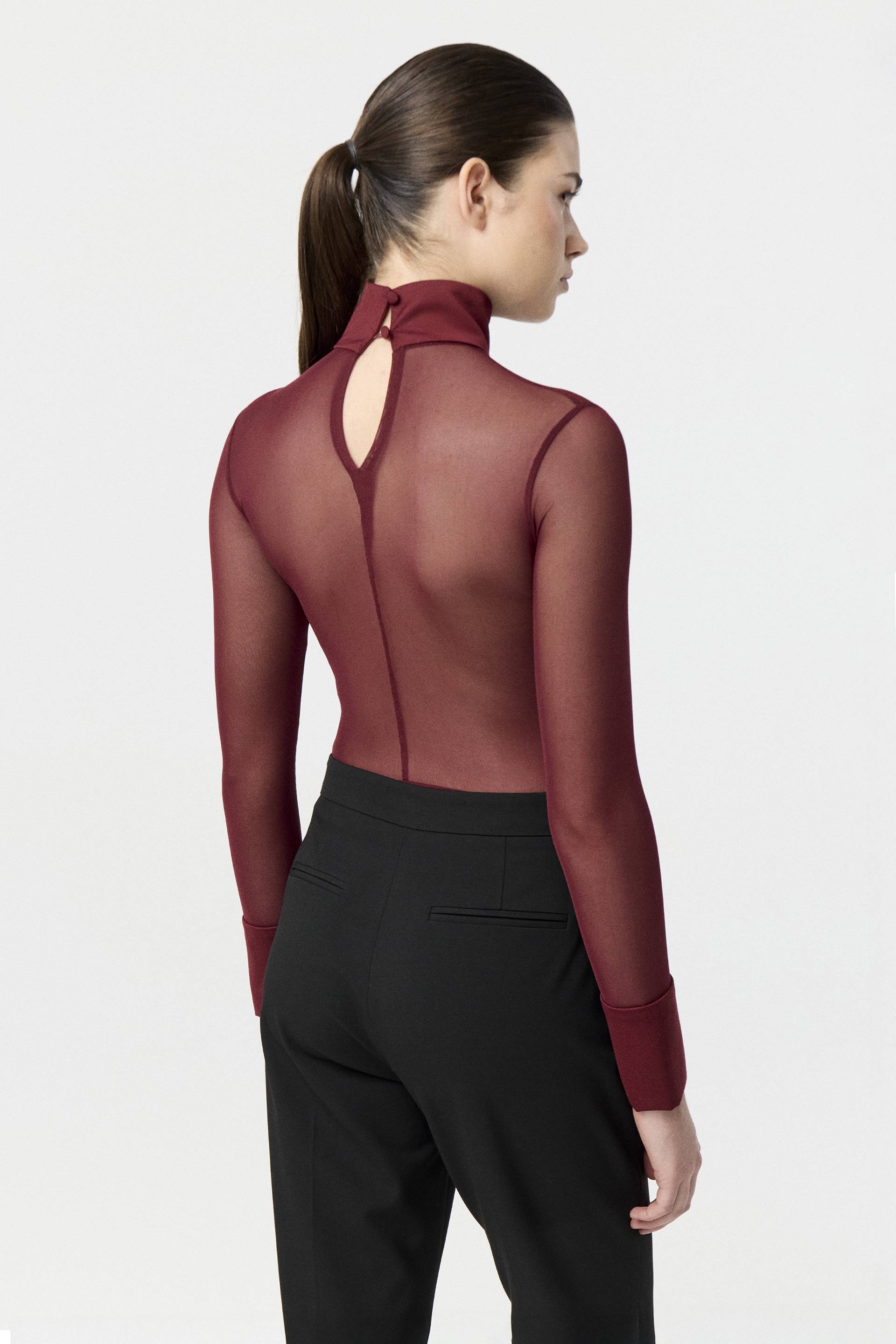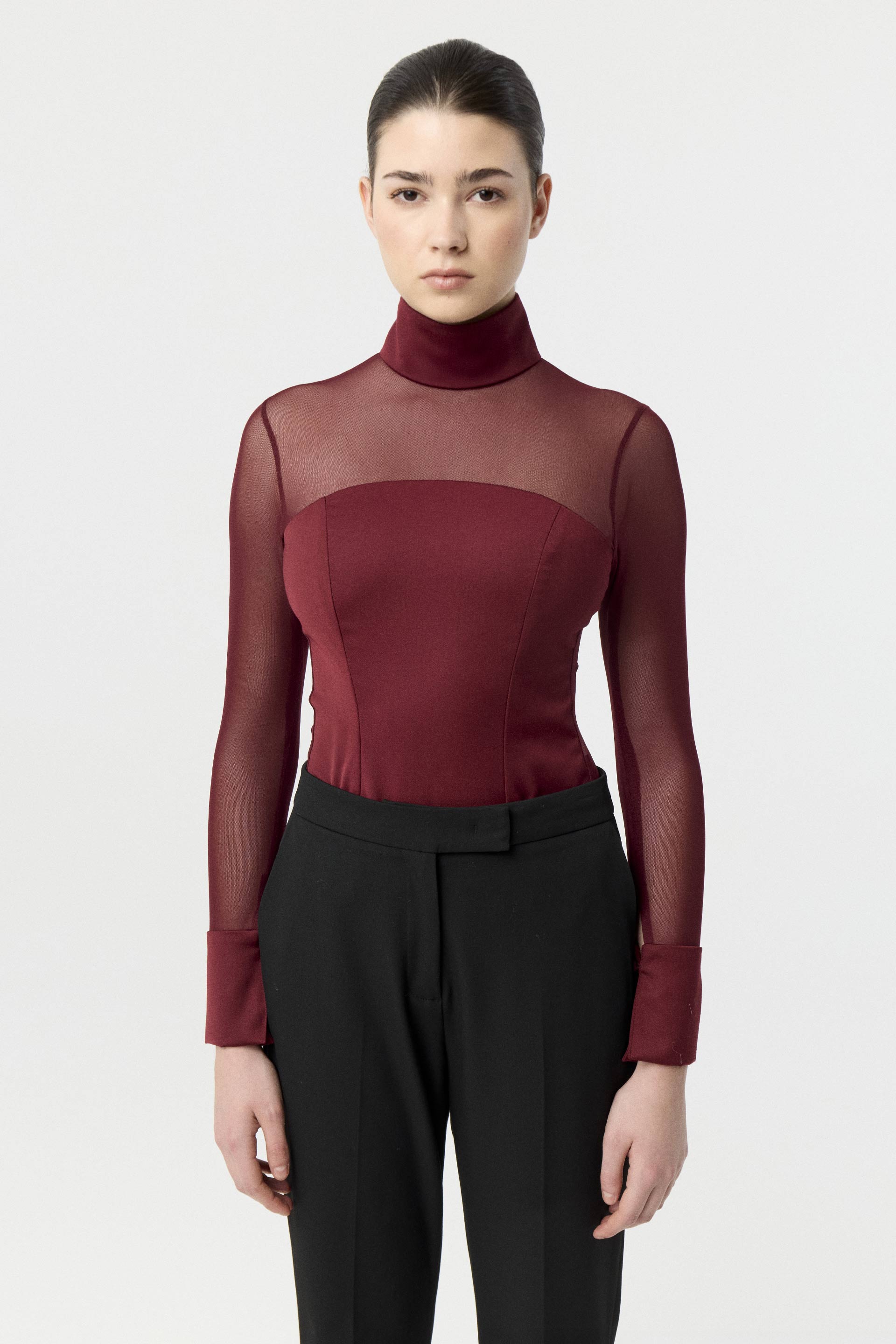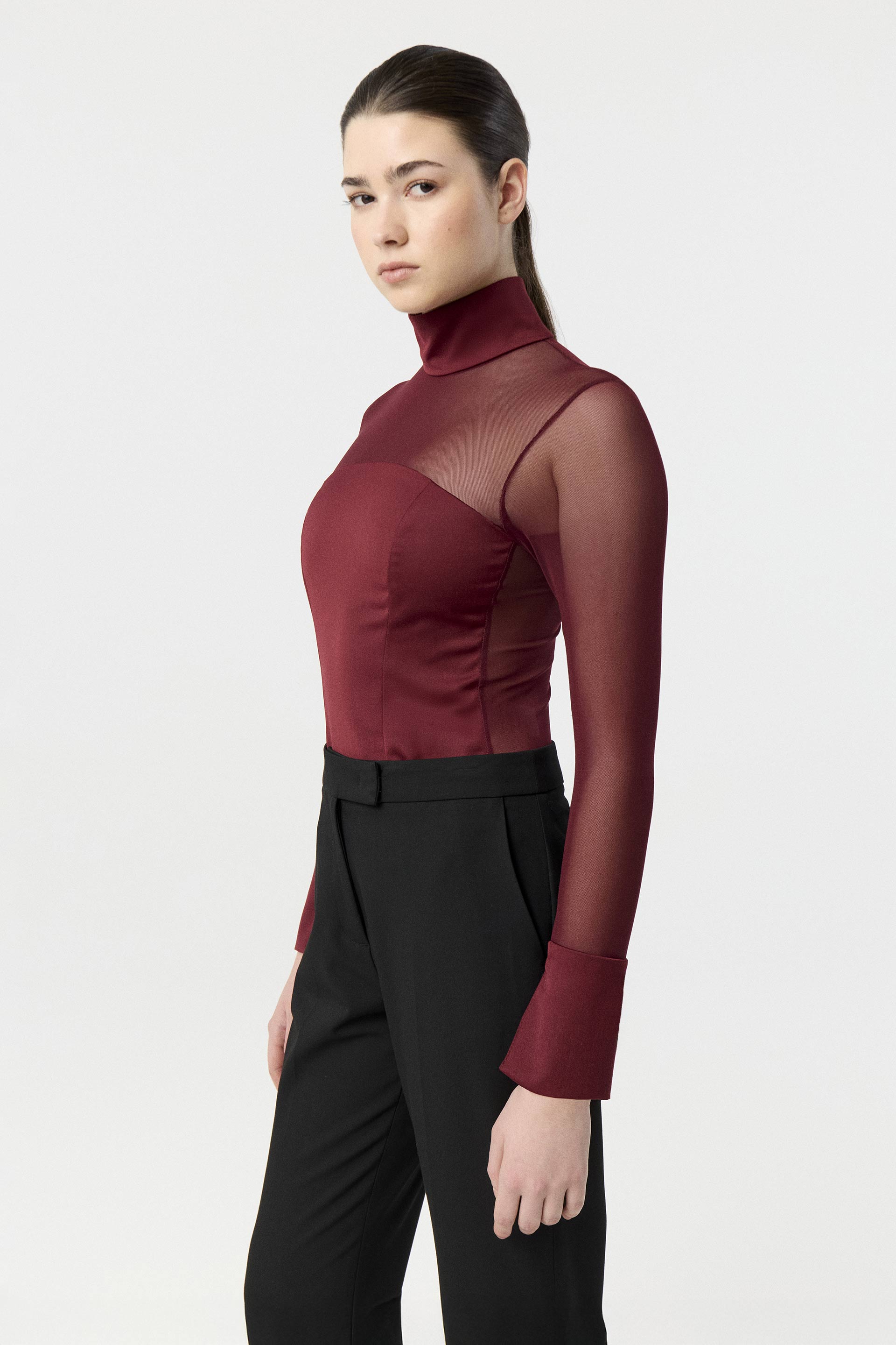 Remera de sastrería liviana con combinación de micro tul a tono en mangas y canesú delantero y espalda. De calce anatómico, cuello alto, corte tipo strapless con pinzas de entalle y mangas largas con puños largos. Un ítem sofisticado para quienes buscan estar elegantes y a la moda en cualquier situación.