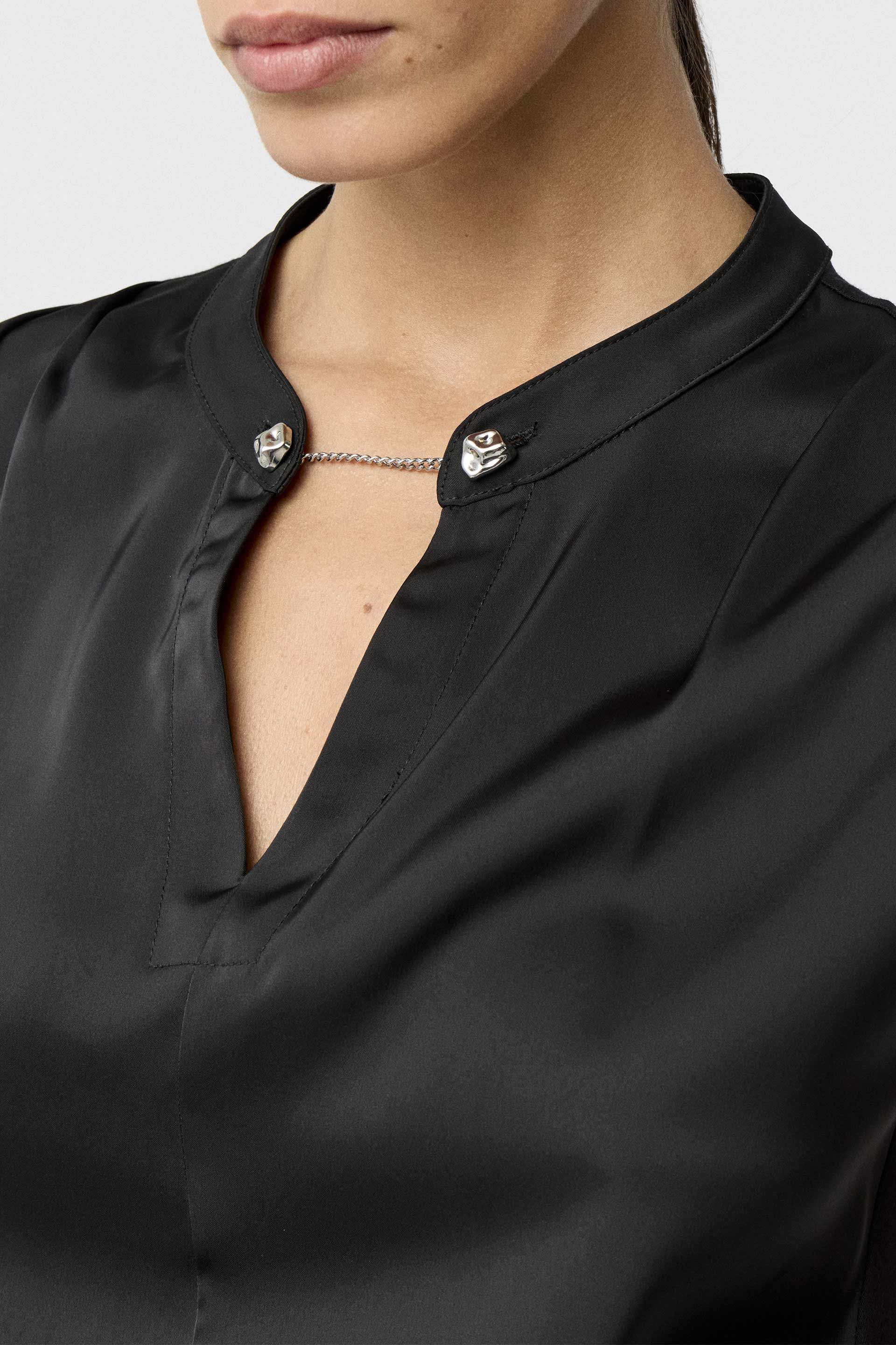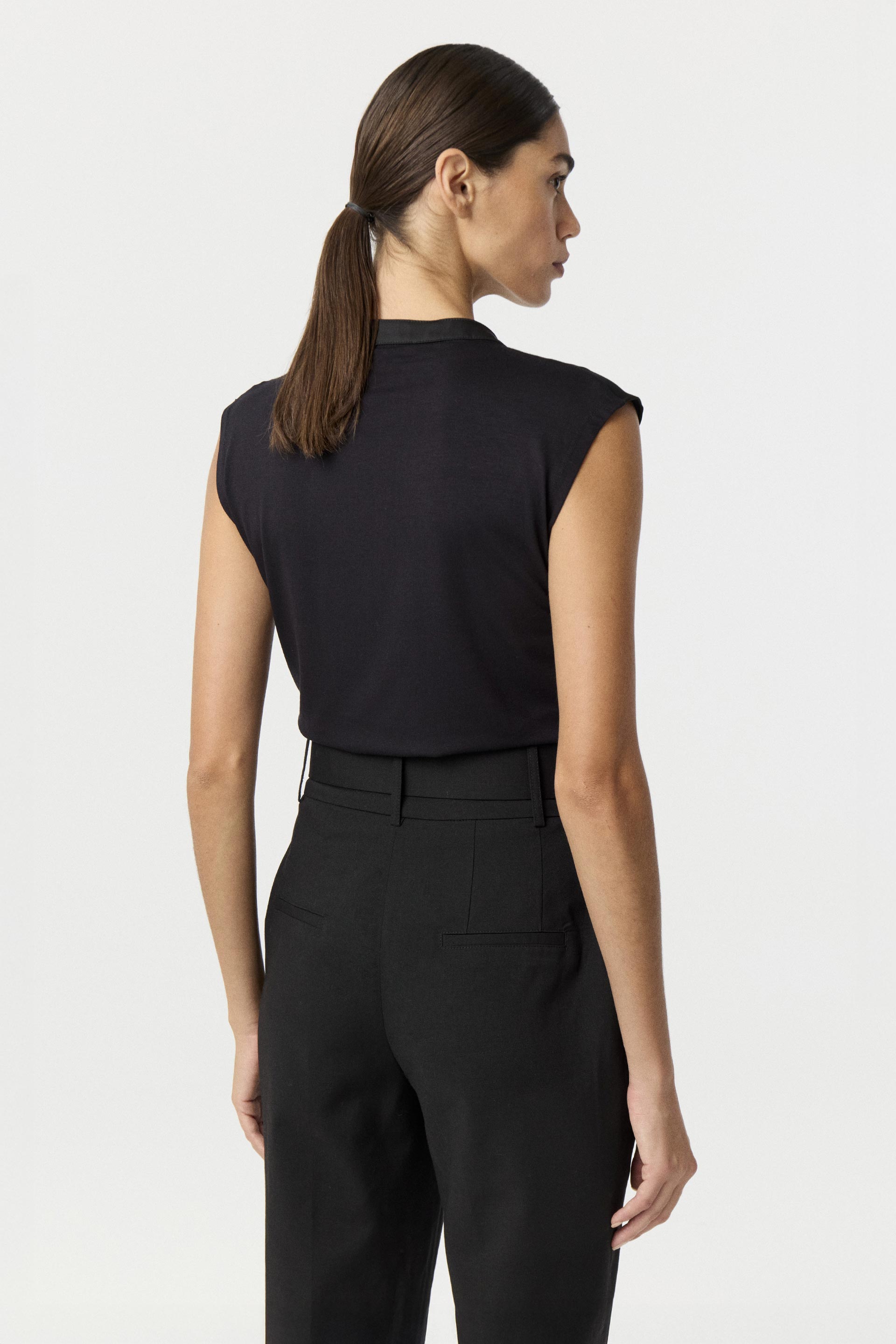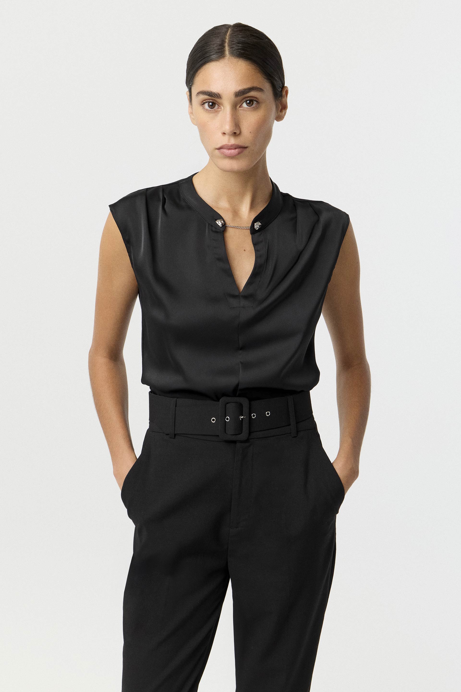 Remera de satén opaco combinada con viscosa elastizada premium en espalda y cintura. Calce relajado, hombros caídos y escote a la base con chapón metálico y gota. Posee doble tabla en hombros y cintura anatómica, ideal para usar con tiros altos por adentro del pantalón. Perfecta para la oficina.