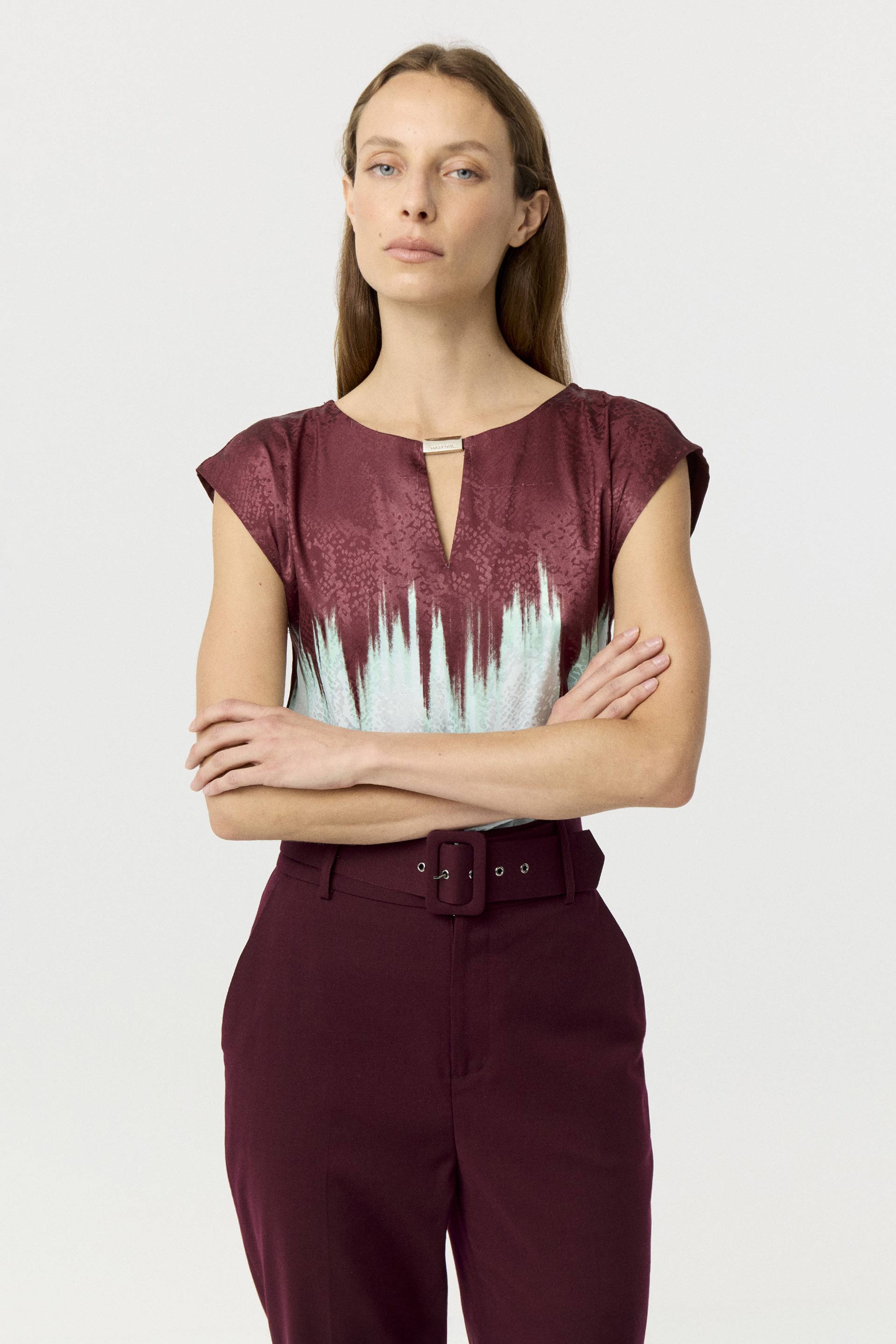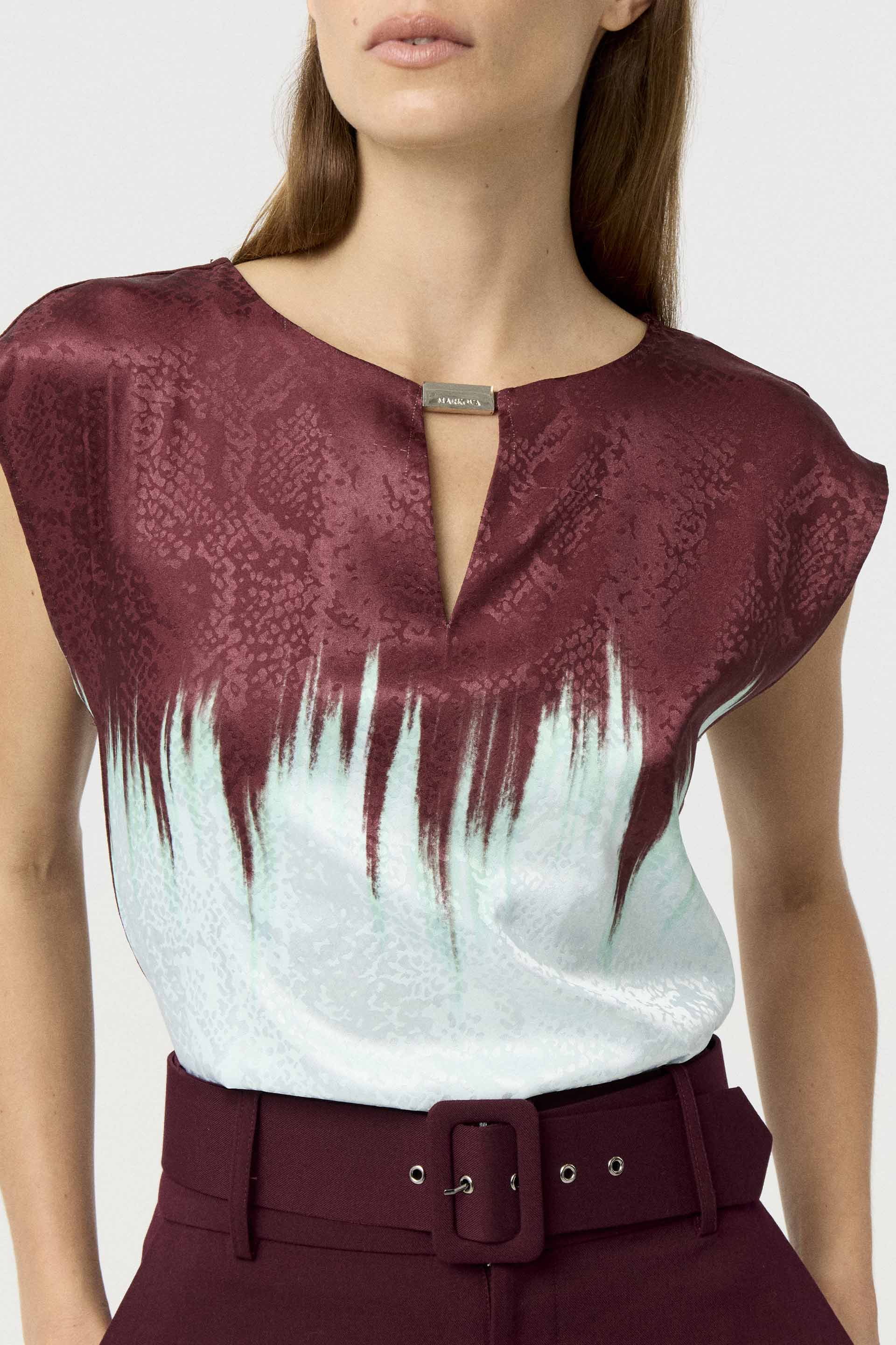 Remera de sedita jacquad estampado con combinación de viscosa elastizada a tono en espalda. Calce relajado, hombros caídos y escote redondo amplio con gota y chapón metálico personalizado MKV. Sumá un toque descontracturado y moderno a tus looks con este print exclusivo MKV.