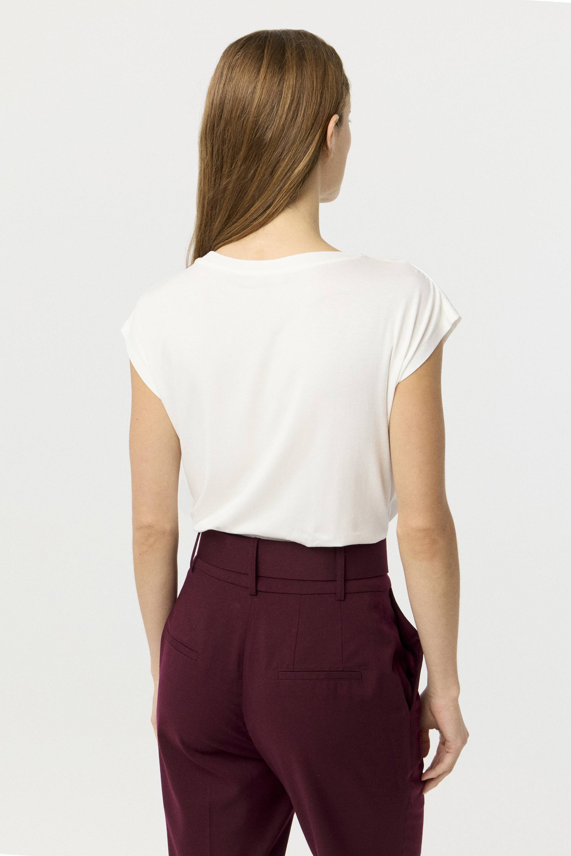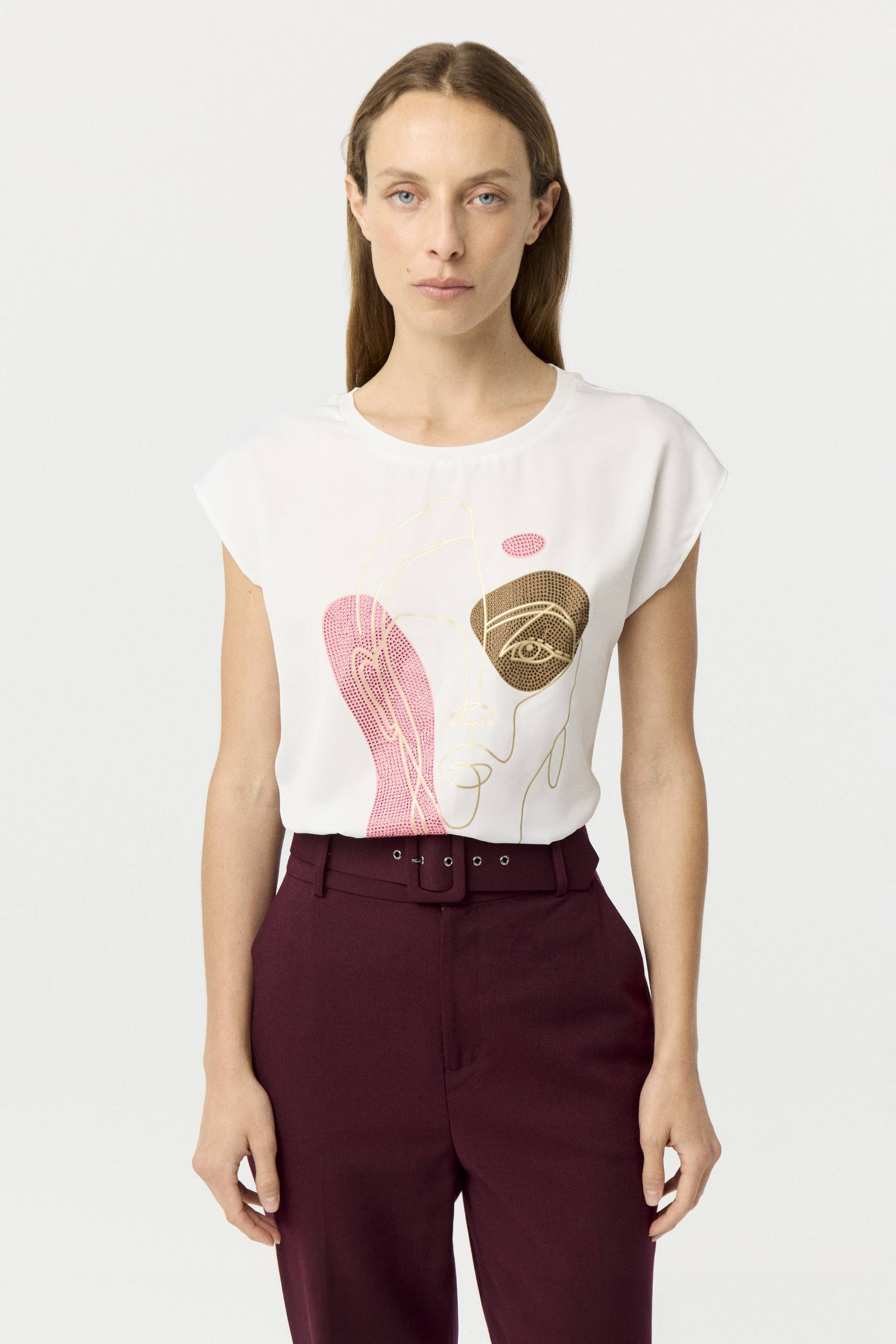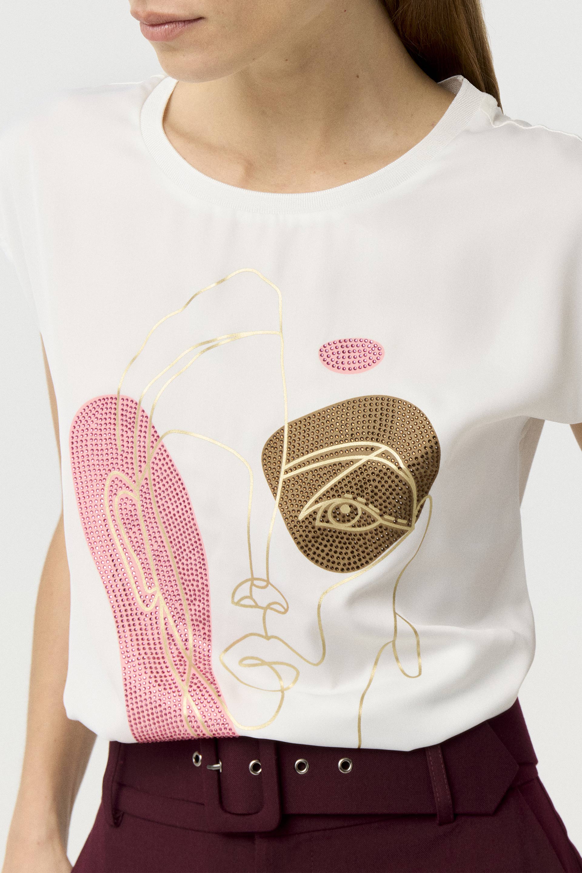 Remera de satén opaco con estampa central, con combinación de viscosa elastizada a tono en espalda. Calce relajado, hombros caídos y cuello redondo amplio tejido. Print con foil y cristales termo fusionados. Sumá un toque descontracturado y moderno a tus looks con este ítem.