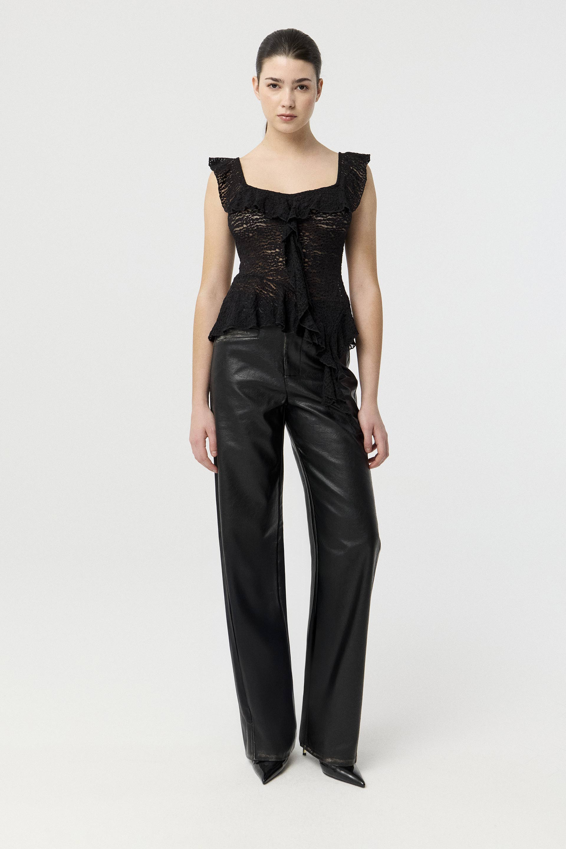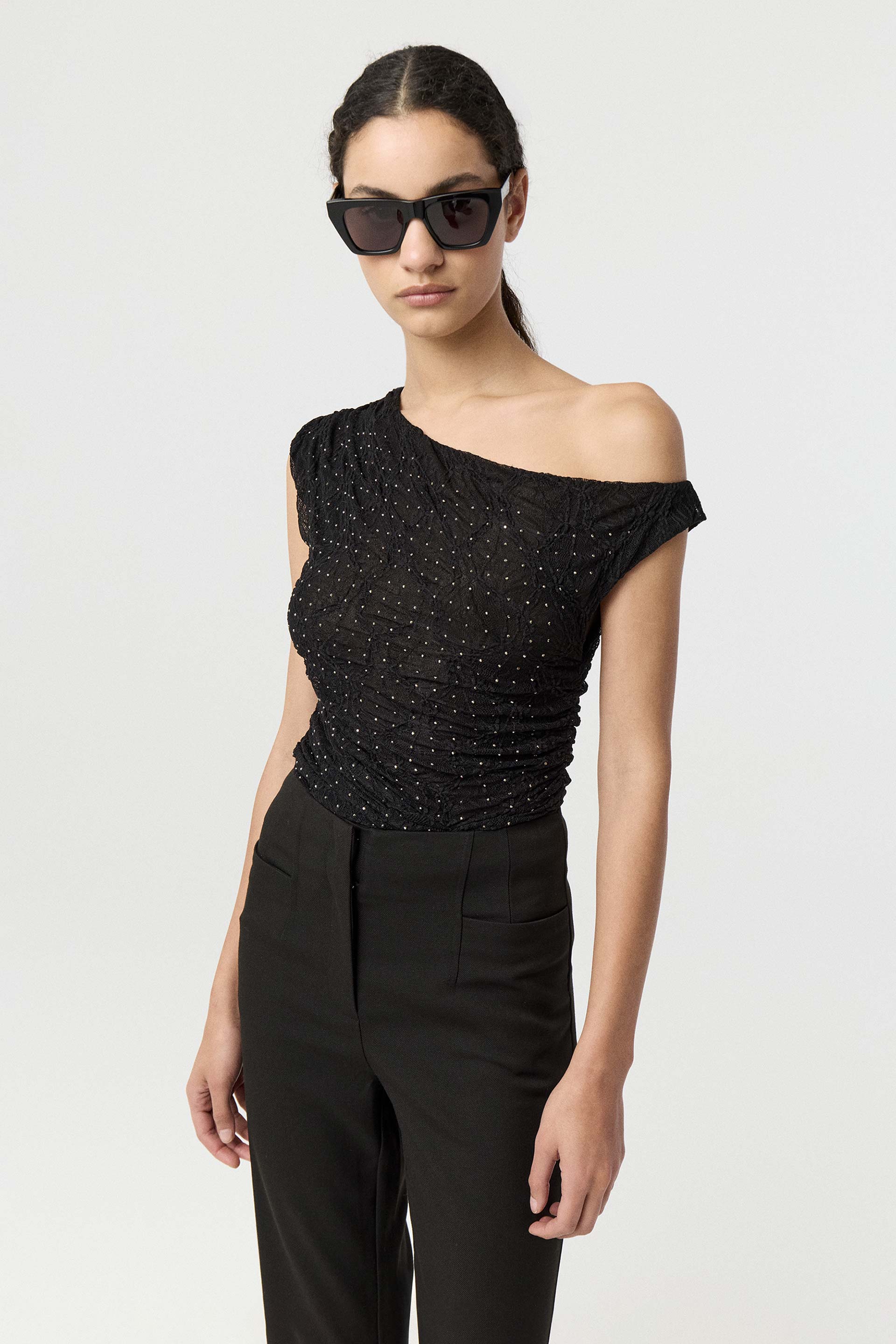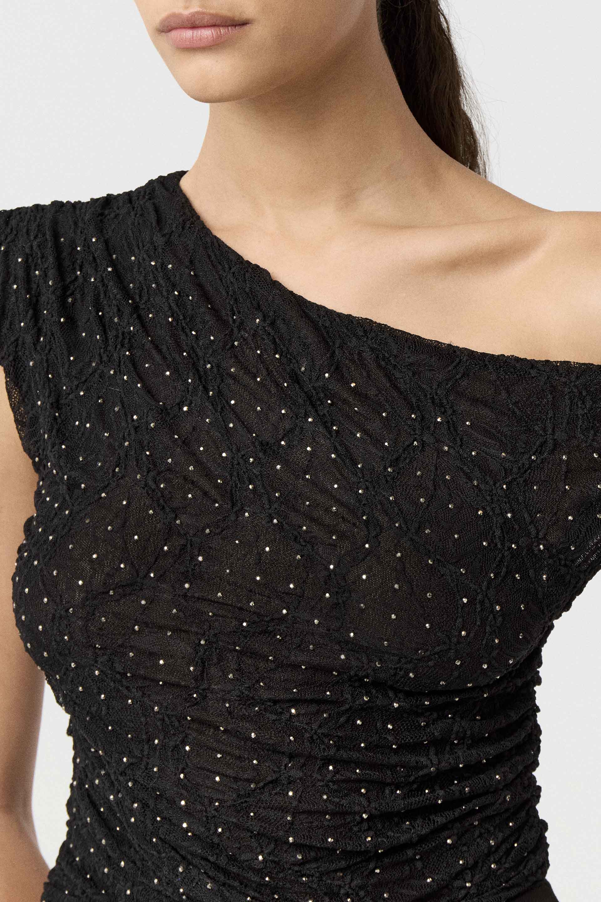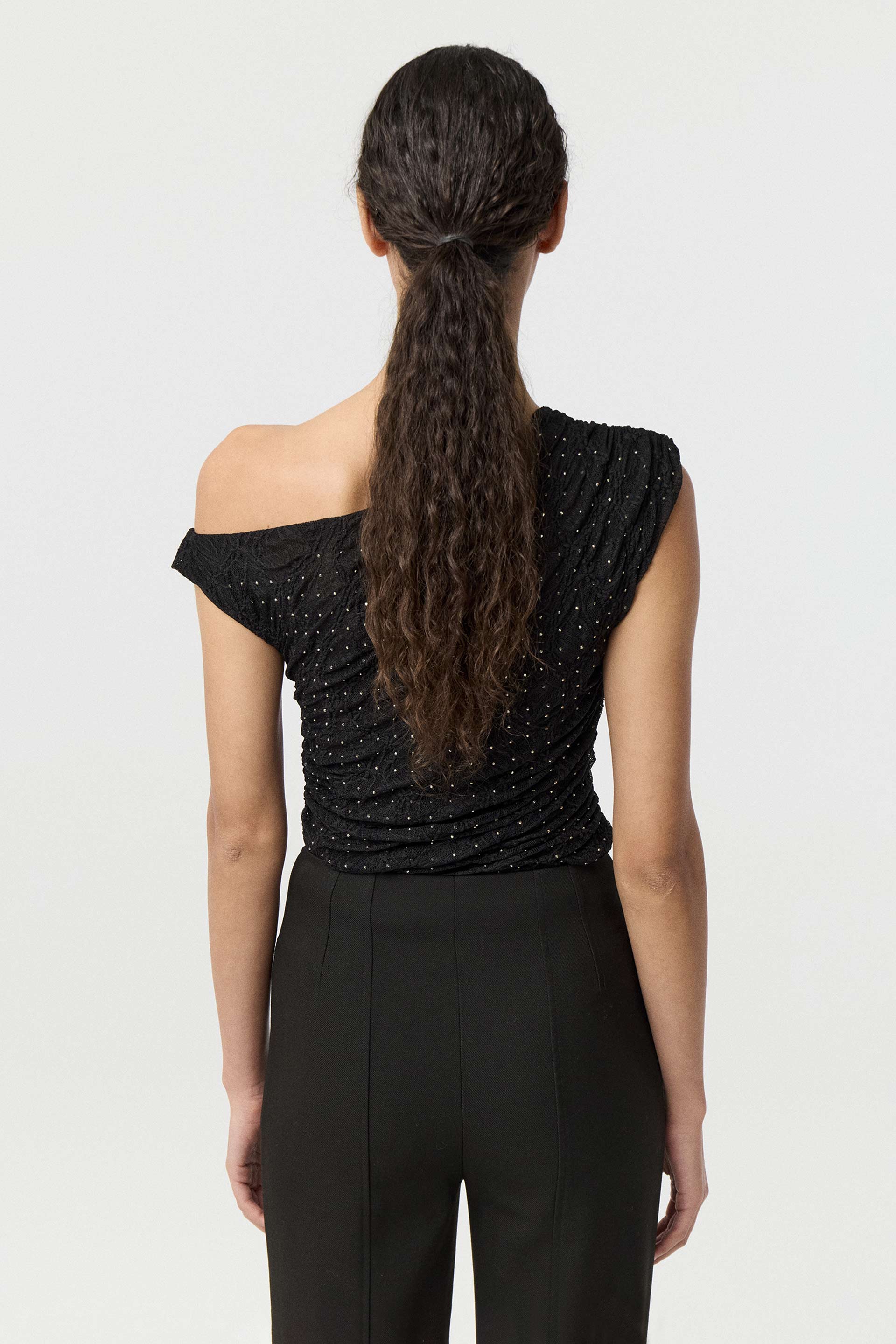 Top de encaje elastizado con cristales termo fusionados, de calce anatómico. Presenta un escote diagonal que deja un hombro al descubierto y realza la silueta. Una pieza audaz y contemporánea, perfecta para subirle el nivel a cualquier look nocturno.