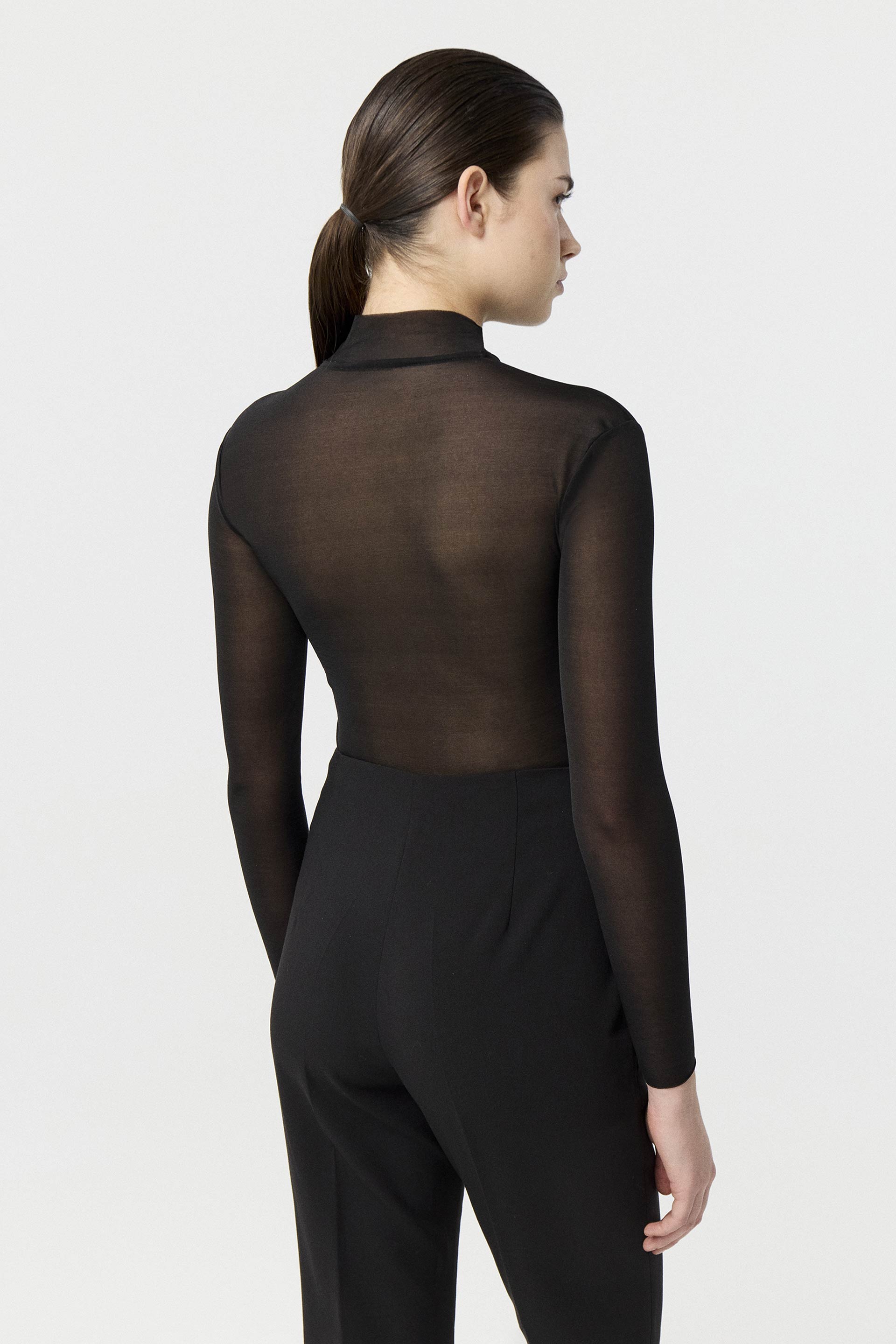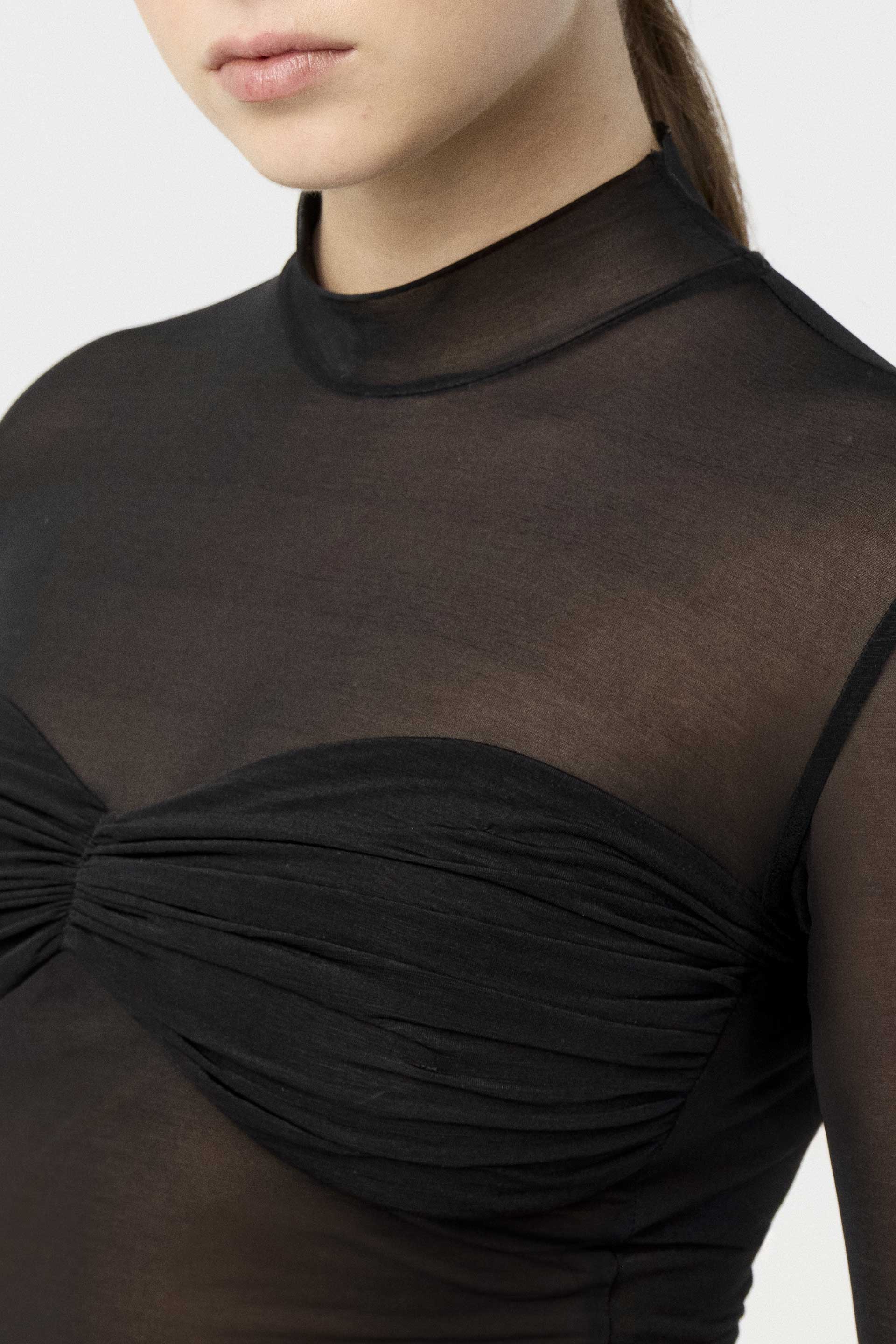 Top de organza de punto, de calce anatómico y mangas largas. Presenta cuello semipolera y un drapeado tipo corazón en el busto que realza la silueta. Una pieza tan sensual como innovadora, perfecta para sumar un toque distintivo en una salida nocturna.
