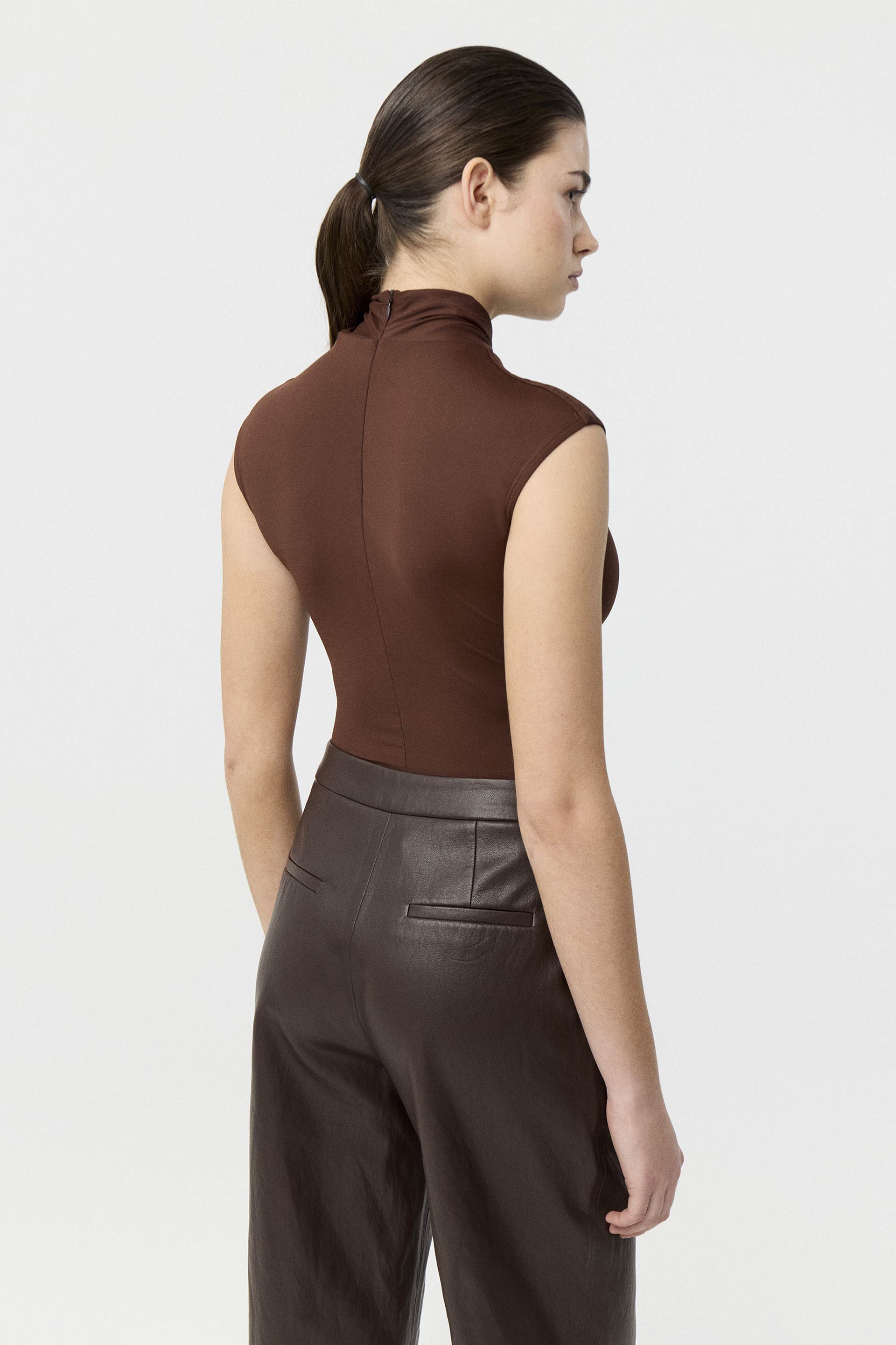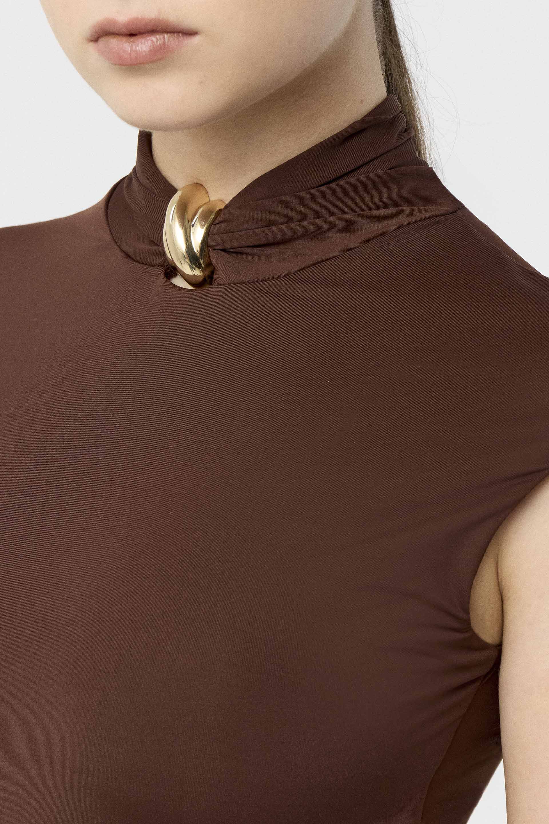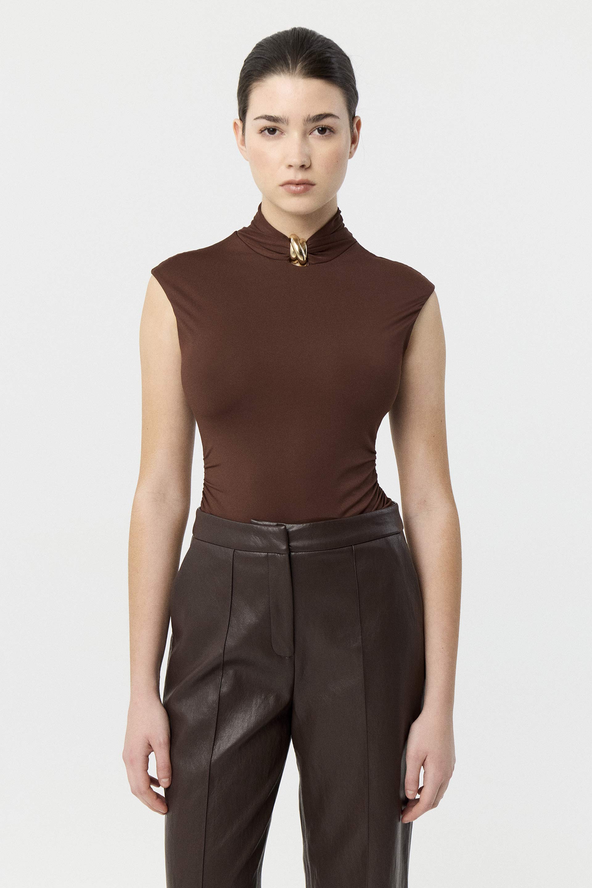 Remera de microfibra de calce anatómico y hombros caídos. Cuello semipolera con detalle de avío metálico en forma de nudo en el delantero. Frunces laterales que ciñen la cintura. Una prenda canchera y audaz, sin perder elegancia.