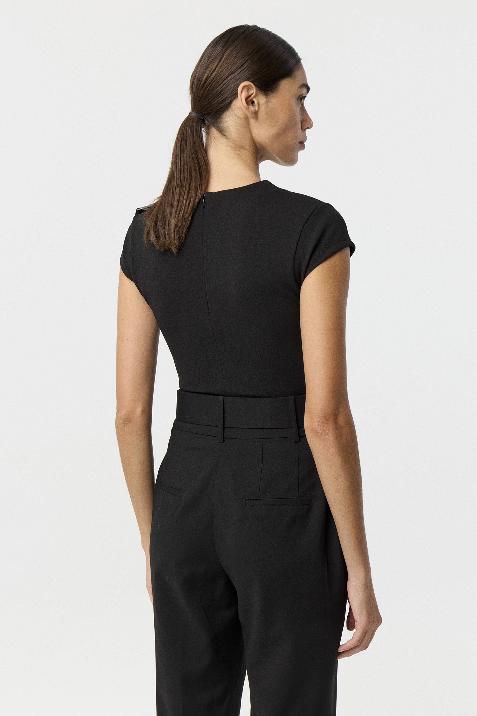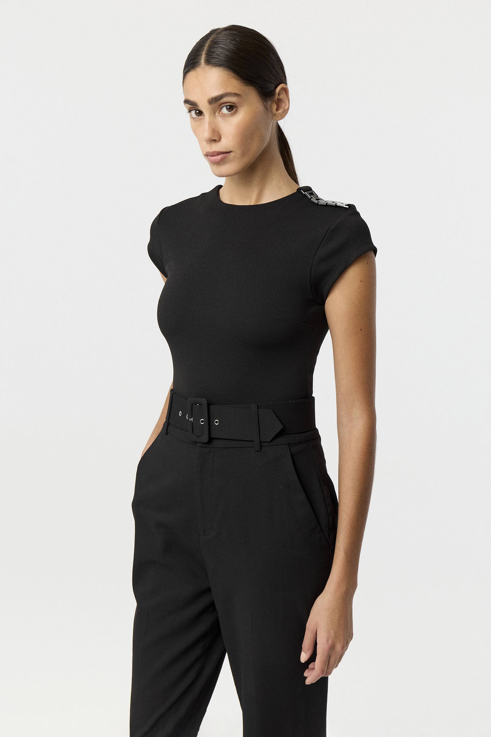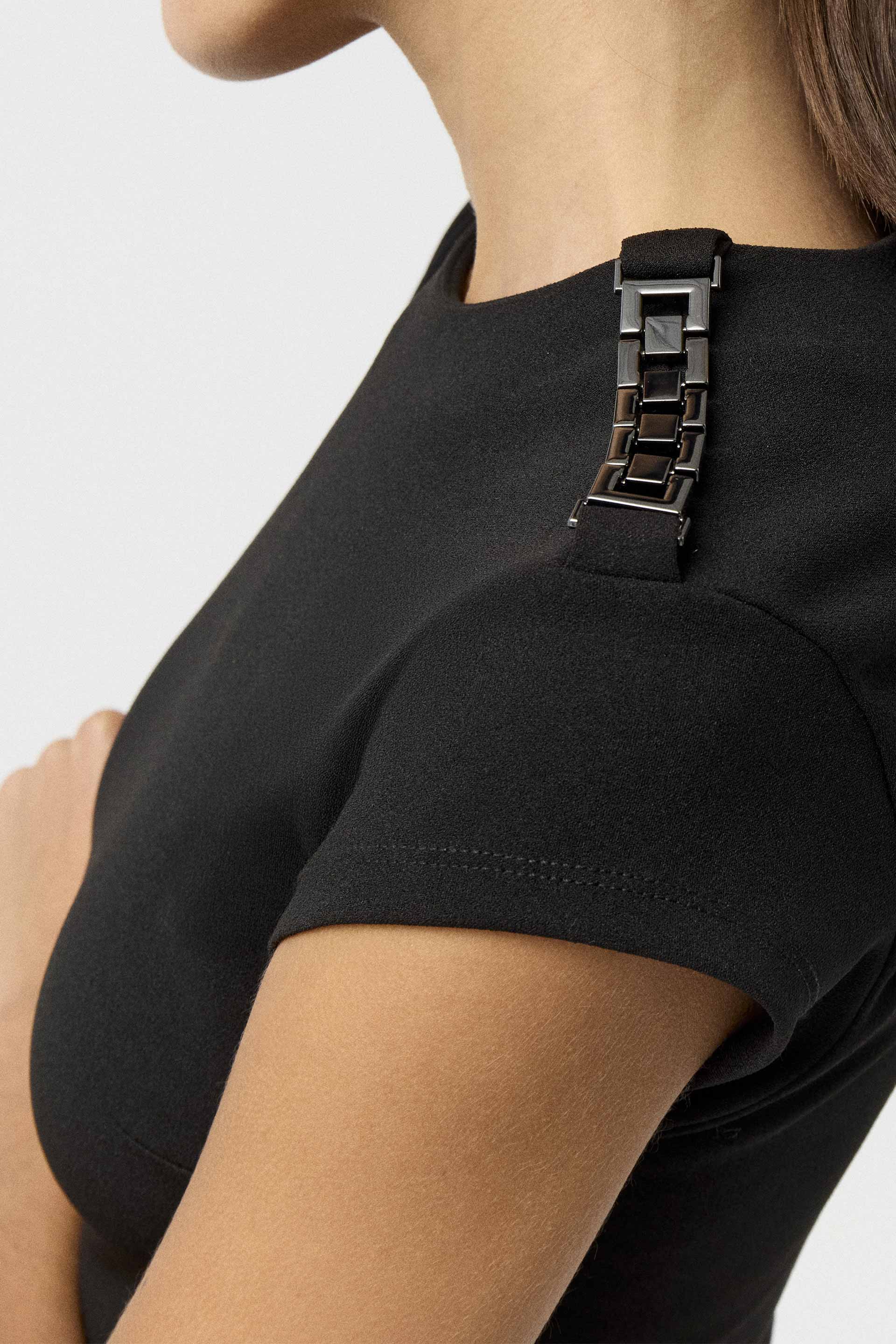 Remera de crepe elastizado, de calce al cuerpo y mangas cortas. Cuello redondo a la base, pinzas de busto que acompañan la silueta y acceso en la espalda con cierre invisible. Lleva una cadena metálica personalizada en el hombro izquierdo, un detalle que suma carácter sin perder elegancia. Un diseño versátil, listo para funcionar en cualquier ocasión.