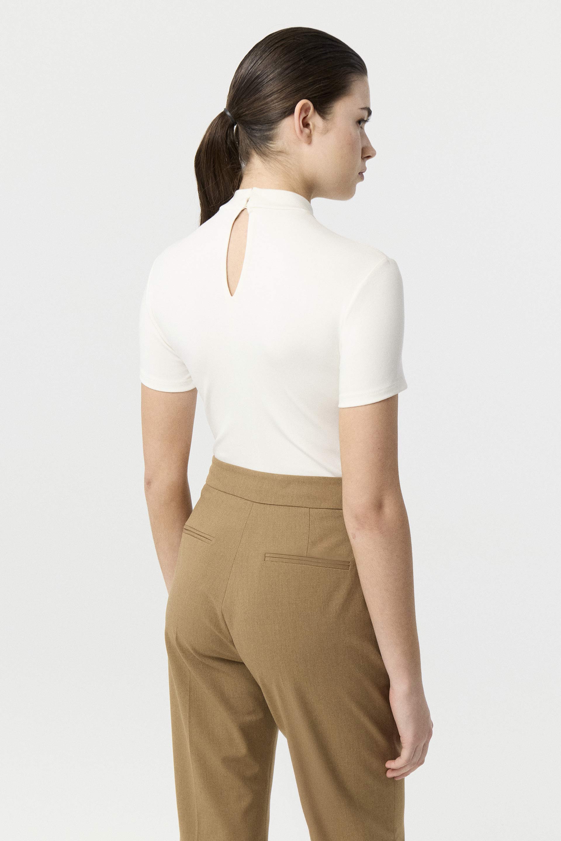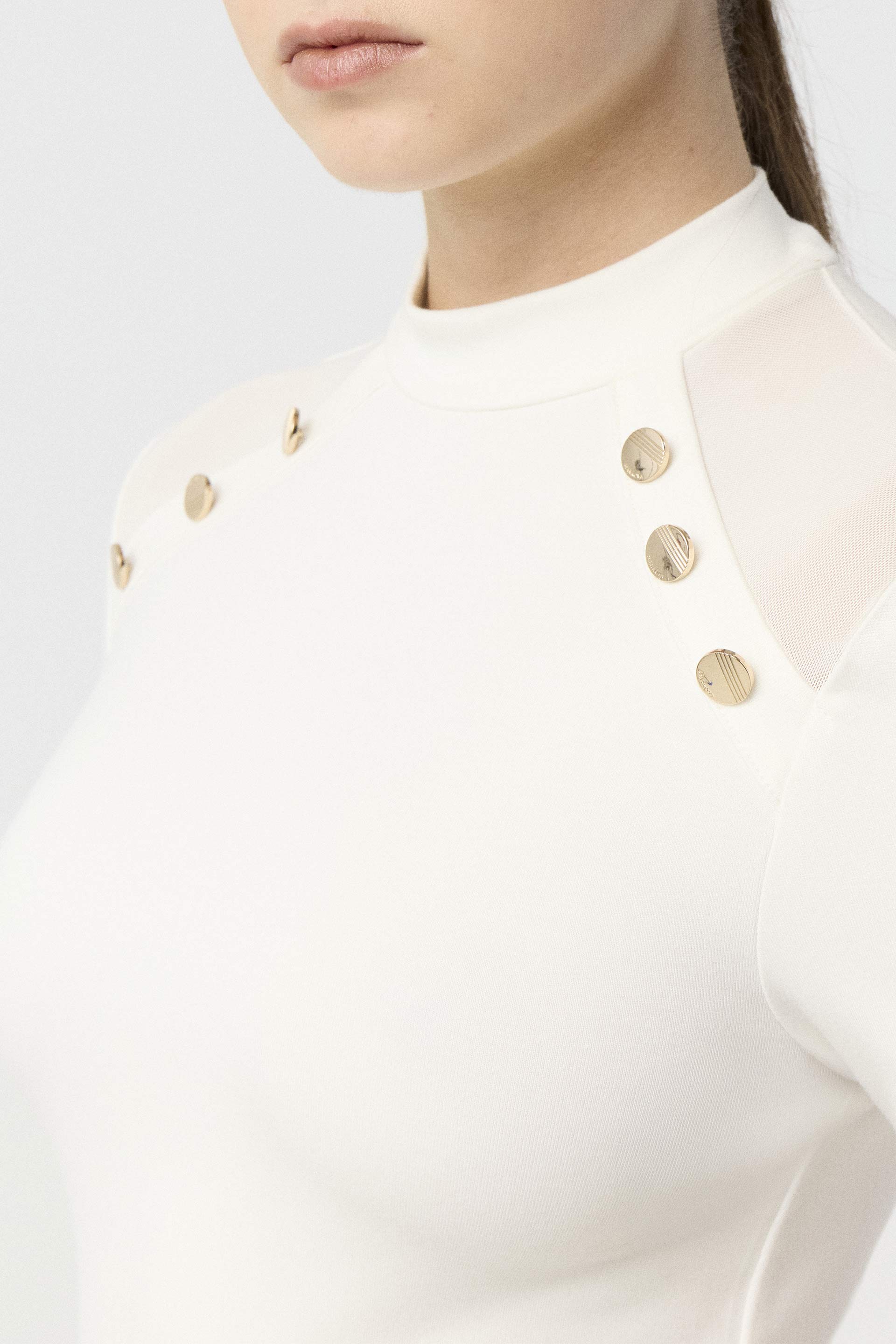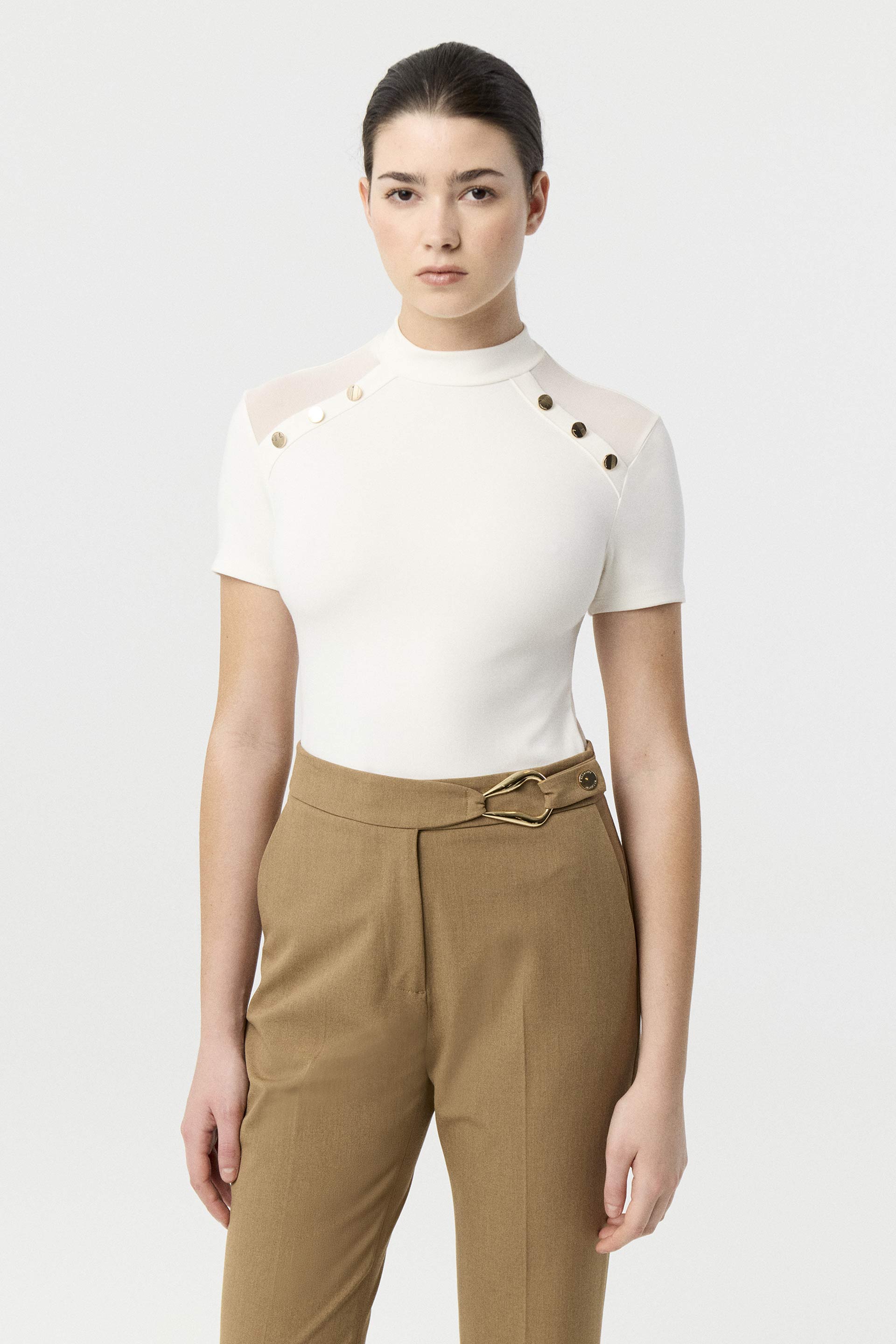 Remera de punto tramado de calce anatómico y mangas cortas. Con cuello semipolera y recorte delantero en micro tul adornado con botones metálicos redondos. Acceso mediante botones en el cuello de la espalda. Un básico con estilo, ideal para sumar actitud a tus looks.