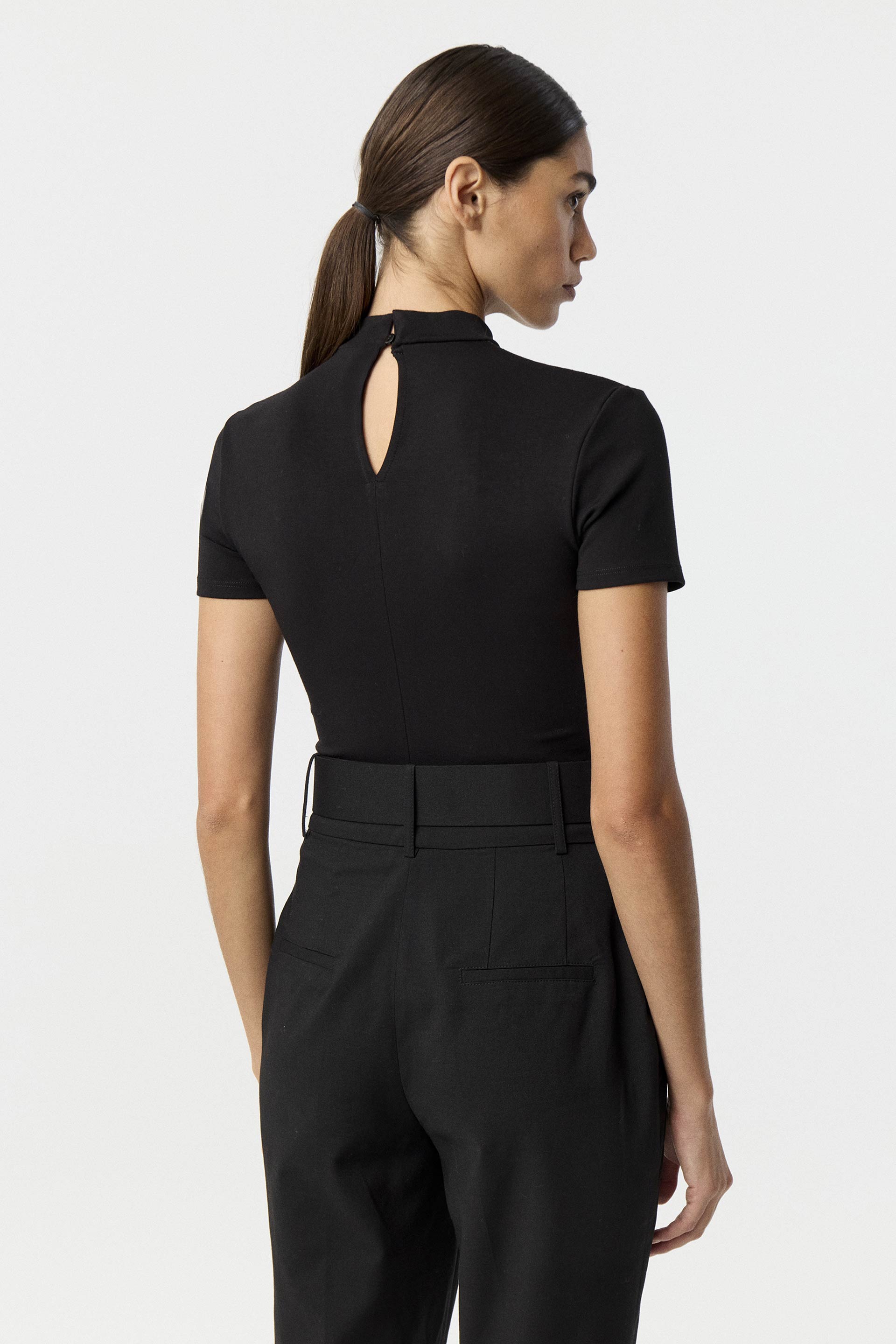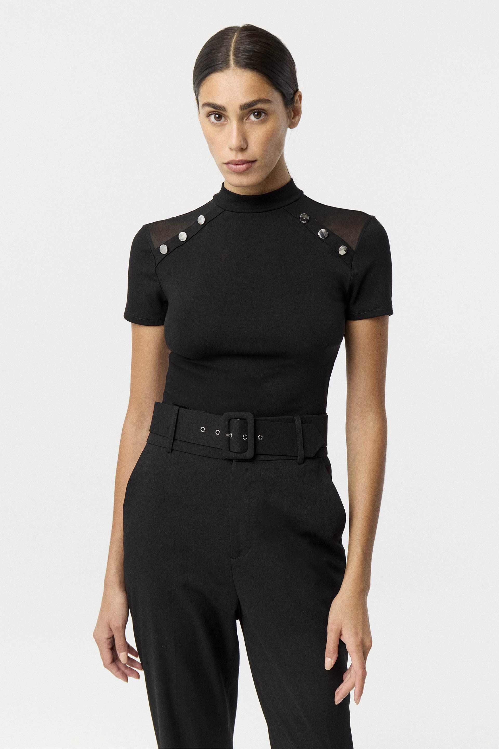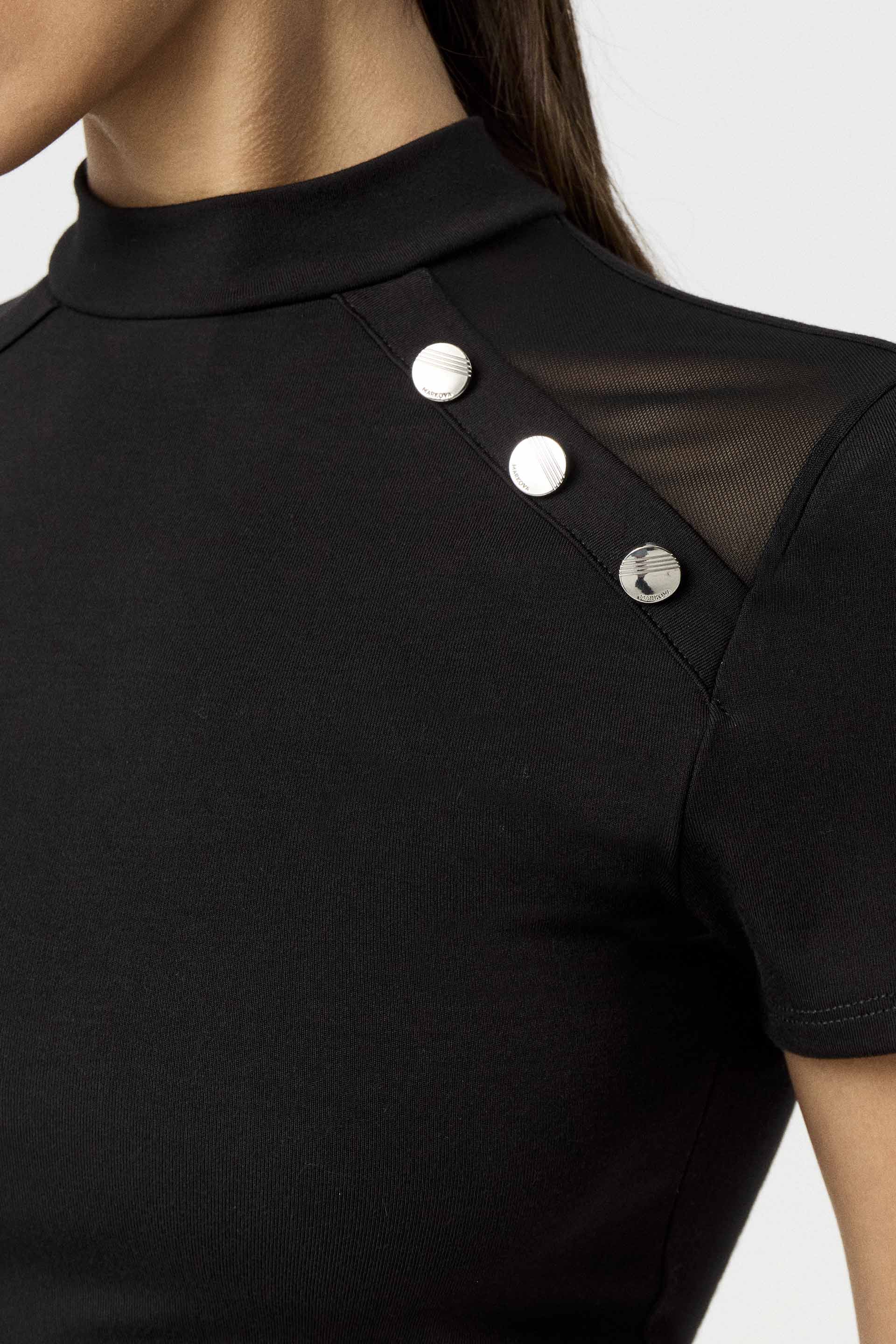 Remera de punto tramado de calce anatómico y mangas cortas. Con cuello semipolera y recorte delantero en micro tul adornado con botones metálicos redondos. Acceso mediante botones en el cuello de la espalda. Un básico con estilo, ideal para sumar actitud a tus looks.