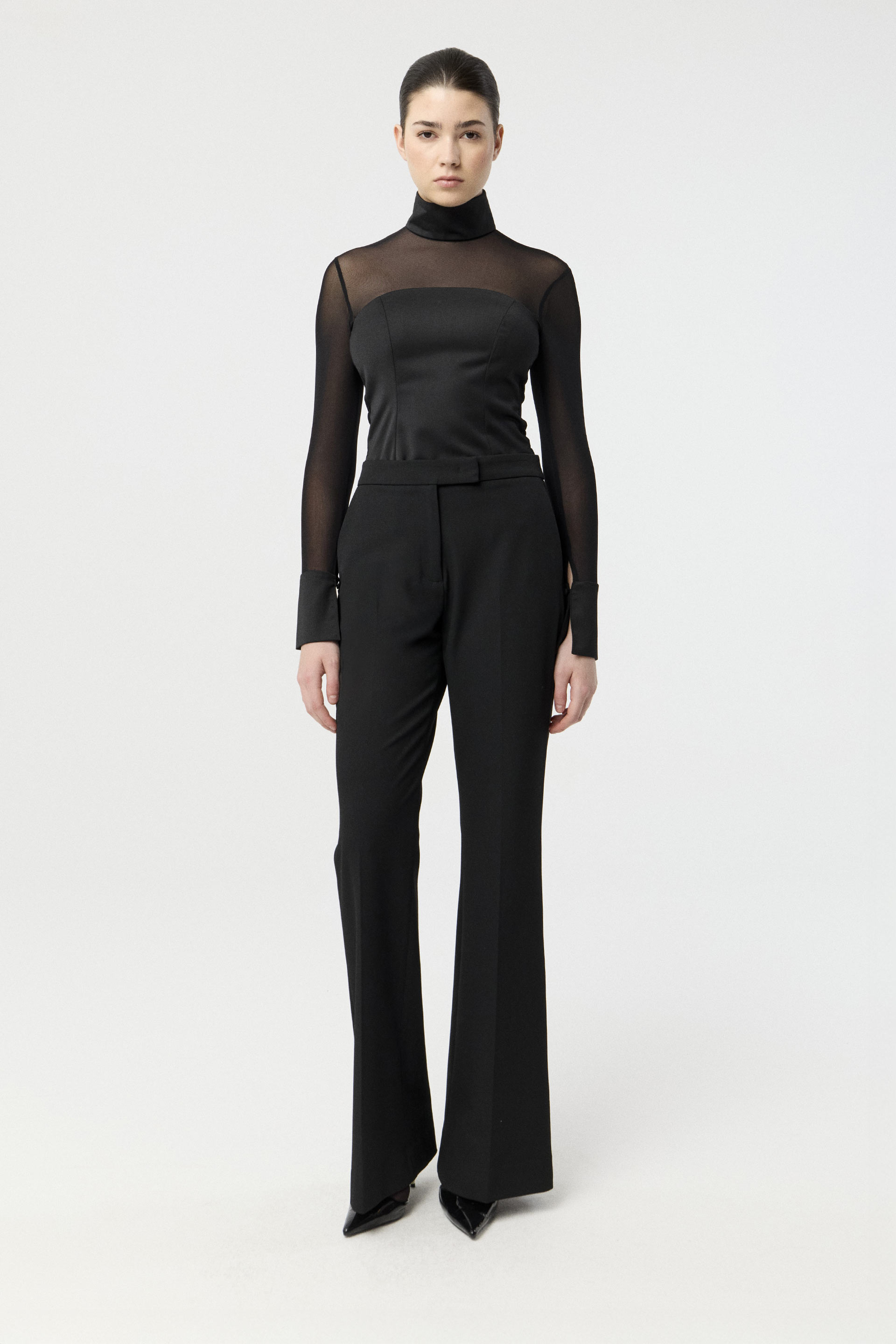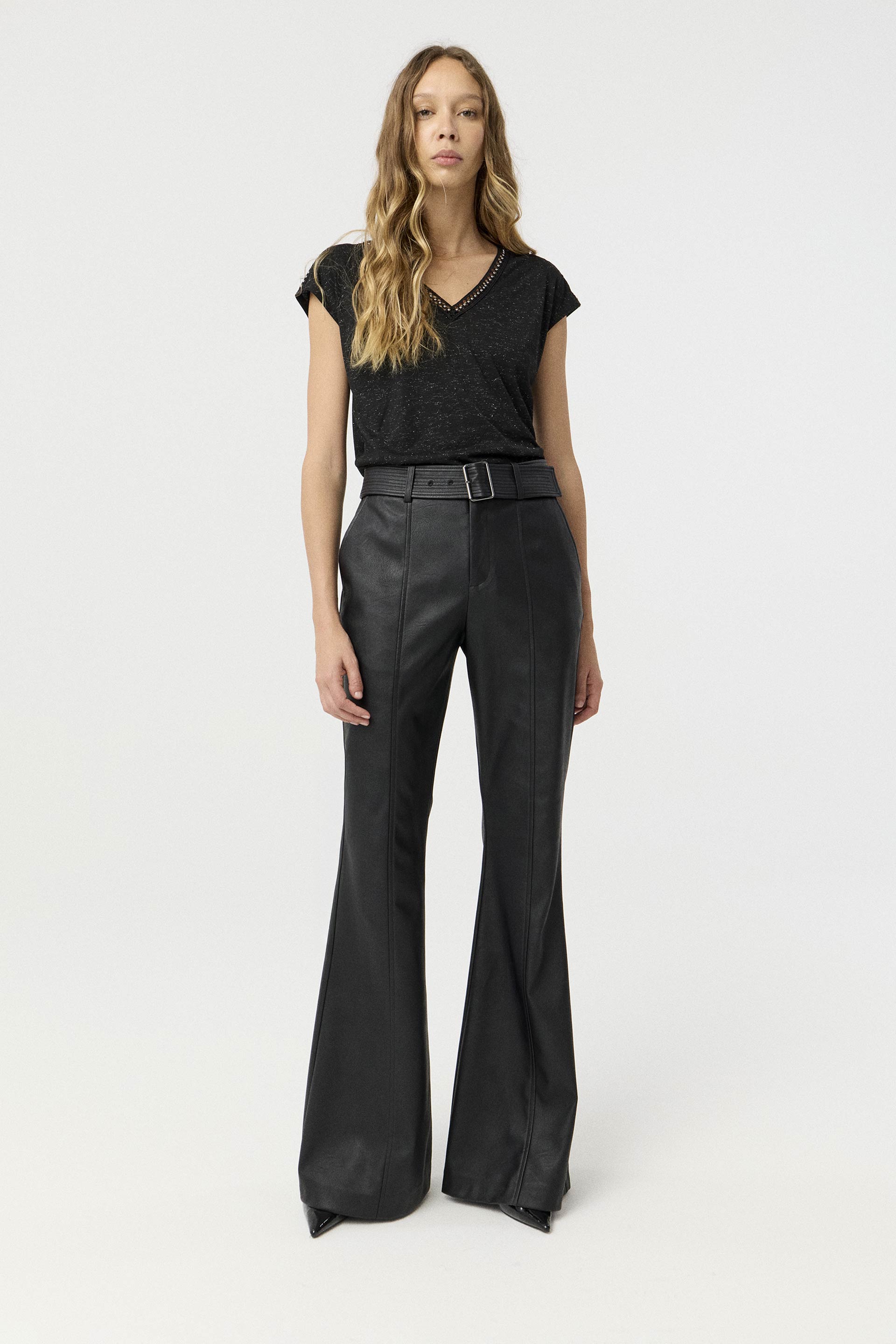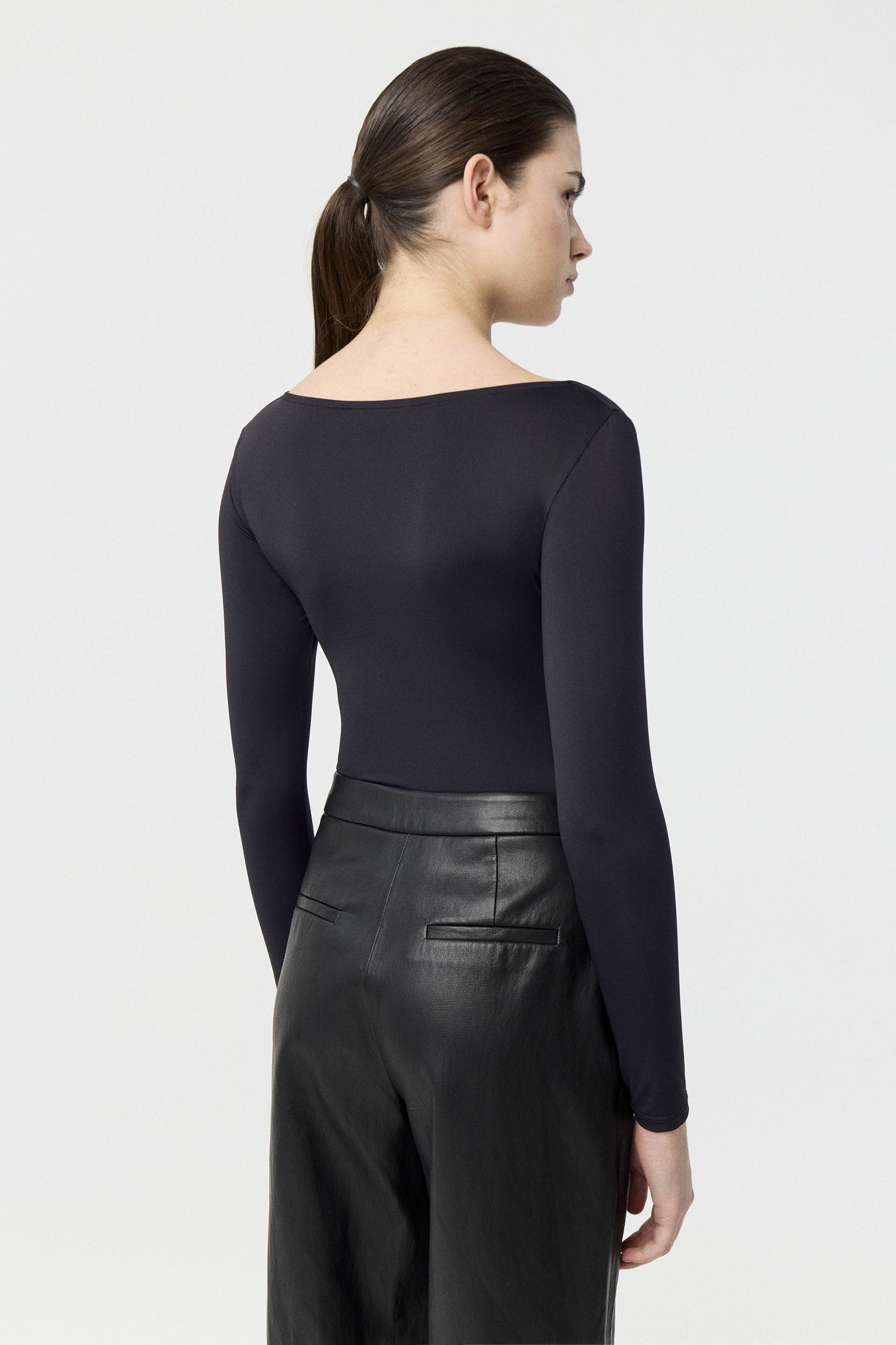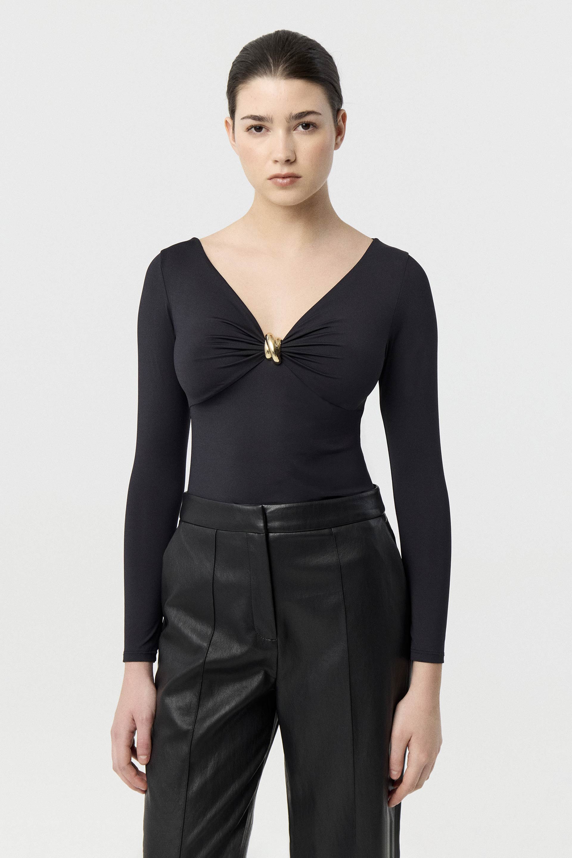 Remera de microfibra de calce anatómico y mangas largas. Escote en V, recorte en el bajo busto y detalle de avío metálico en forma de nudo en el delantero. Canchera y moderna, ideal para sumar un toque chic a tus looks de noche.
