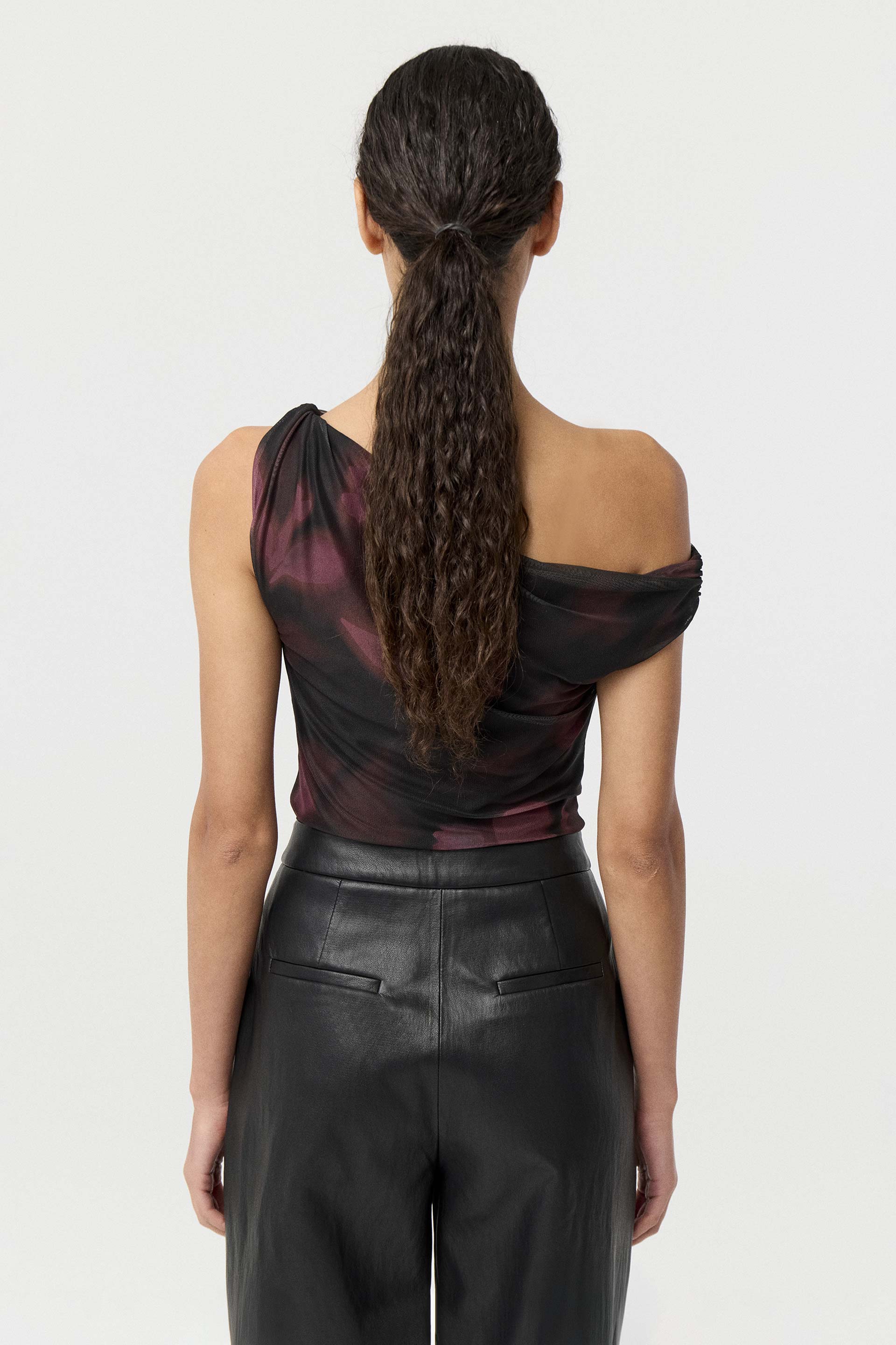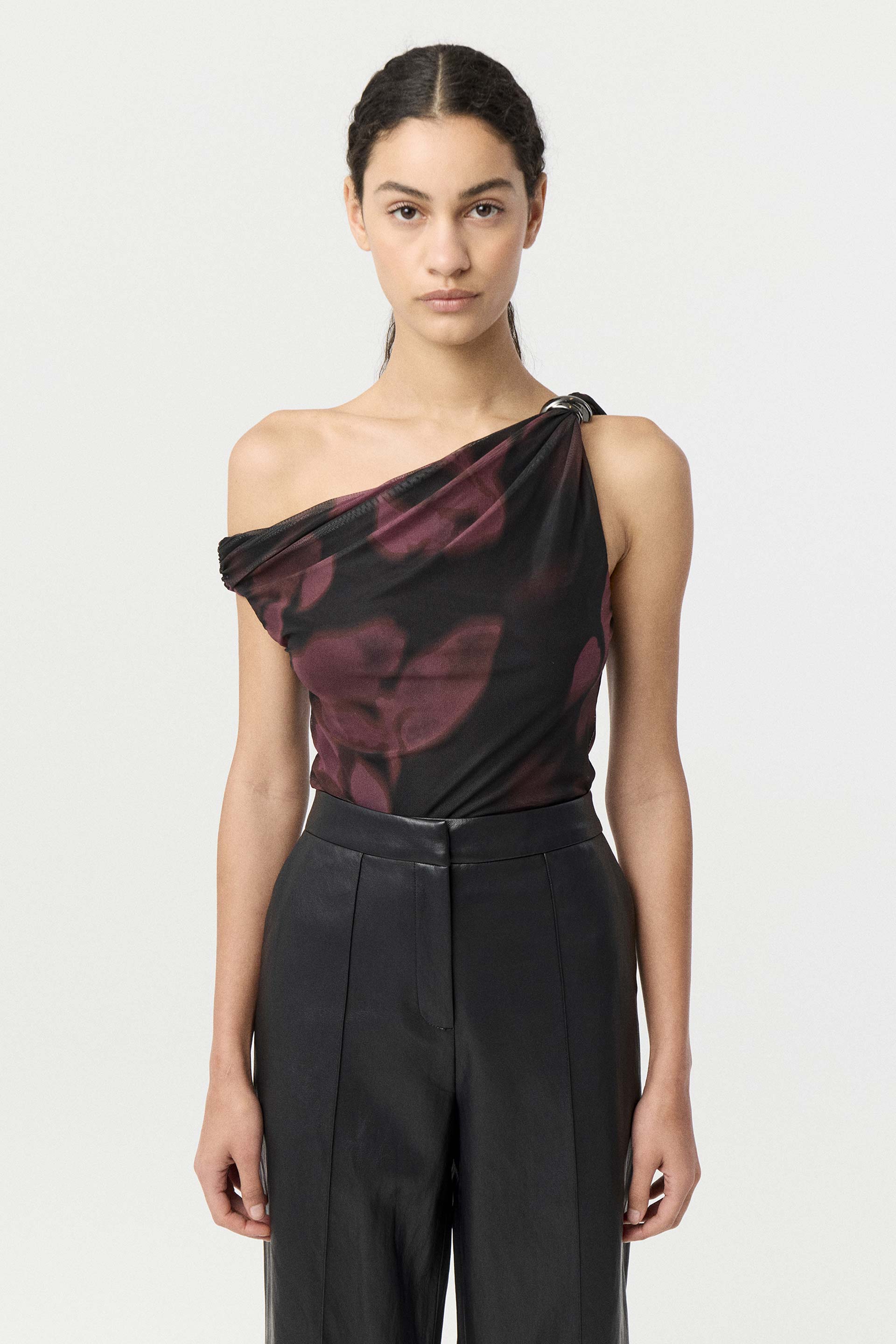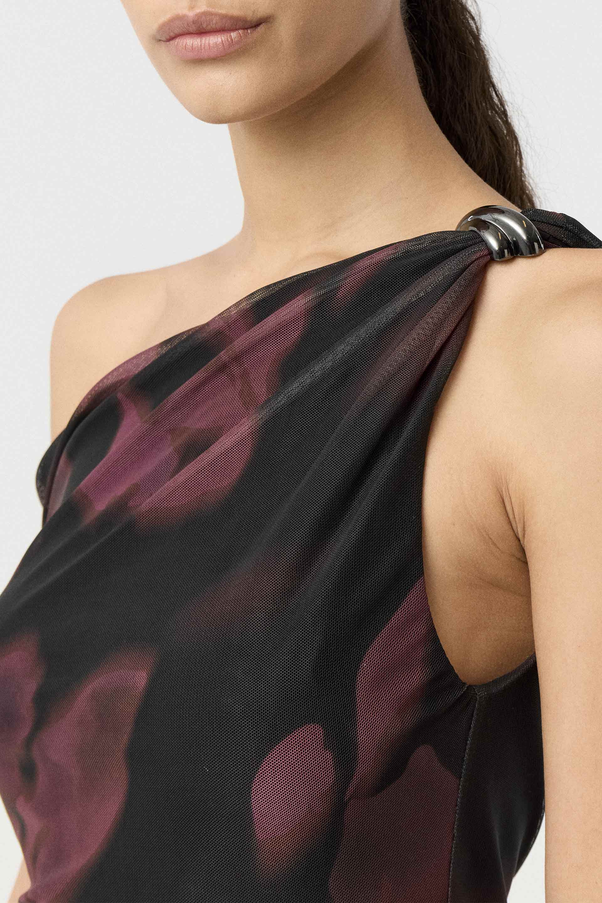 Remera de micro tul estampado, de calce al cuerpo. Presenta diseño asimétrico con torsada y pasador metálico en el bretel, más un escote diagonal con manga tipo off shoulder. Lleva forrería de microfibra para mayor comodidad. Un toque de color y actitud que levanta cualquier look.