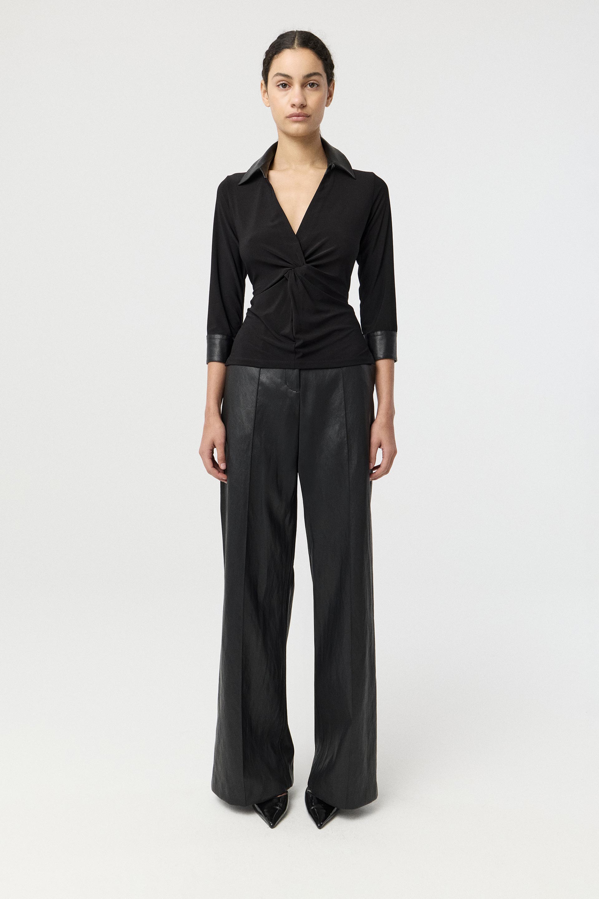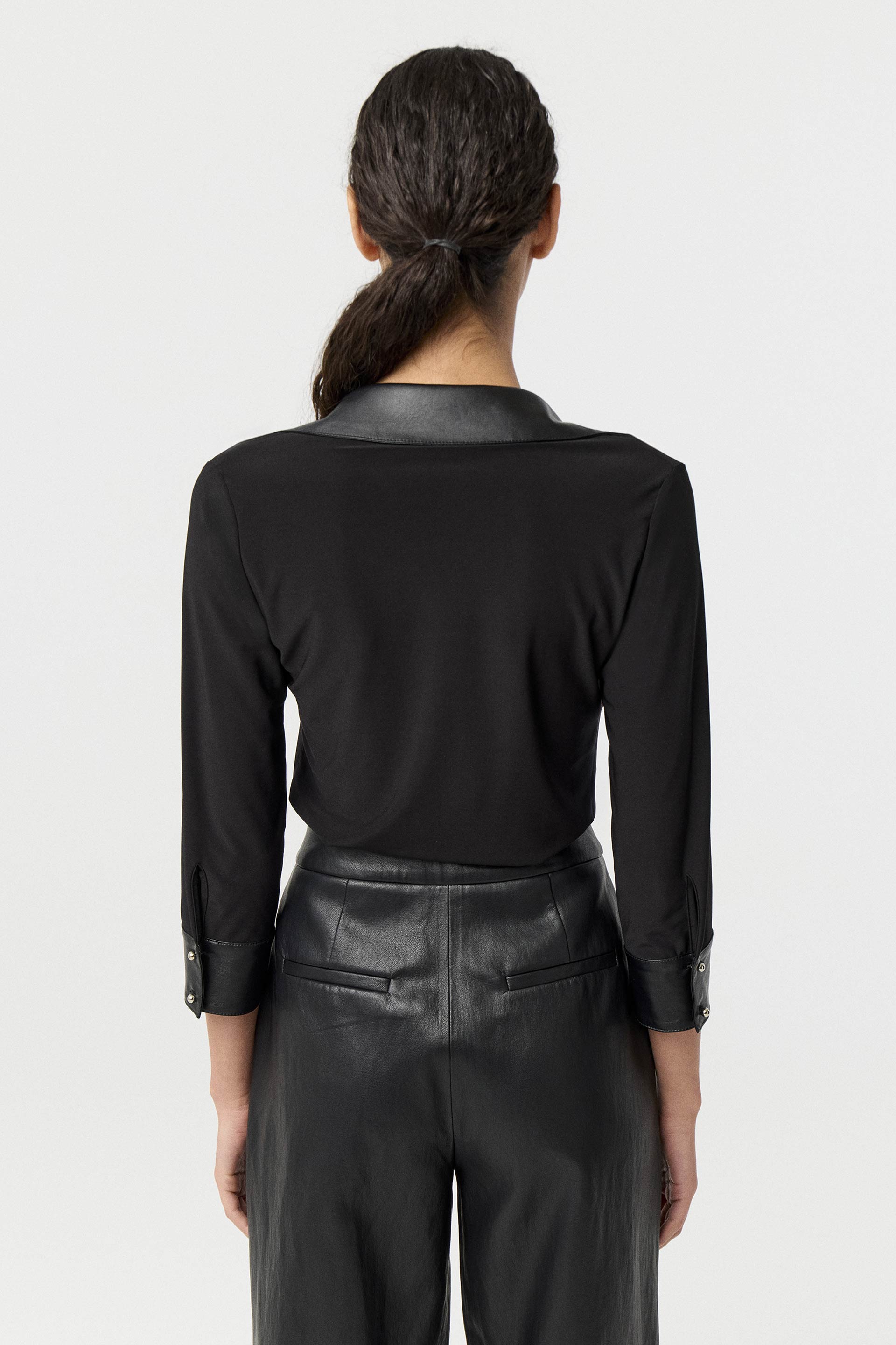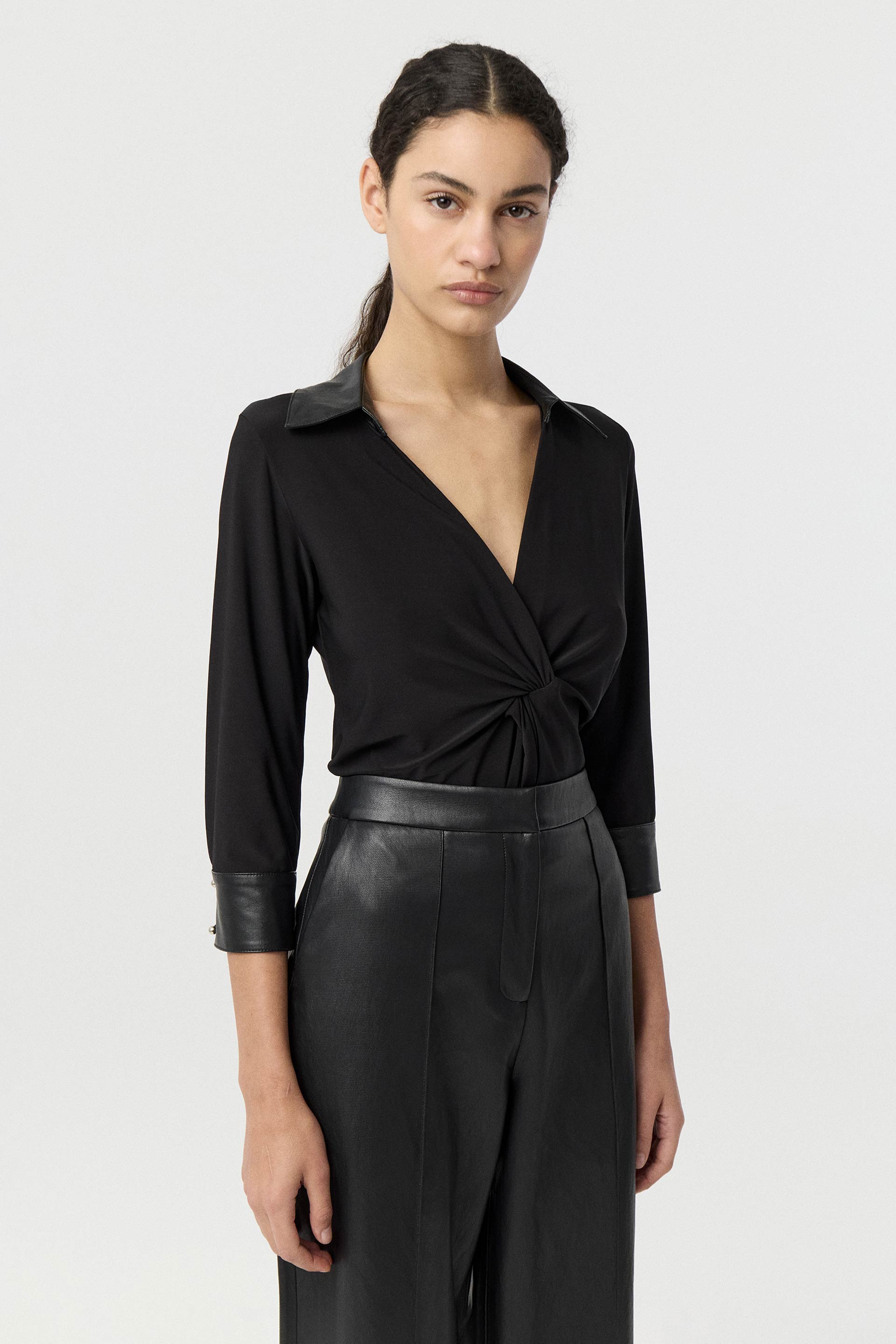 Camisa de microfibra de calce anatómico, con combinación en cuello y puños de efecto cuero. Con mangas largo 3/4, escote en V y detalle de nudo en la cintura delantera. Una prenda que combina elegancia con un toque rocker para renovar tus looks de oficina.