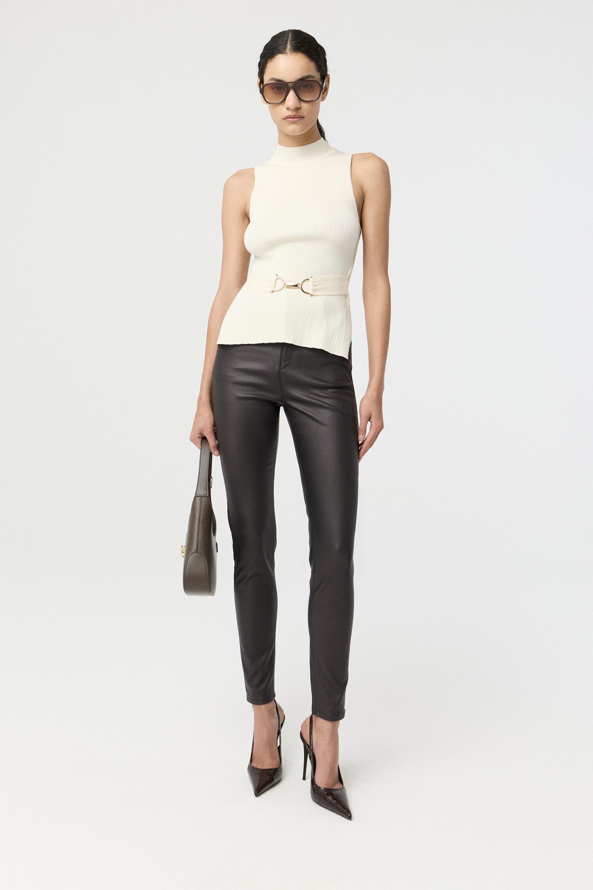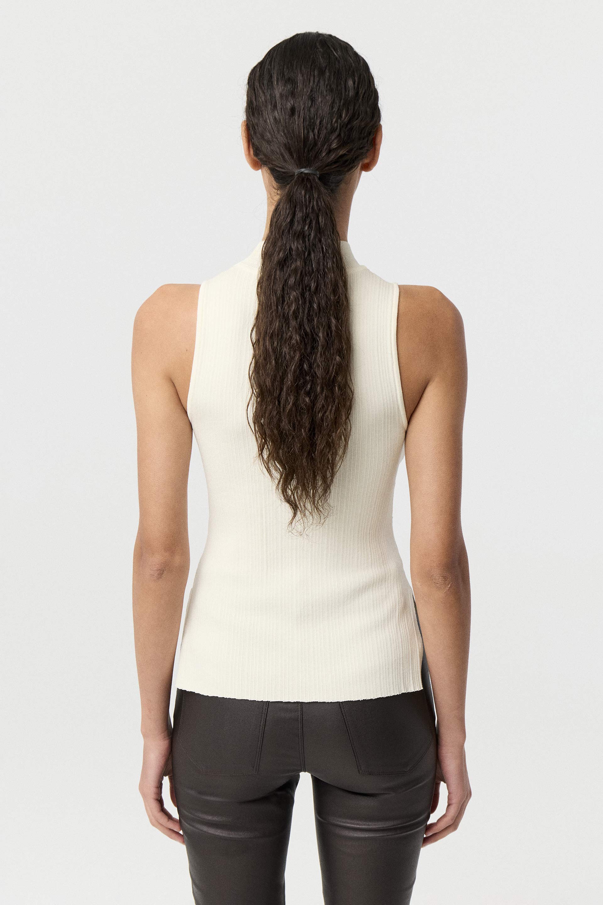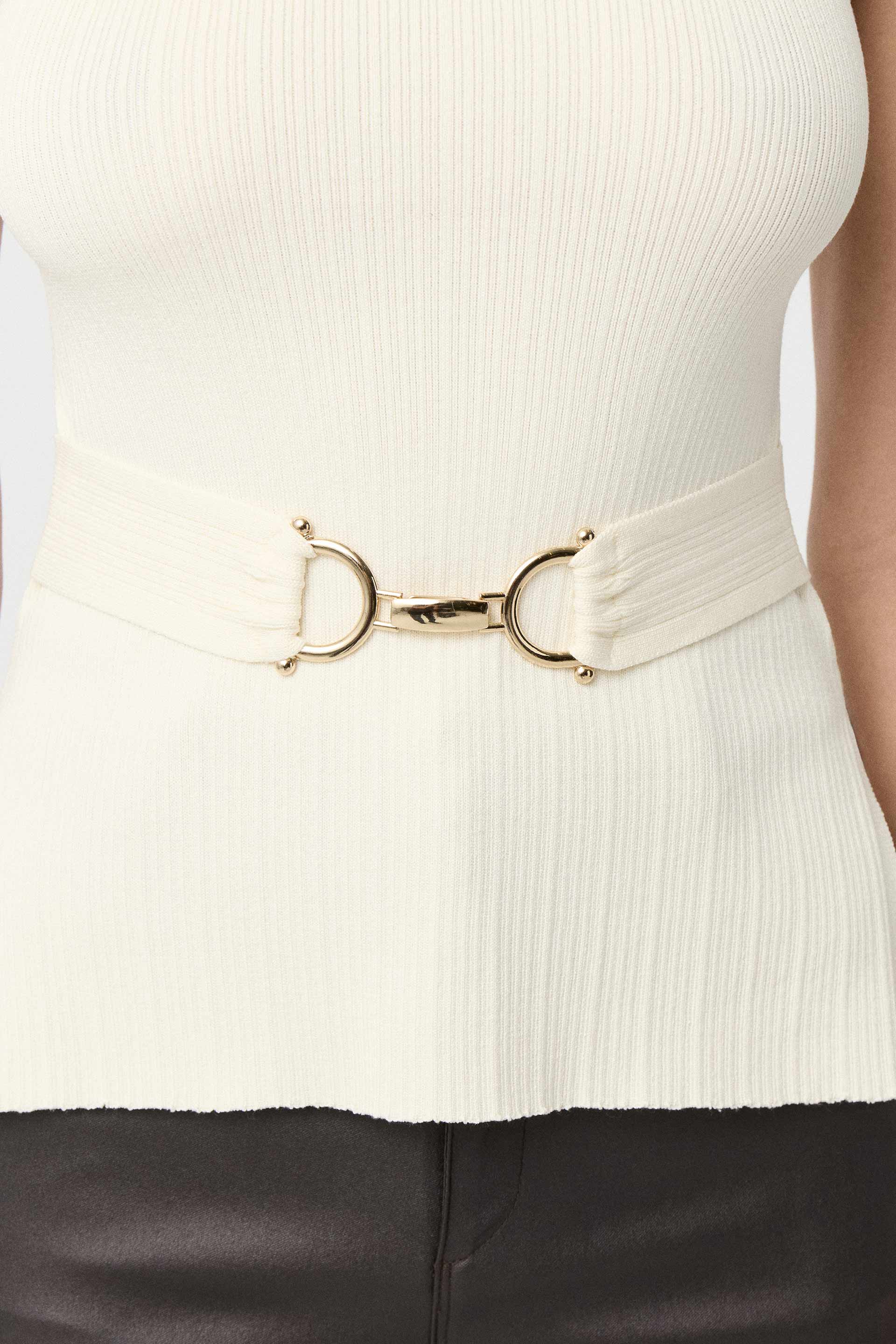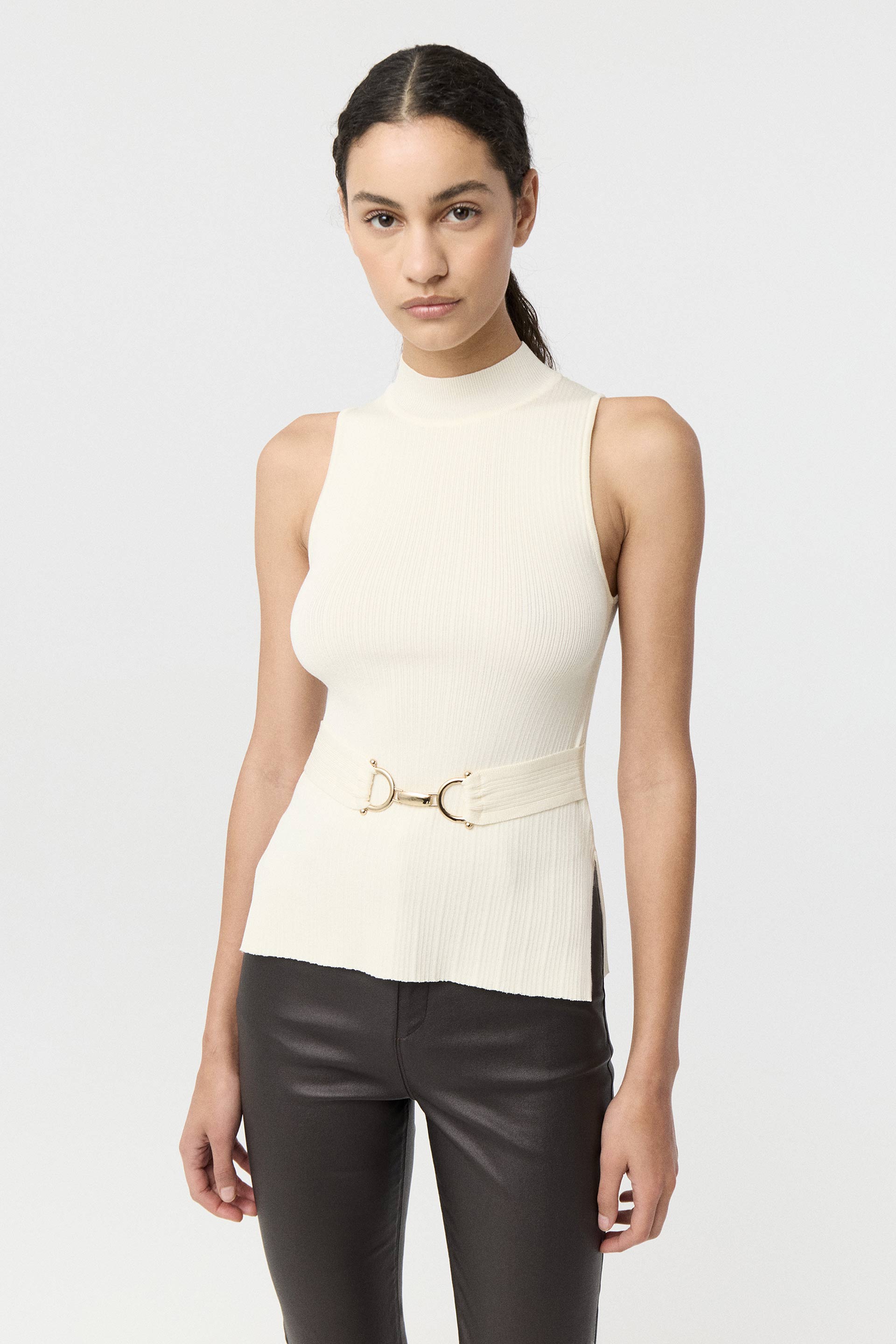 Top tejido de punto acanalado y calce anatómico. Sin mangas, cuello semipolera y tajos laterales. Presenta un cinto con hebilla metálica que define la cintura y aporta estilo y elegancia, ideal para elevar tus looks.