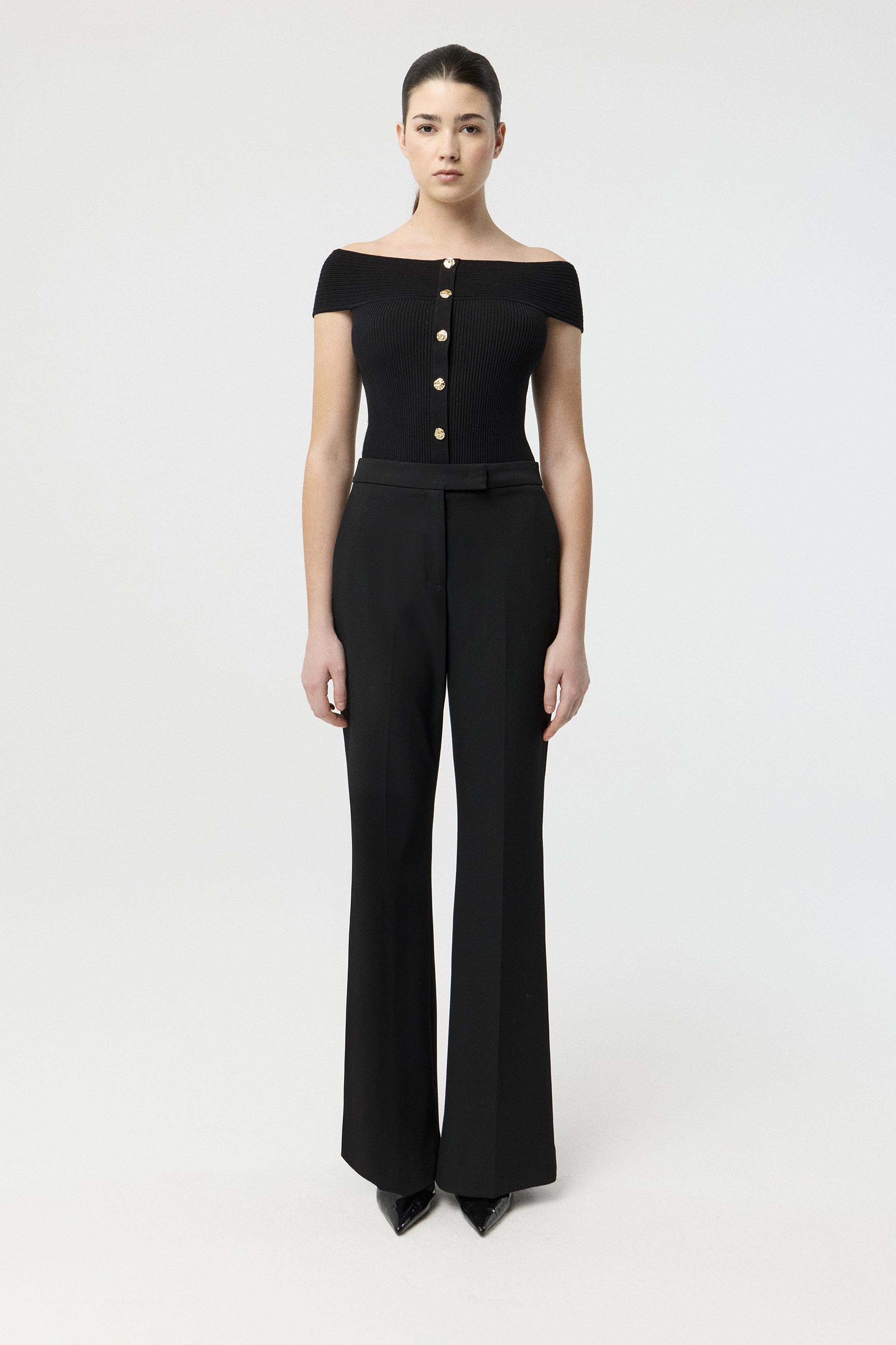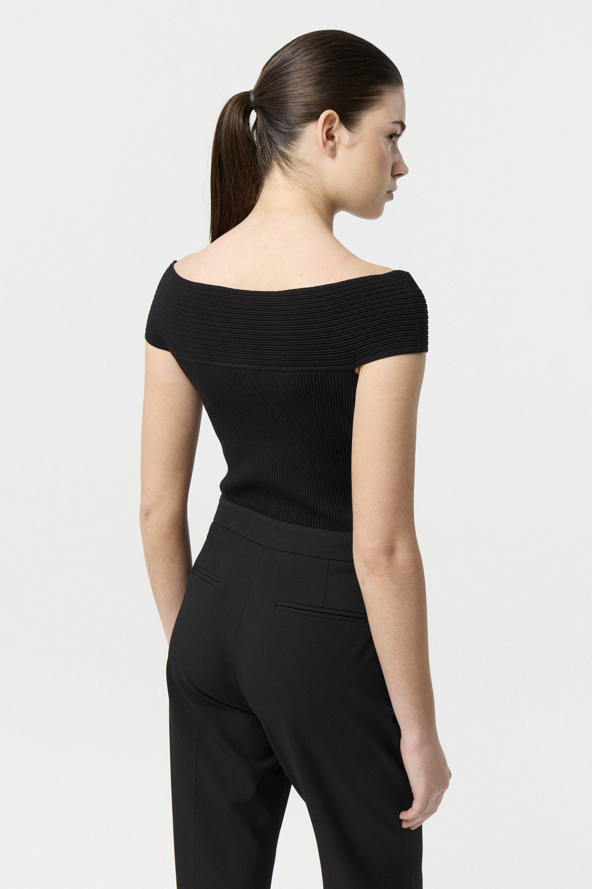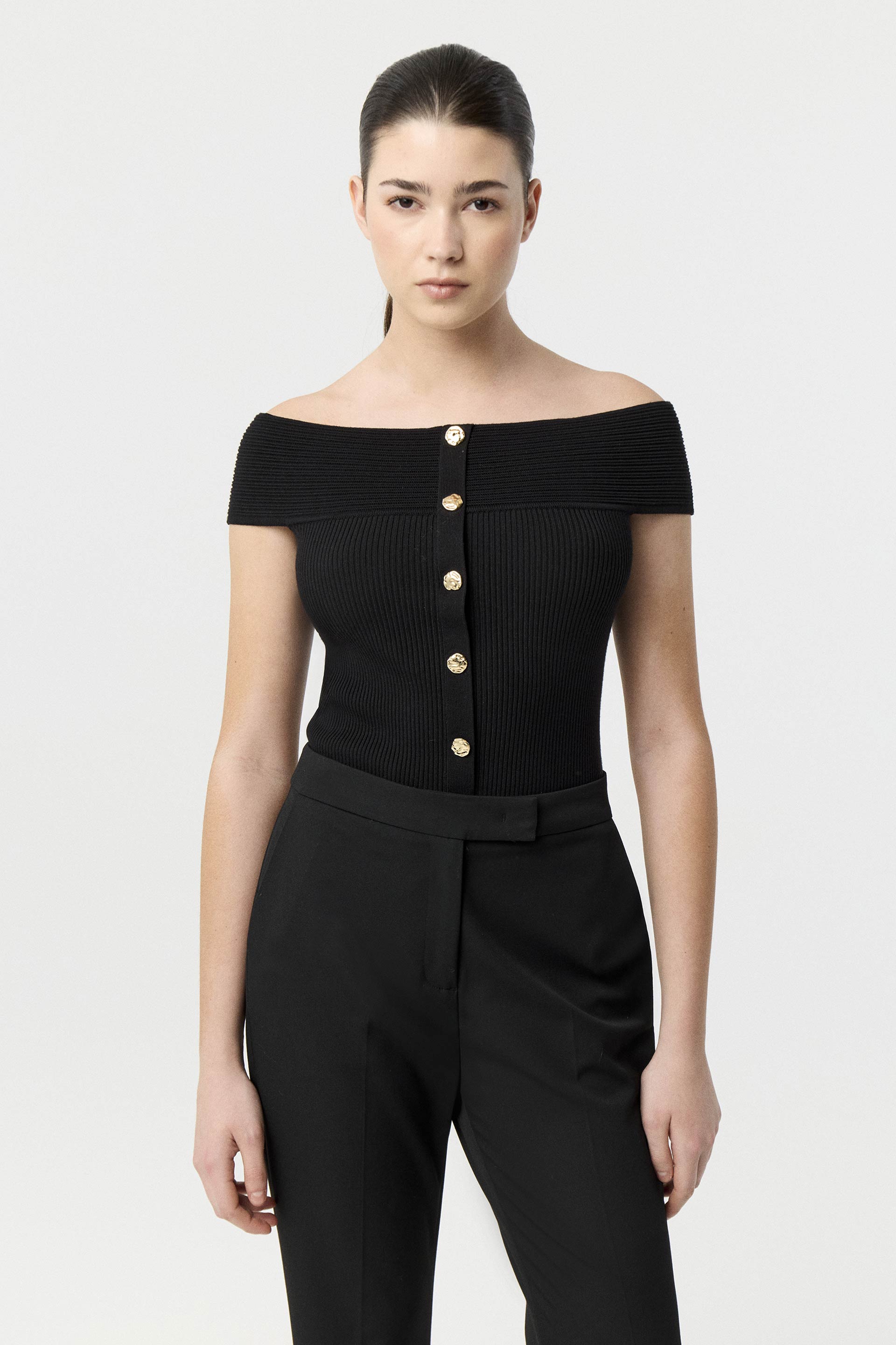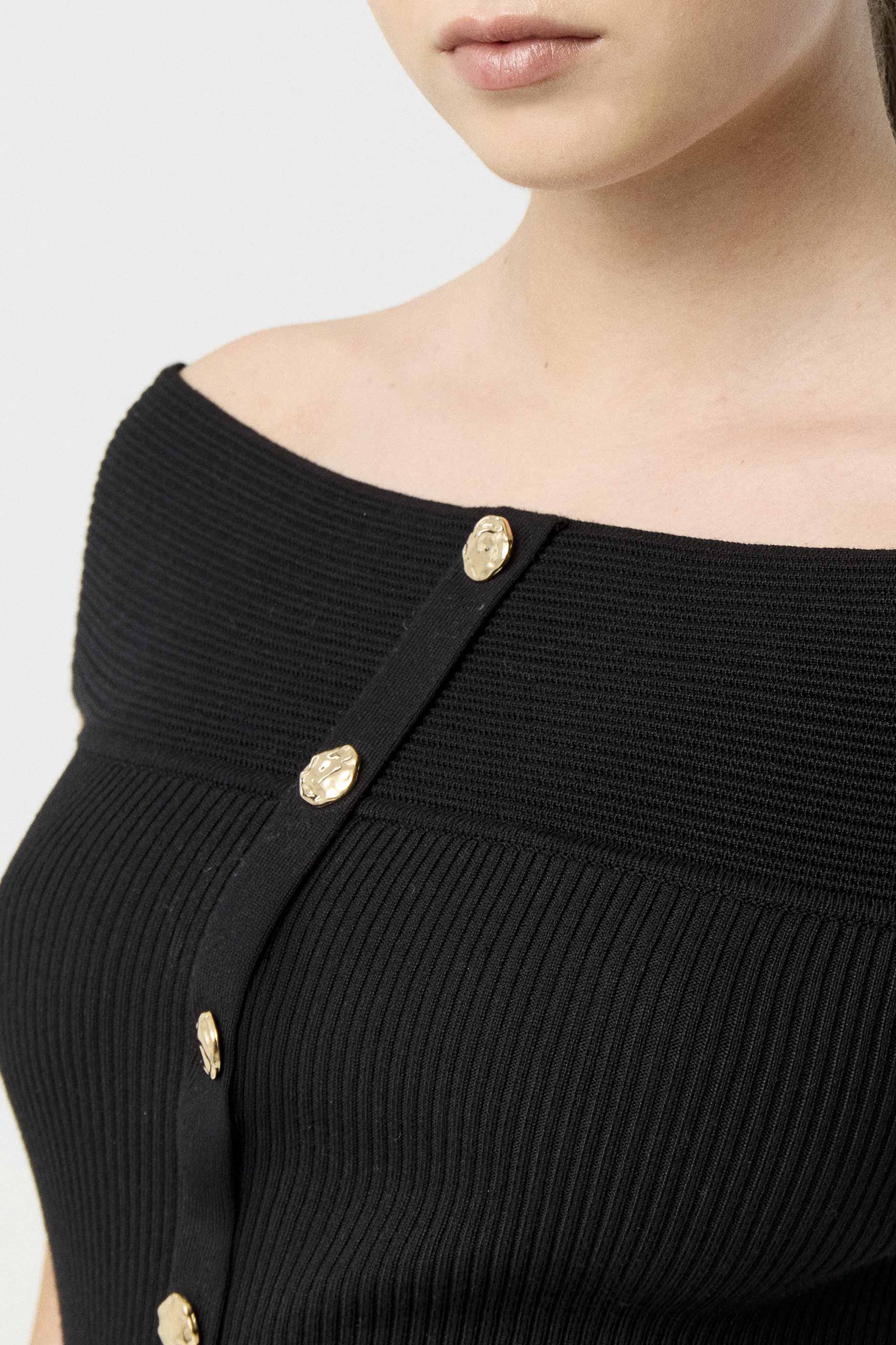 Top tejido de punto acanalado y calce anatómico. Diseño strapless con hombros al descubierto y cartera central con botones metálicos que suman un toque de carácter. Una prenda distinta y canchera, perfecta para levantar cualquier look.