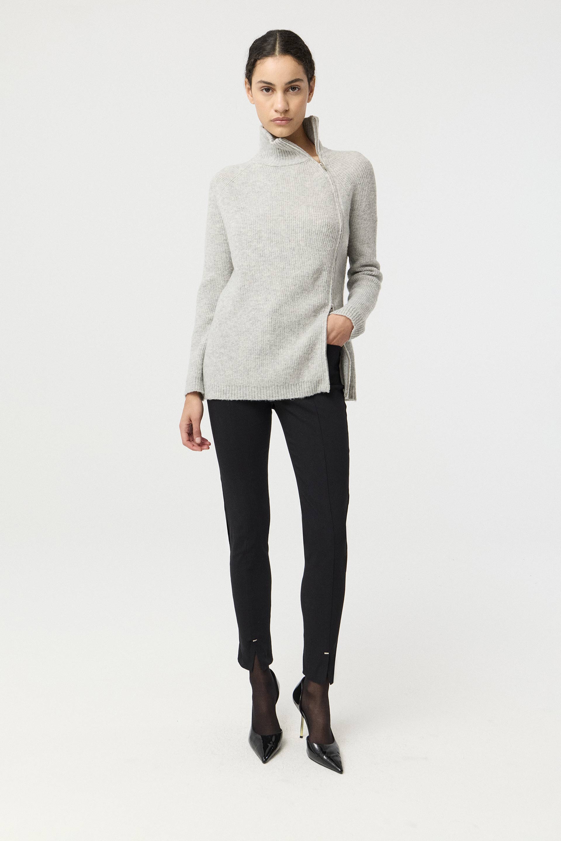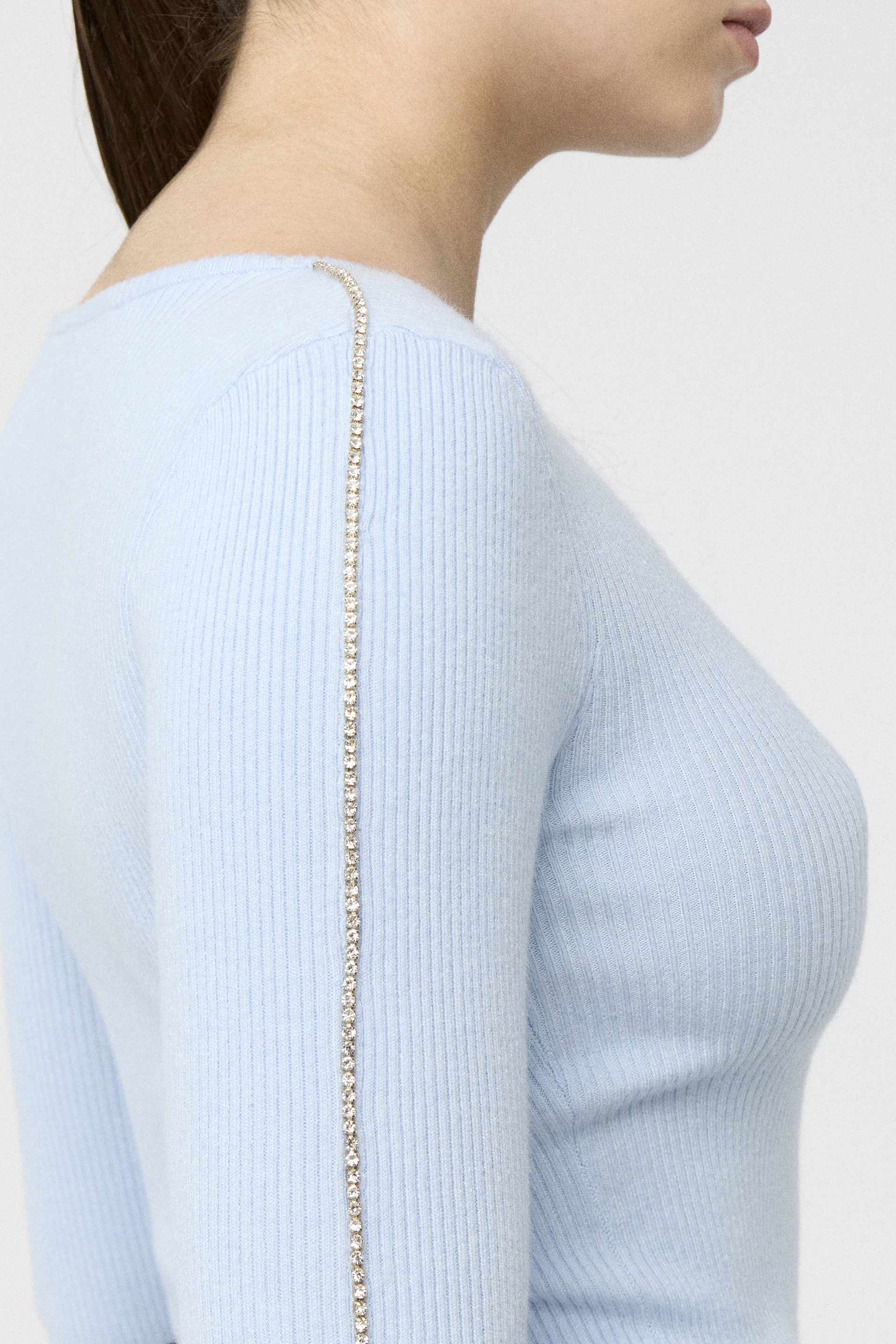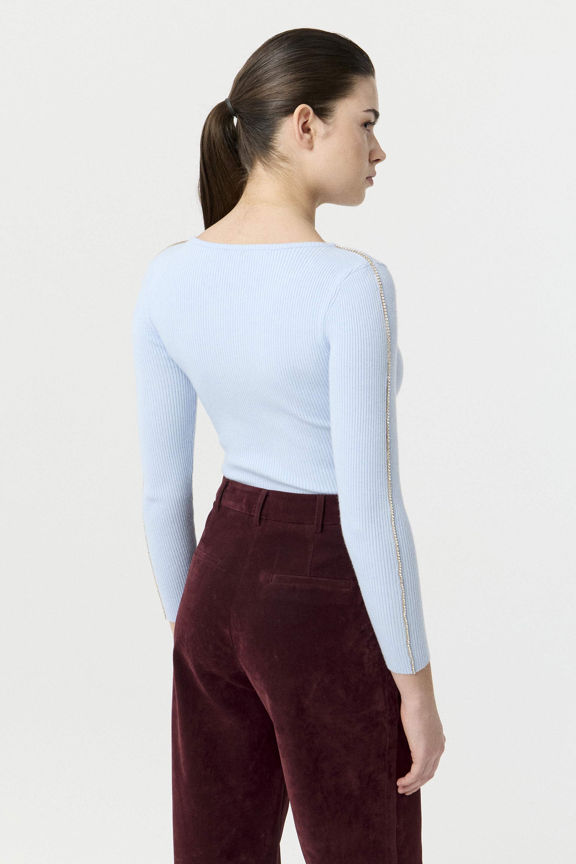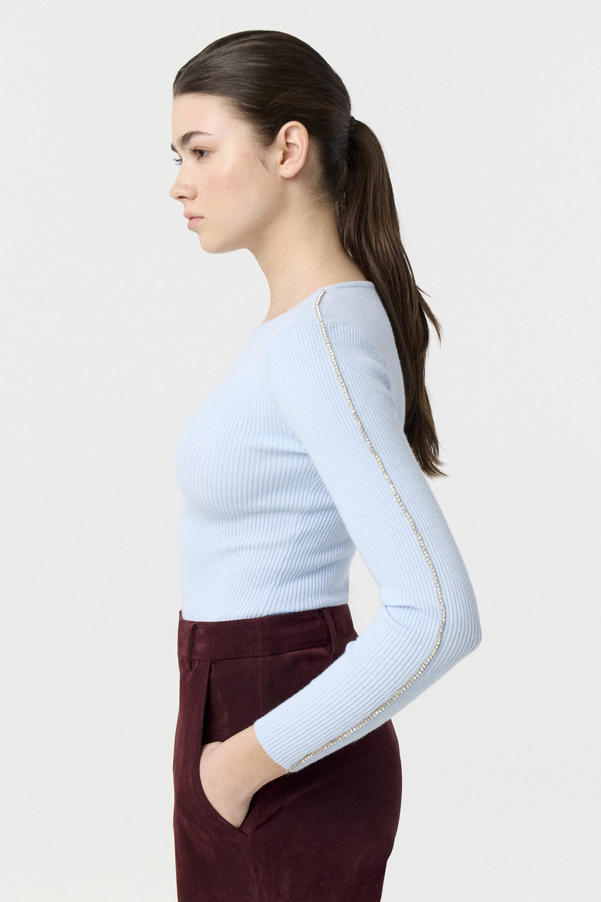 Sweater tejido de calce anatómico y mangas largas. Cuello redondo a la base con galón de strass en el recorrido de las mangas. Simpleza y distinción para darle un toque extra a tus looks de invierno.