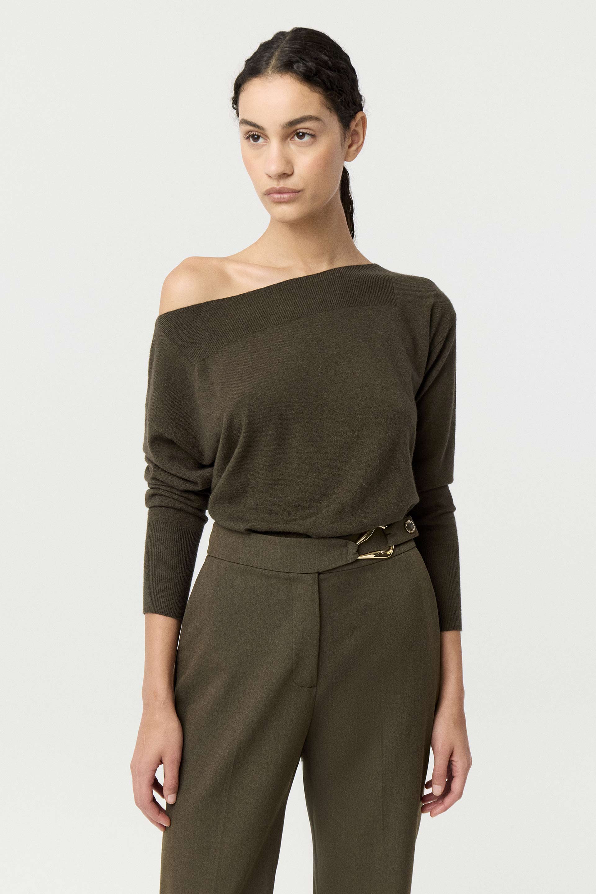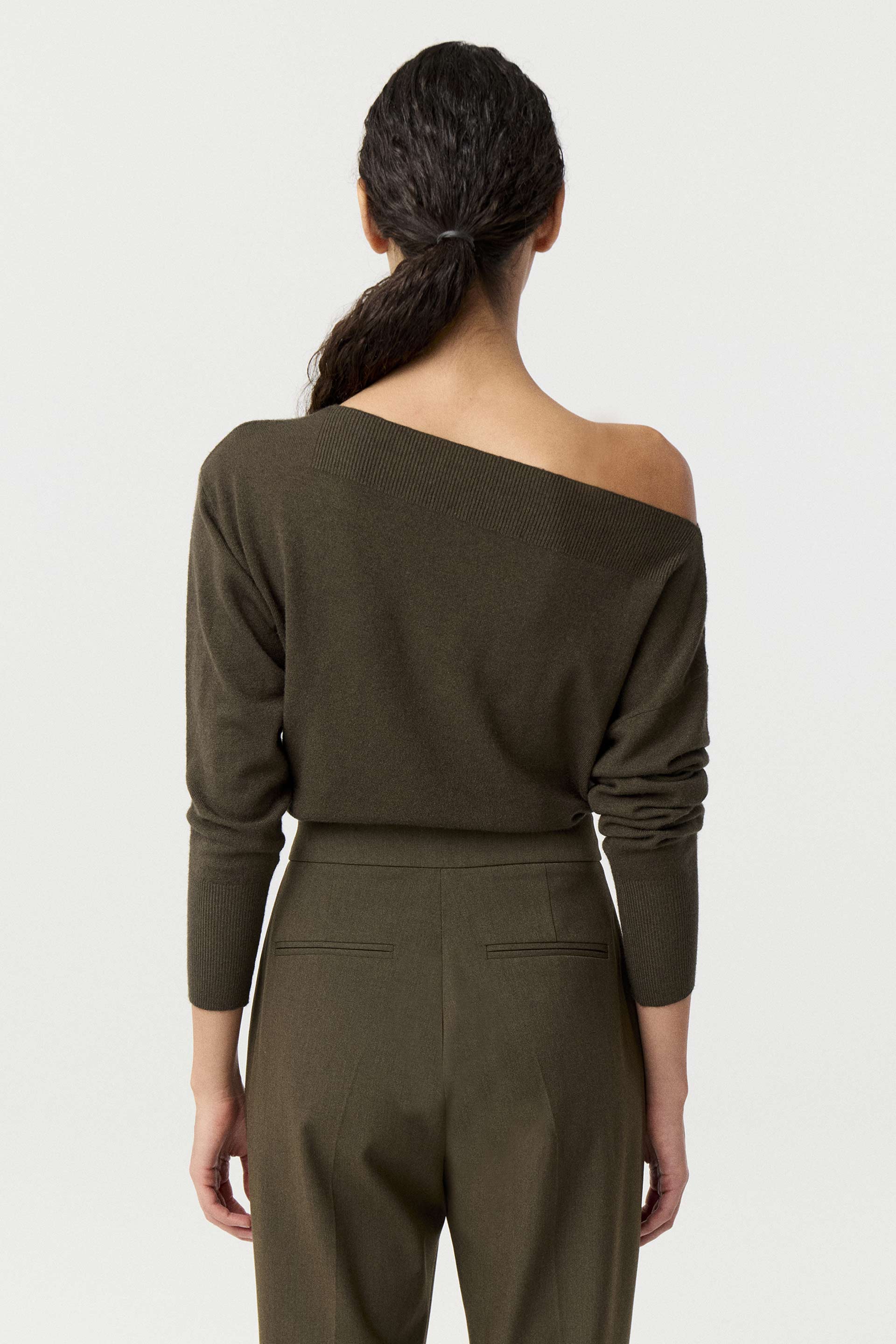 Sweater tejido de calce relajado y mangas largas. Presenta un escote bote amplio que podés llevar de forma tradicional o corrido hacia un lado para lucir un hombro. Un clásico atemporal que no pasa de moda.