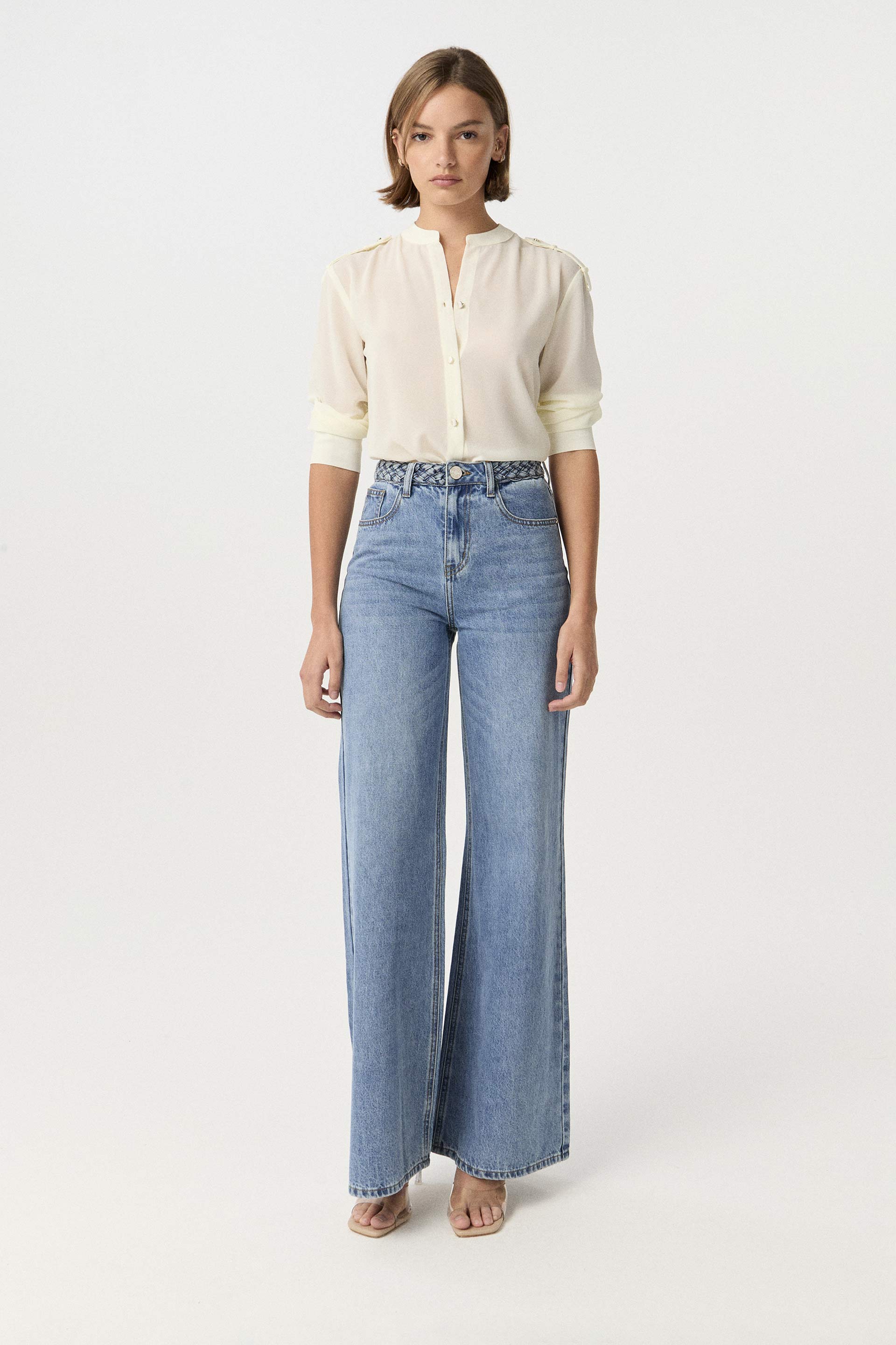 Jean elastizado tiro alto con pierna flare y calce al cuerpo. Detalles de botones metálicos en el delantero, presillas y acceso con cierre. Su lavado con bajada de color y calce favorecedor lo convierten en un ítem de absoluta tendencia. Combinalo con sandalias y un top tejido para un look urbano y moderno.