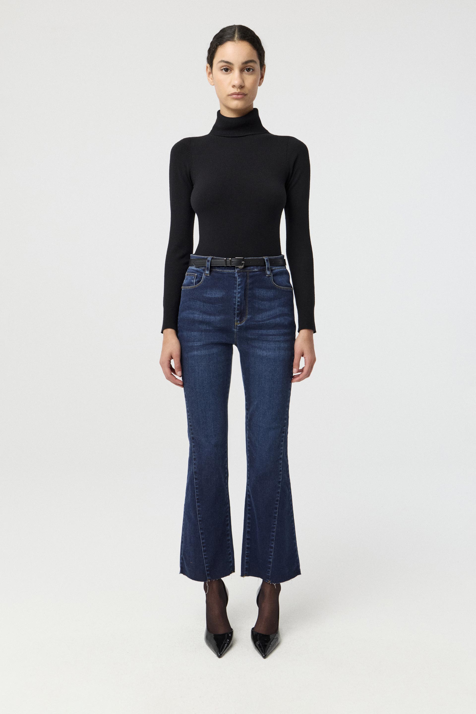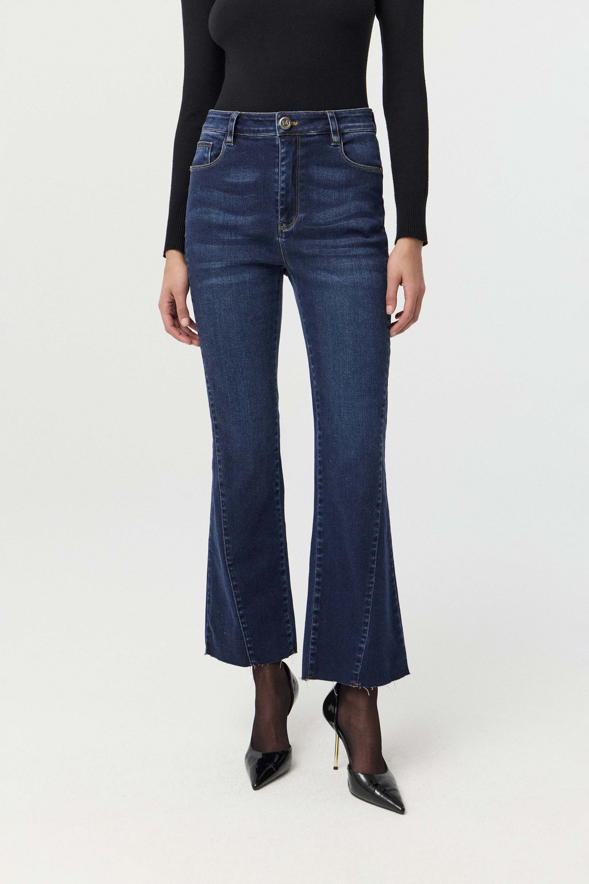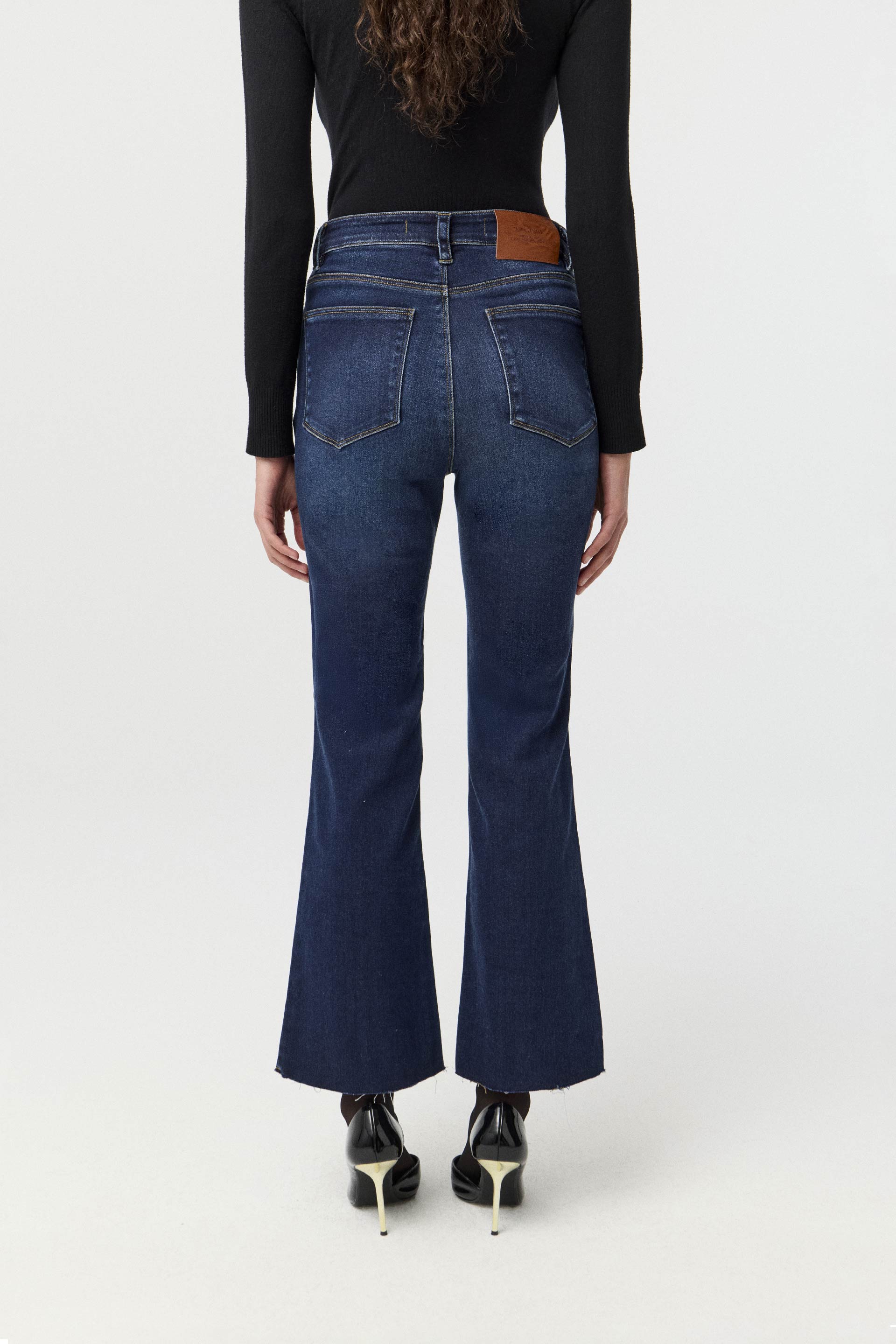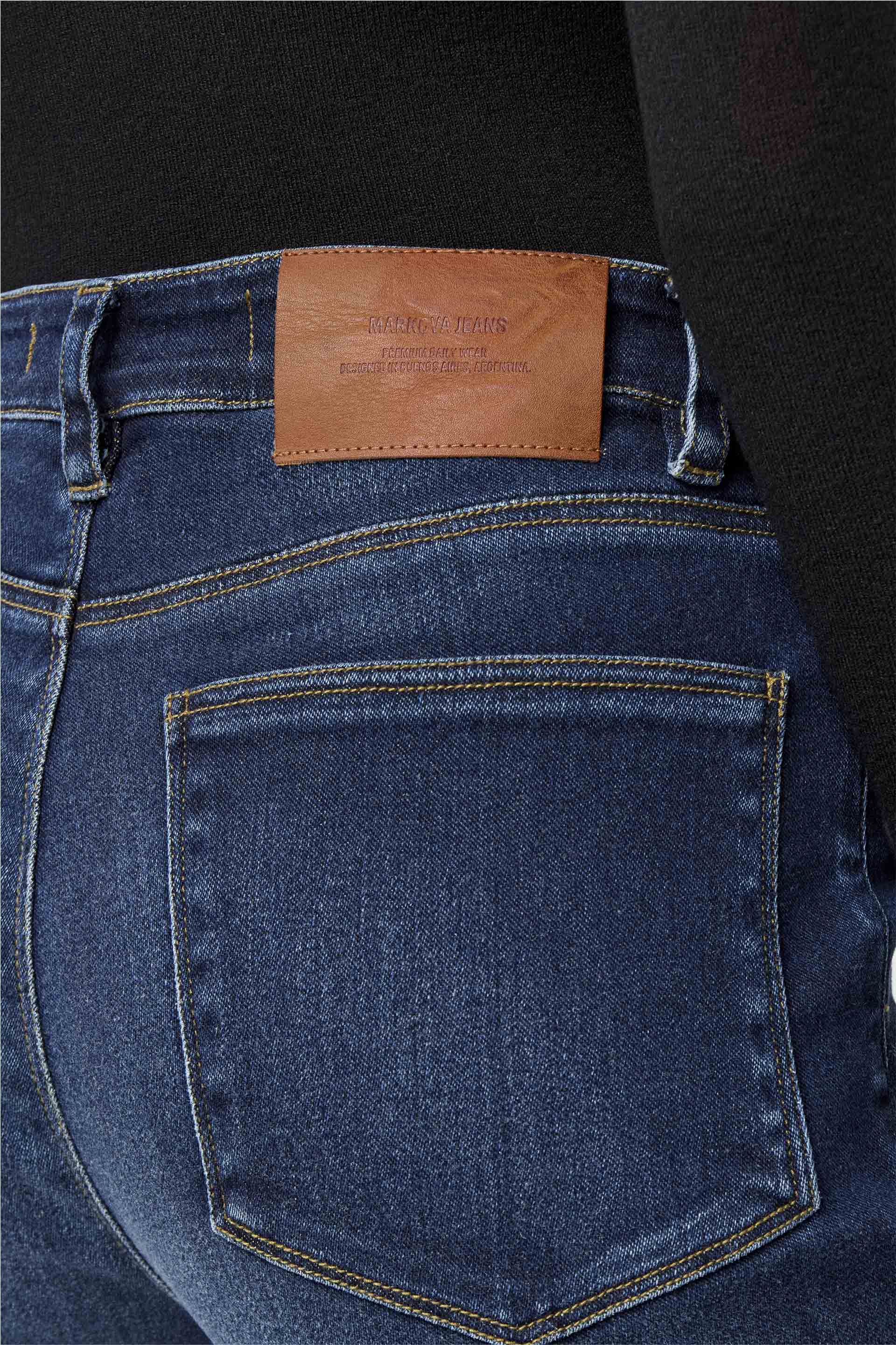 Jean elastizado de tiro alto, con pierna crop flare, calce al cuerpo y diseño 5 bolsillos. Posee badana, botón y remaches metálicos personalizados MKV. Se le aplicó un lavado con bajada de color y localizado. Un jean clásico y fácil de combinar, ideal para armar looks de oficina o más relajados.