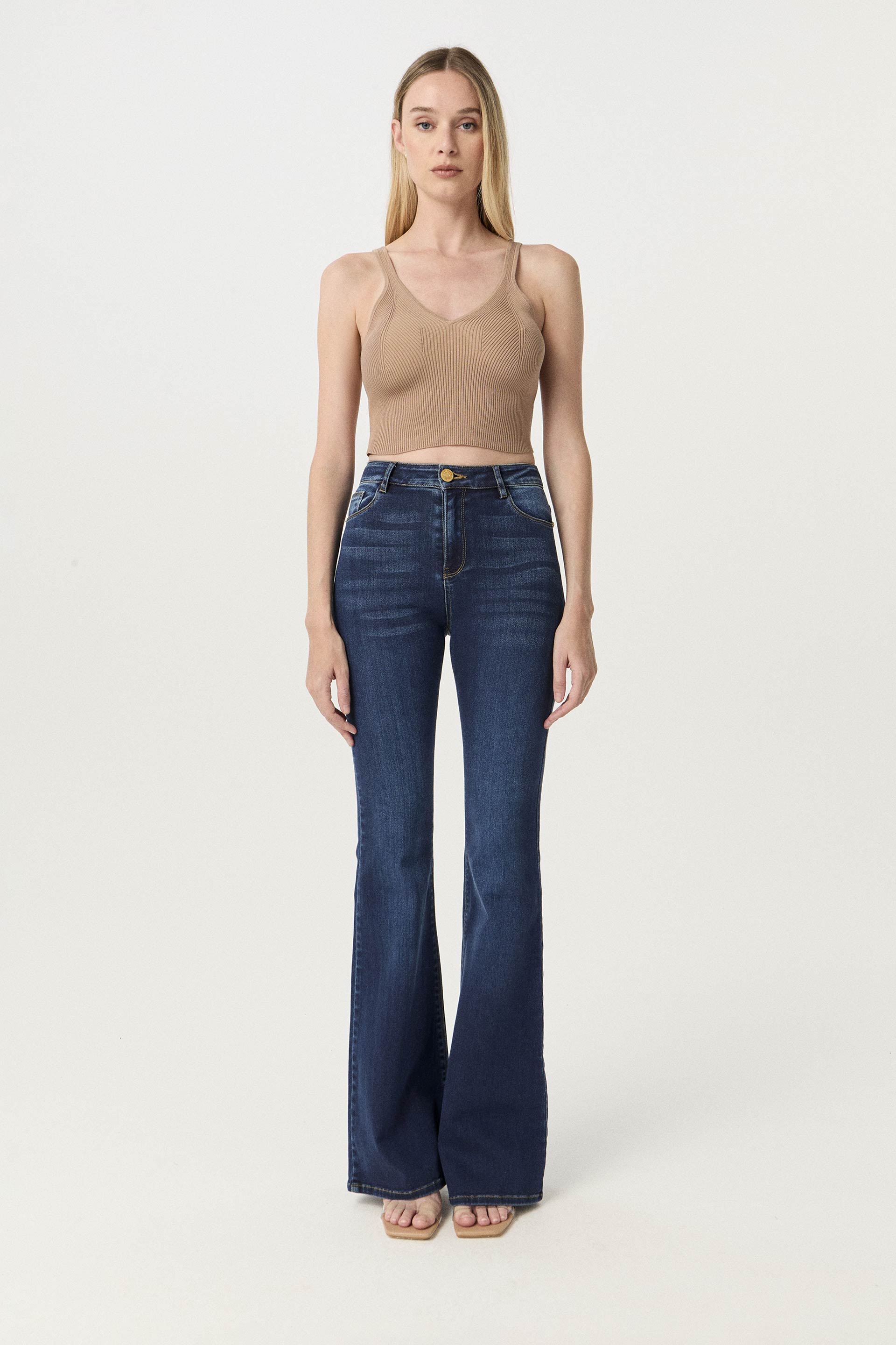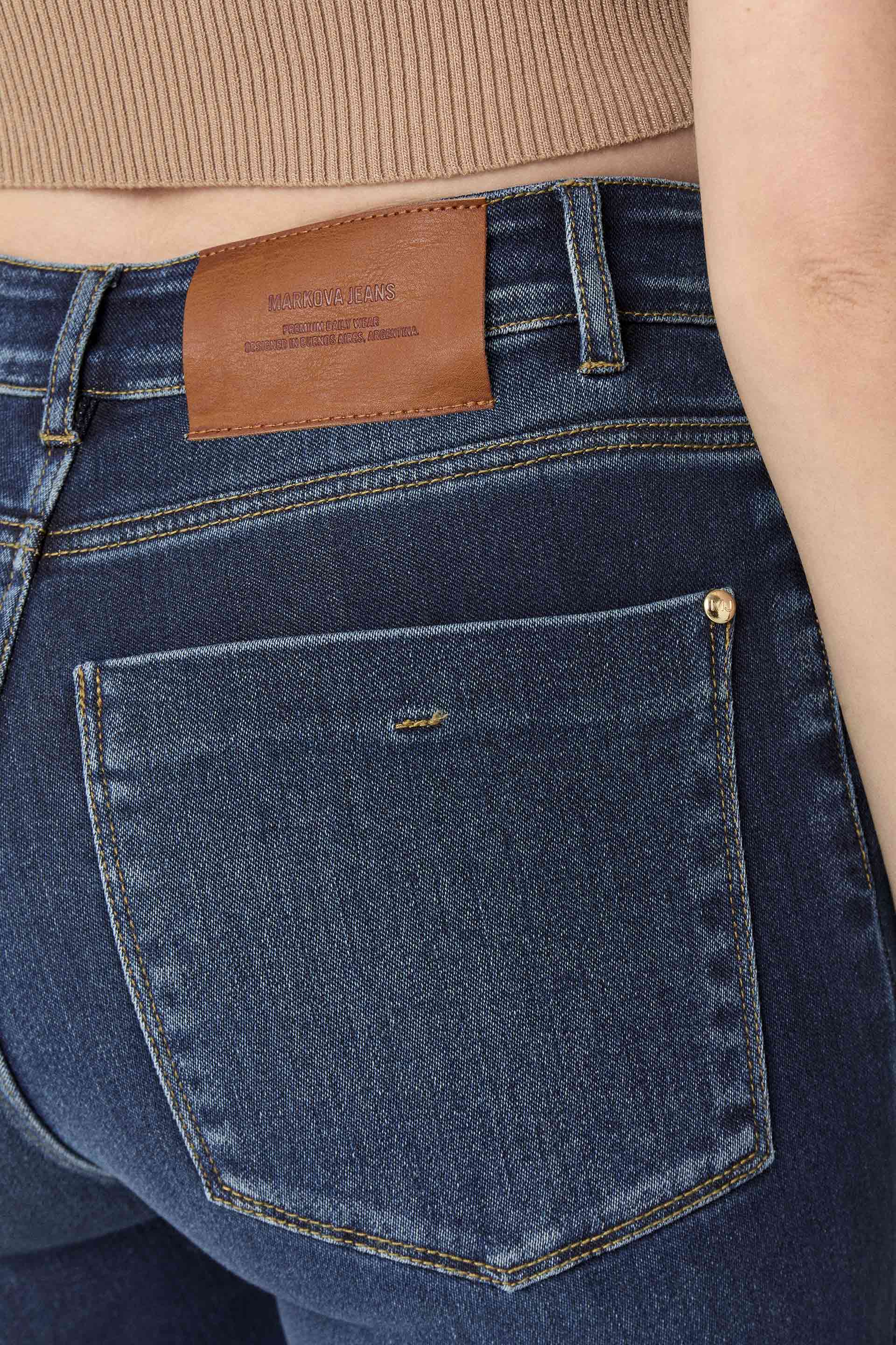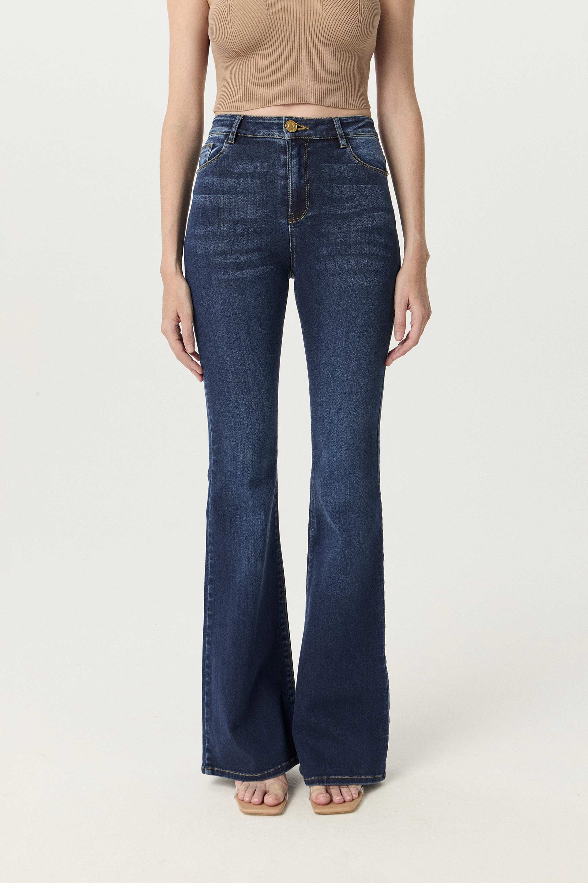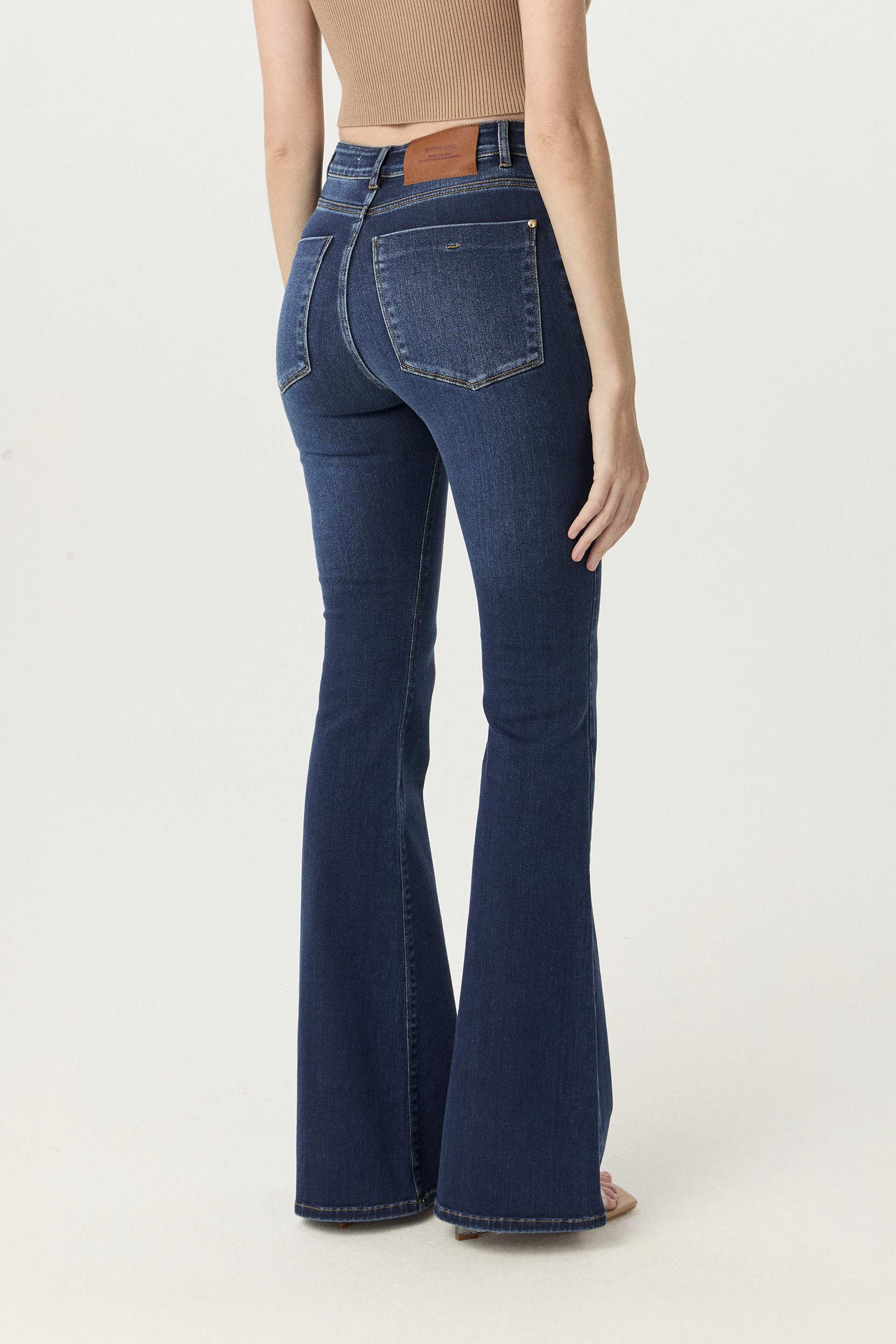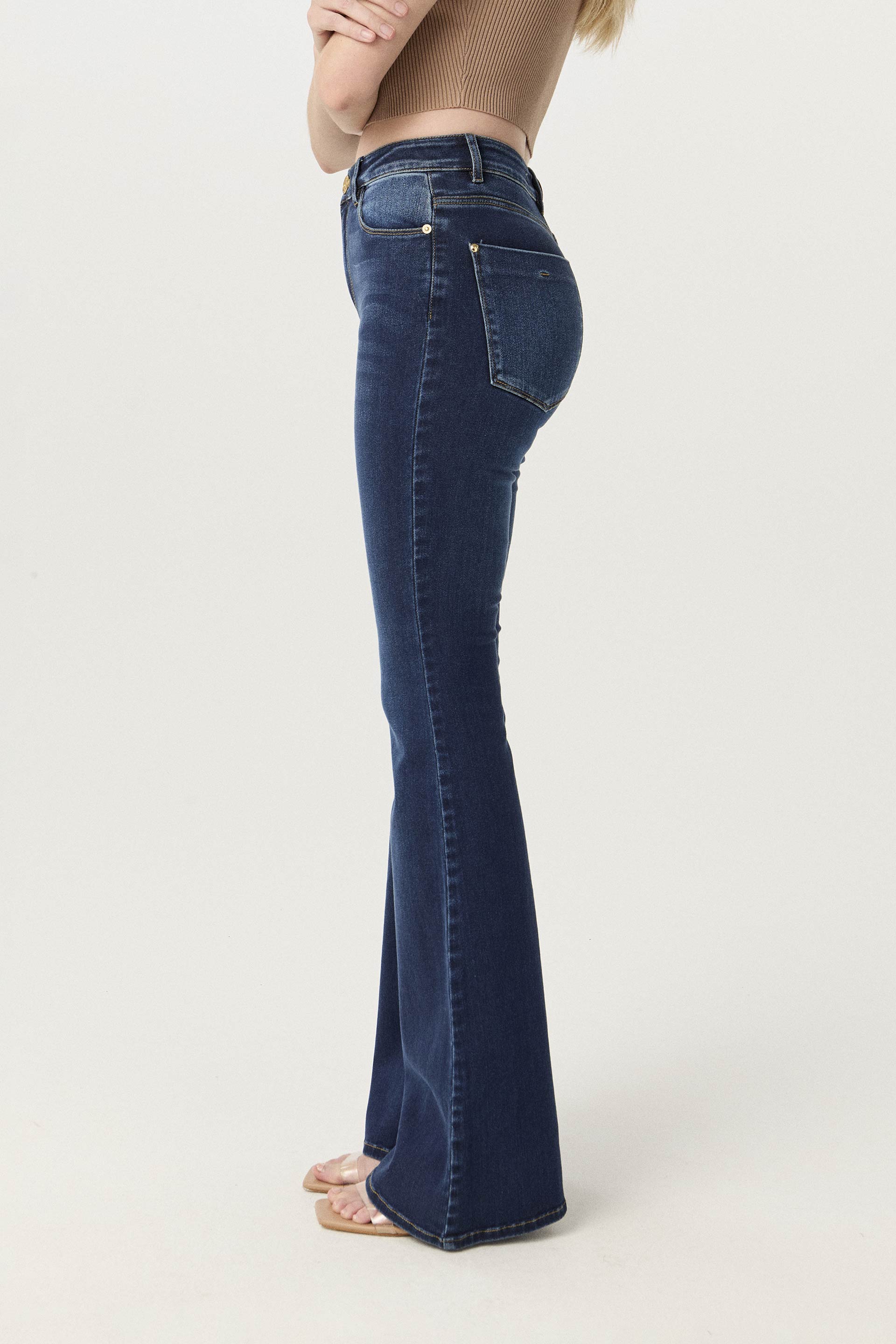 Jean elastizado tiro alto con pierna flare y calce al cuerpo, diseño 5 bolsillos. Incluye badana, botones y remaches metálicos personalizados MKV. Su género con spandex y la pierna flare lo convierten en un clásico moderno, perfecto para cualquier ocasión.