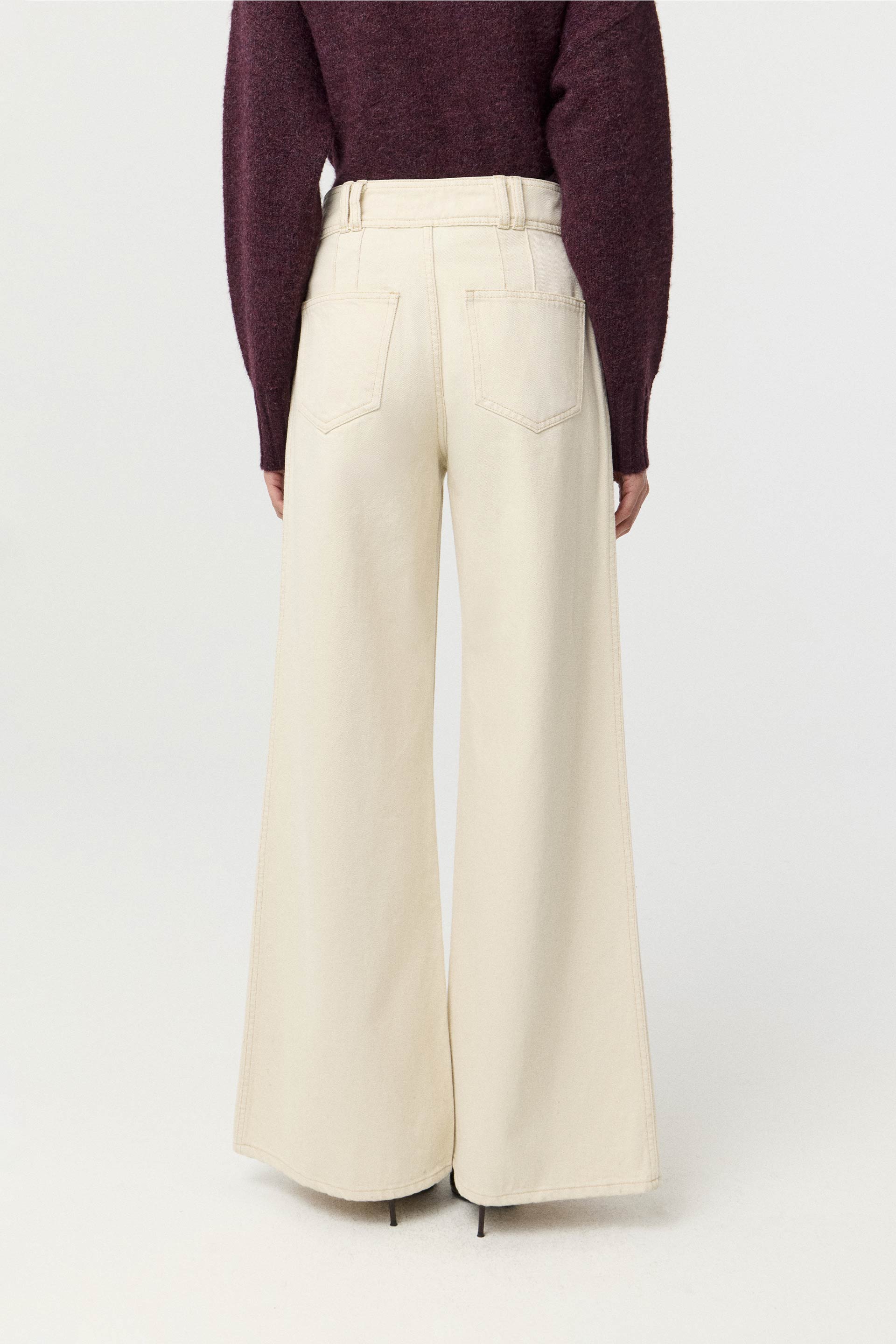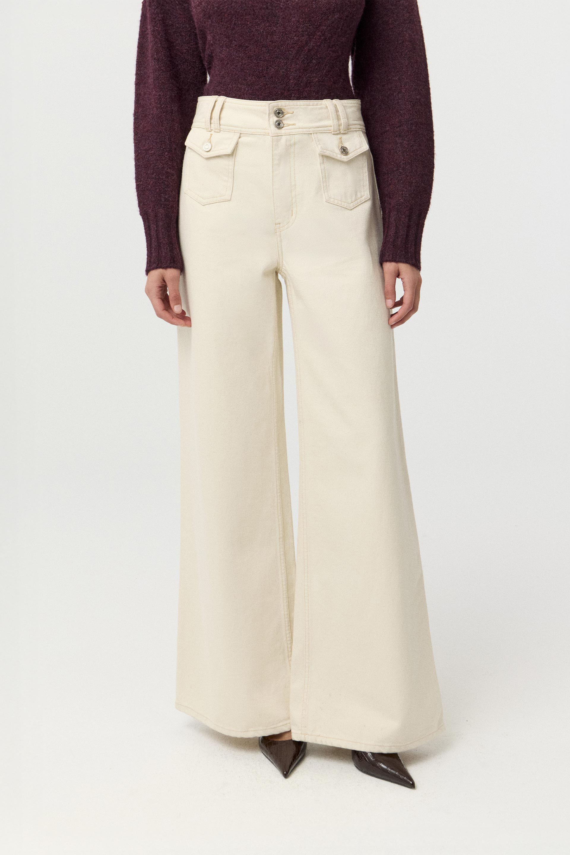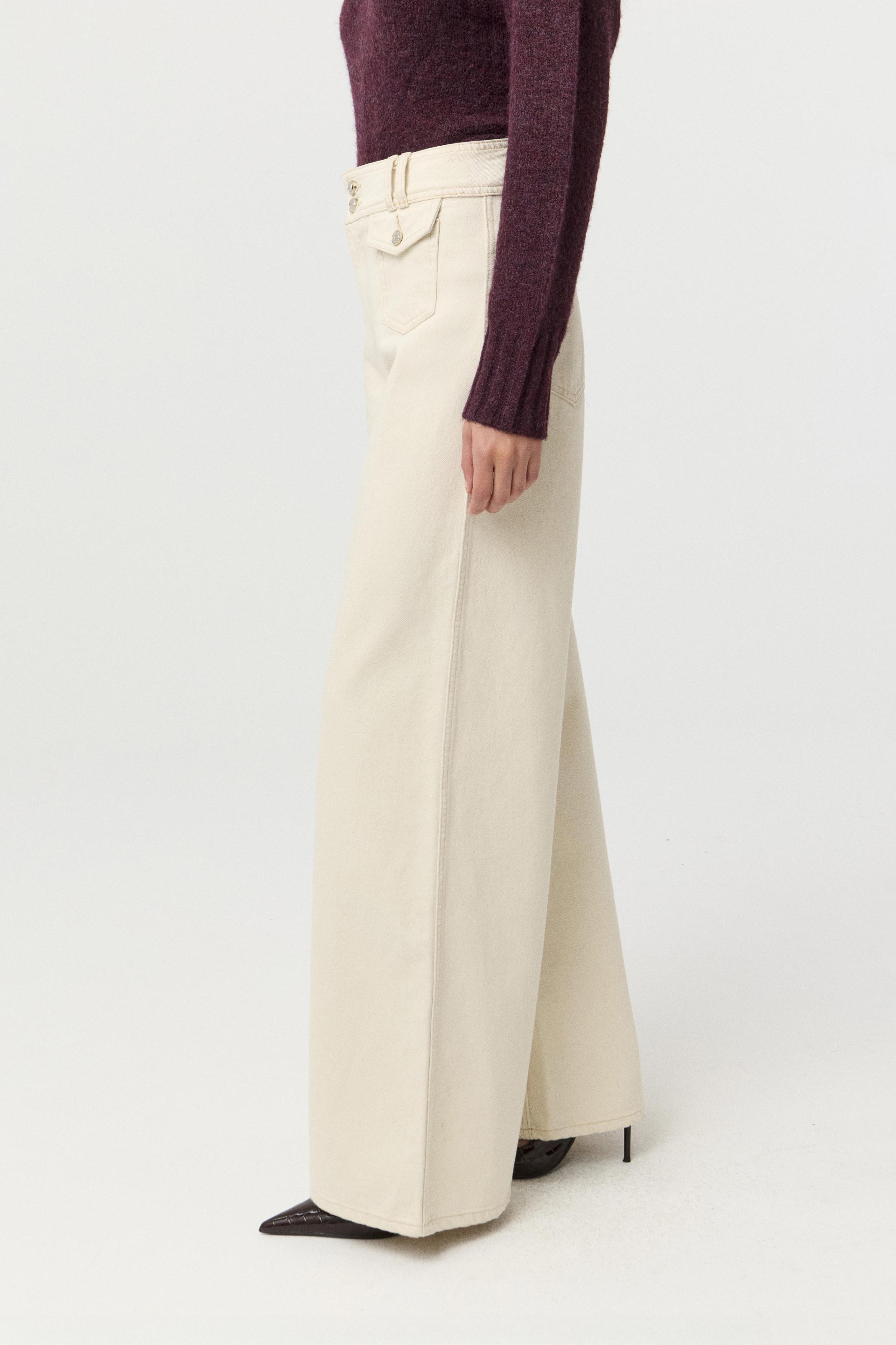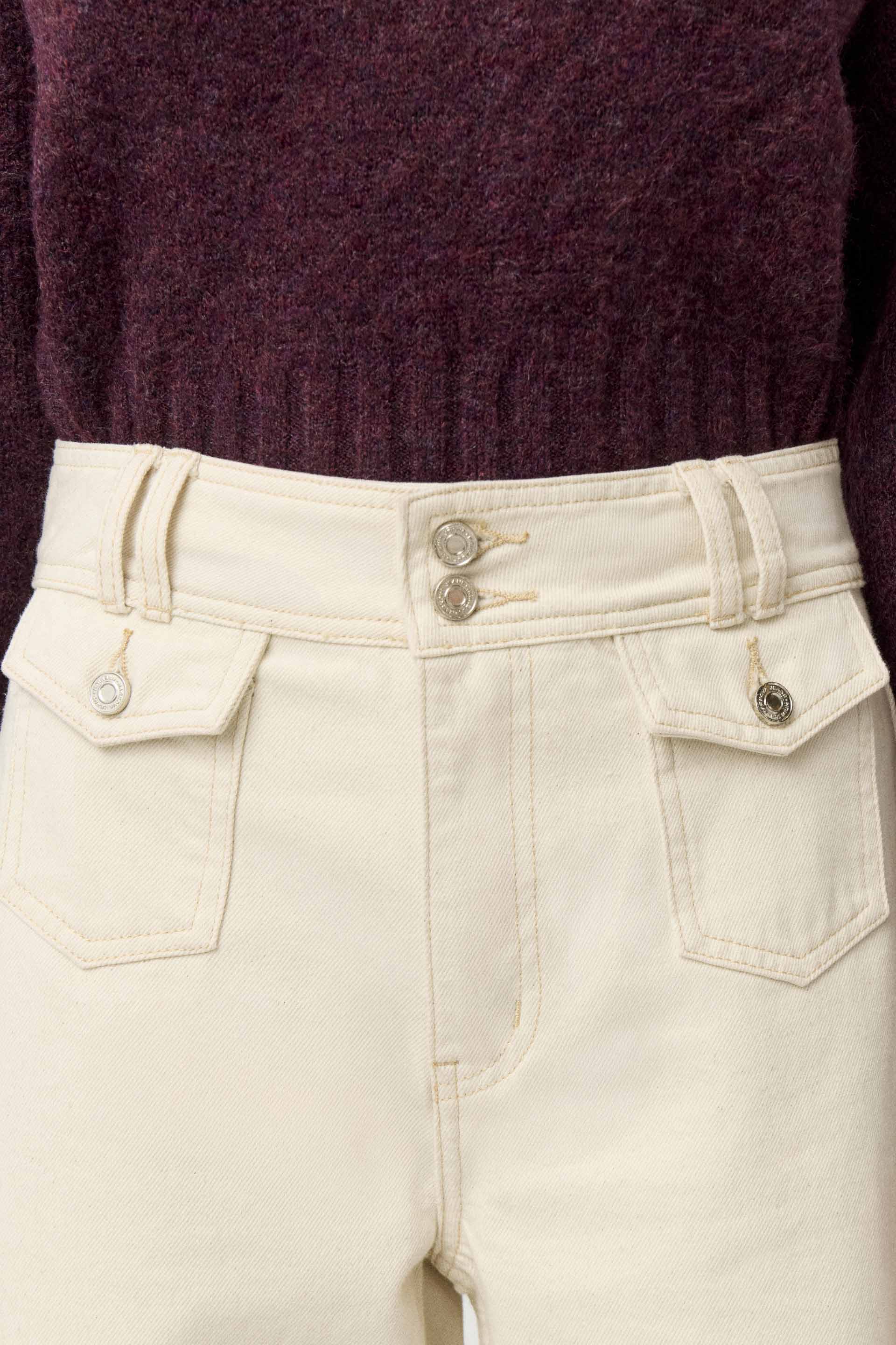 Jean rígido de tiro alto, con pierna ancha y calce relajado. Posee botones personalizados MKV y bolsillos plaqué con tapa en el delantero. Su pierna palazzo y su diseño lo convierten en un ítem de tendencia capaz de elevar todos tus looks. Combinálo con una chaqueta efecto cuero o un blazer para componer un look moderno y canchero.