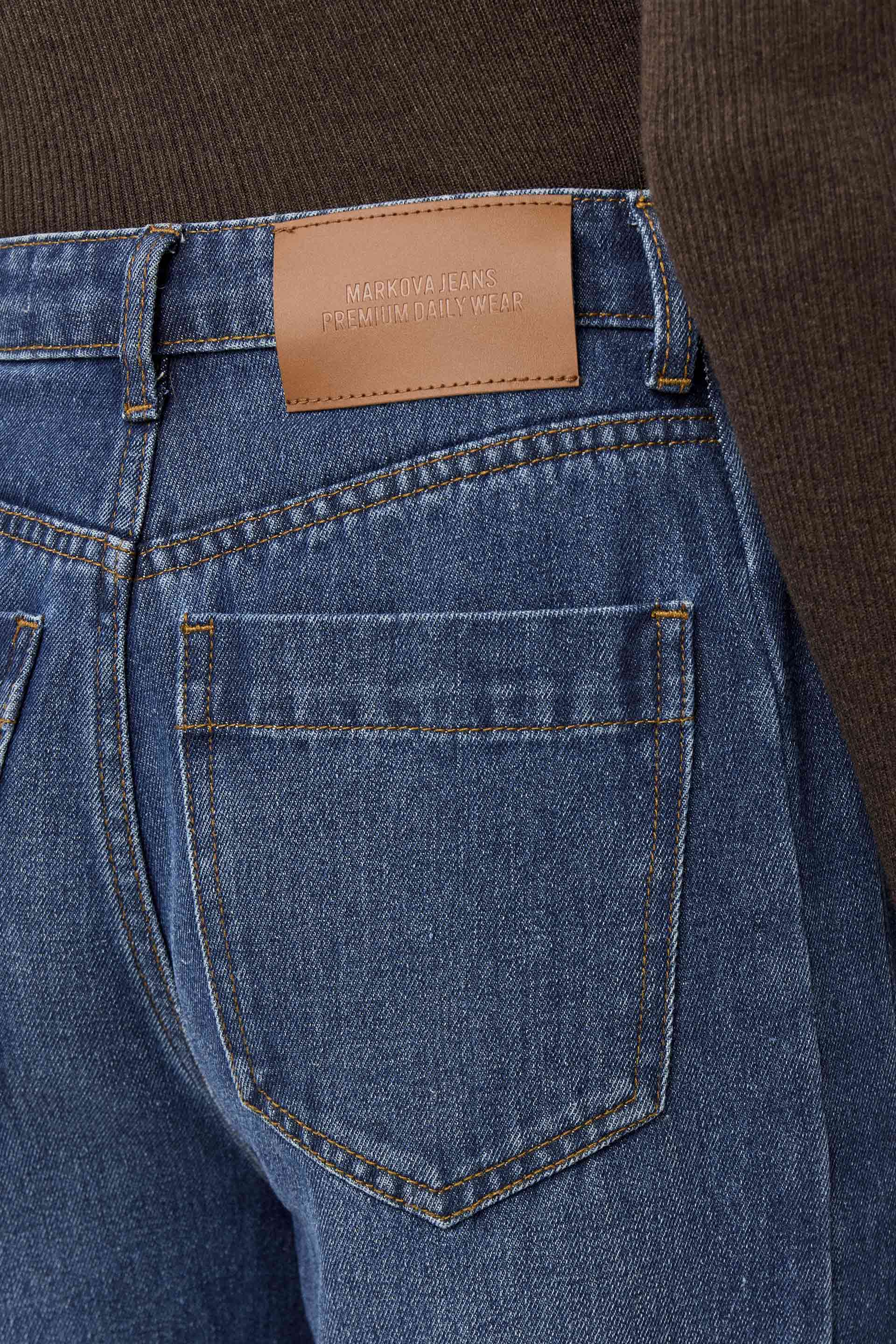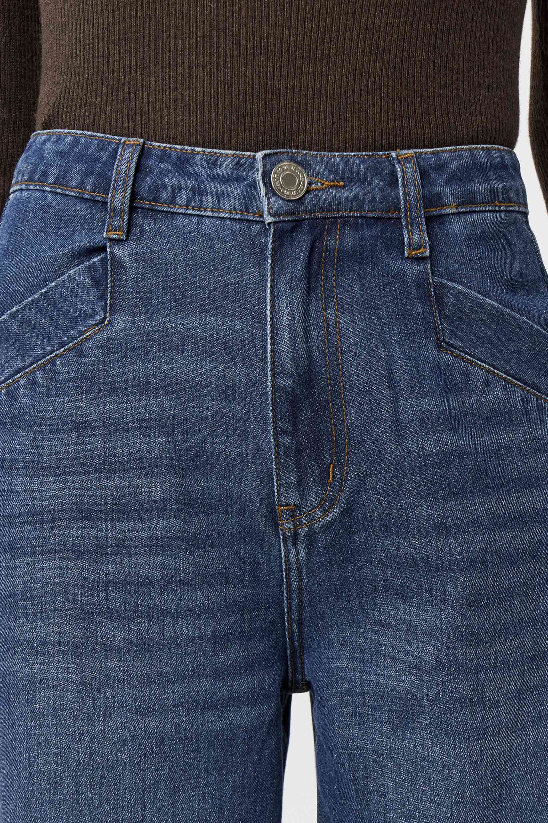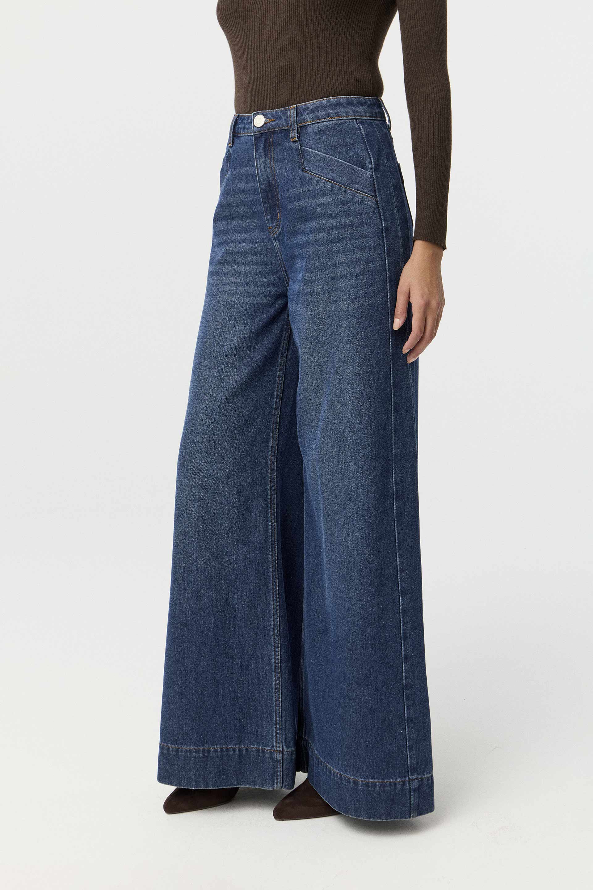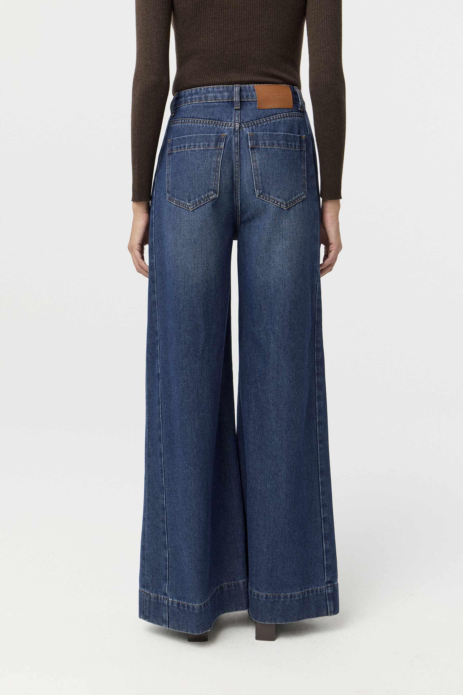 Jean rígido de tiro alto, con pierna ancha y calce relajado. Posee botón personalizado MKV y bolsillos diagonales con vivo ancho en el delantero. Su lavado azul y su diseño lo convierten en un jean clásico, pero su pierna palazzo le da un twist moderno. Usalo tanto para la oficina como para looks más urbanos.