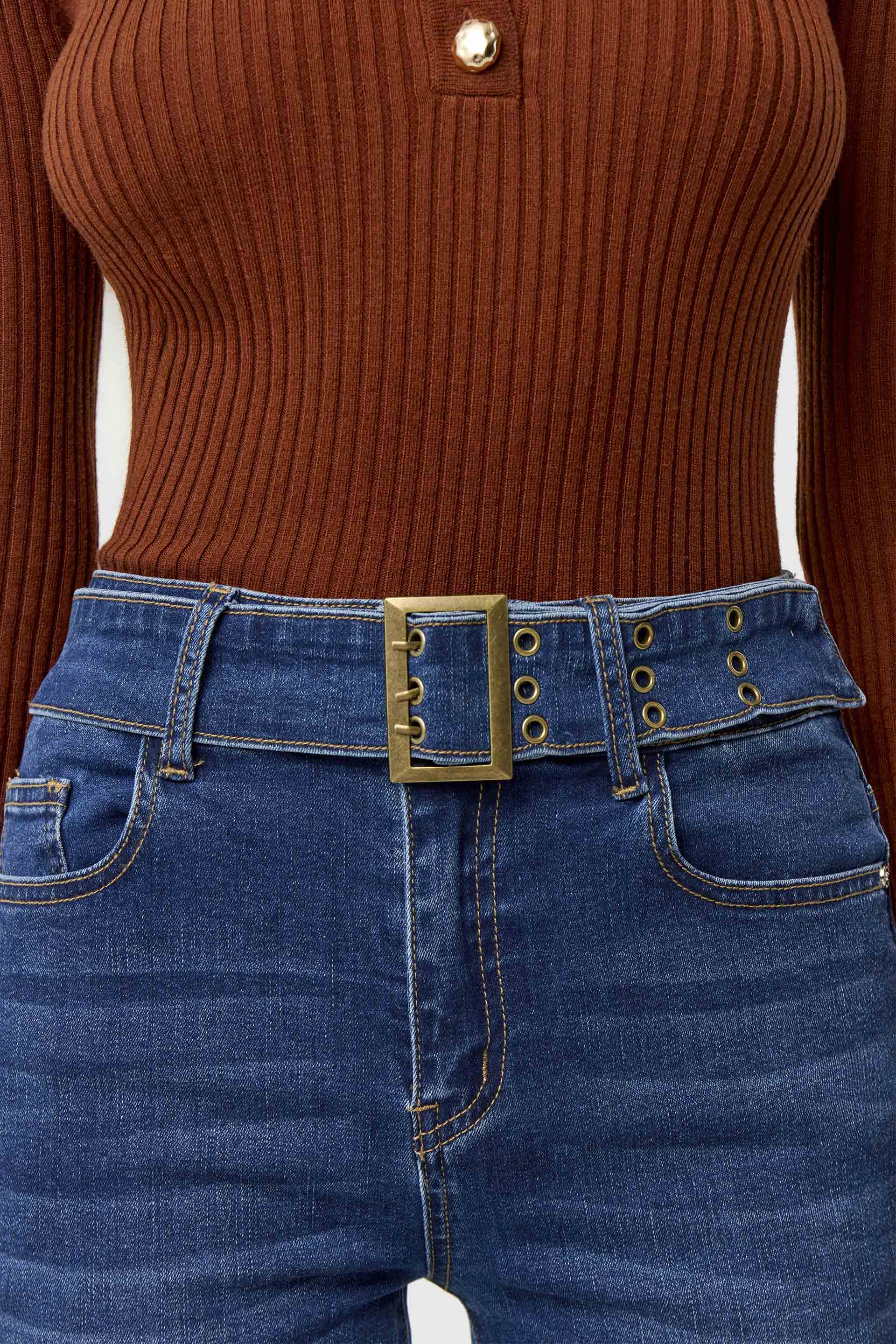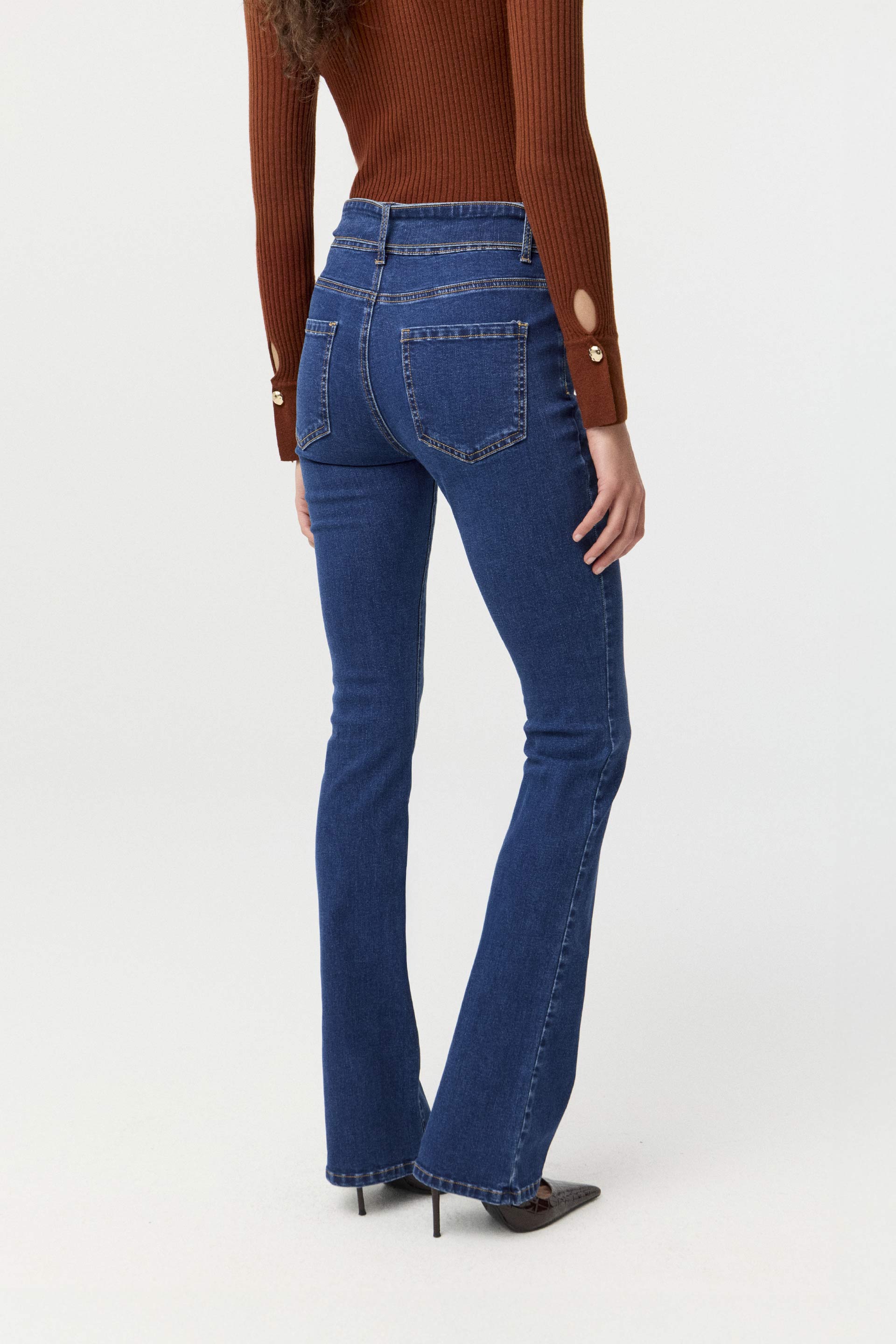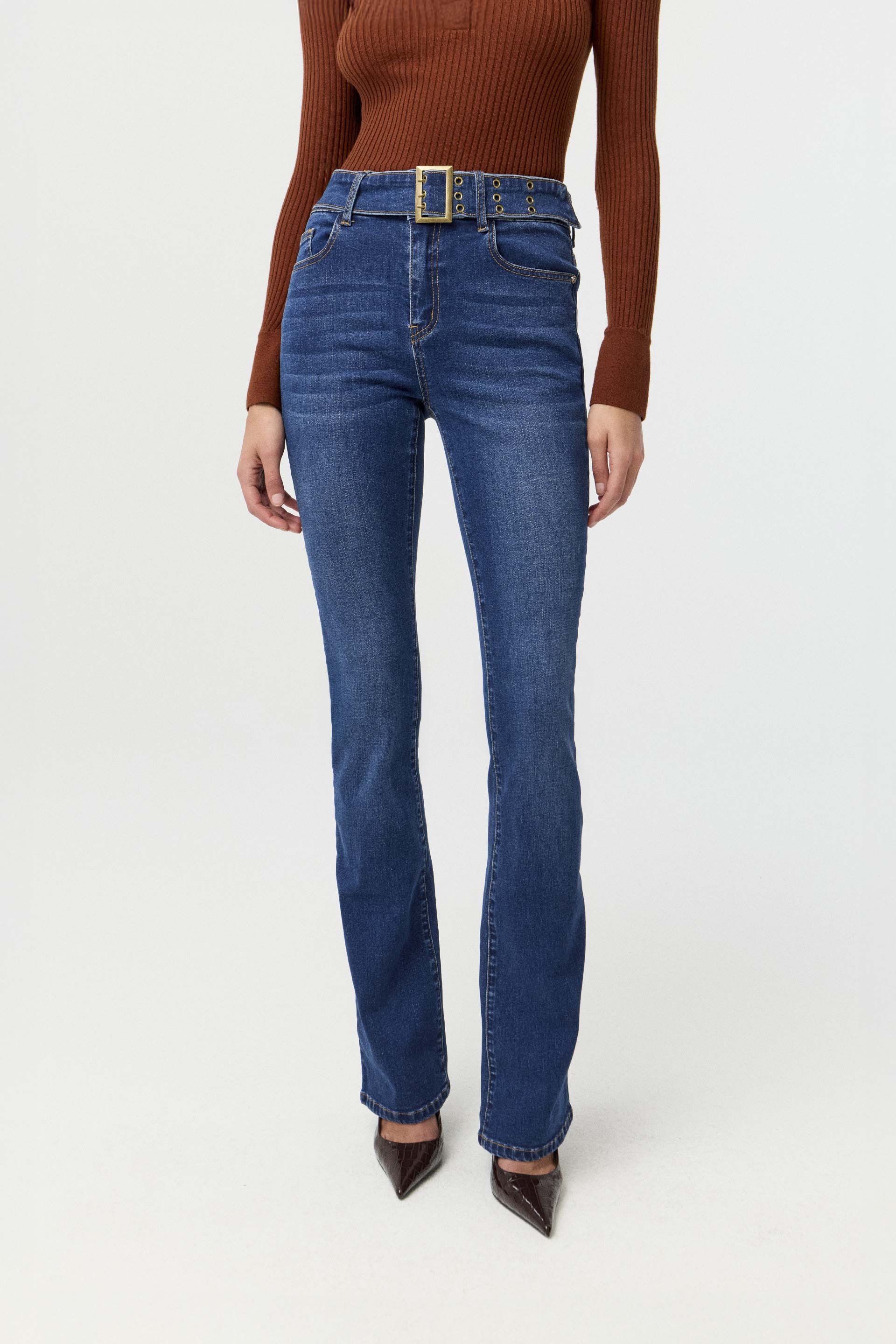 Jean elastizado tiro medio, de pierna flare y calce al cuerpo. Posee cinturón ancho con hebilla y ojalillos metálicos. Su diseño, su calce y su pierna flare lo convierten en un jean moderno y de tendencia. Sin dudas, un ítem que no puede faltar en tu guardarropa este invierno.