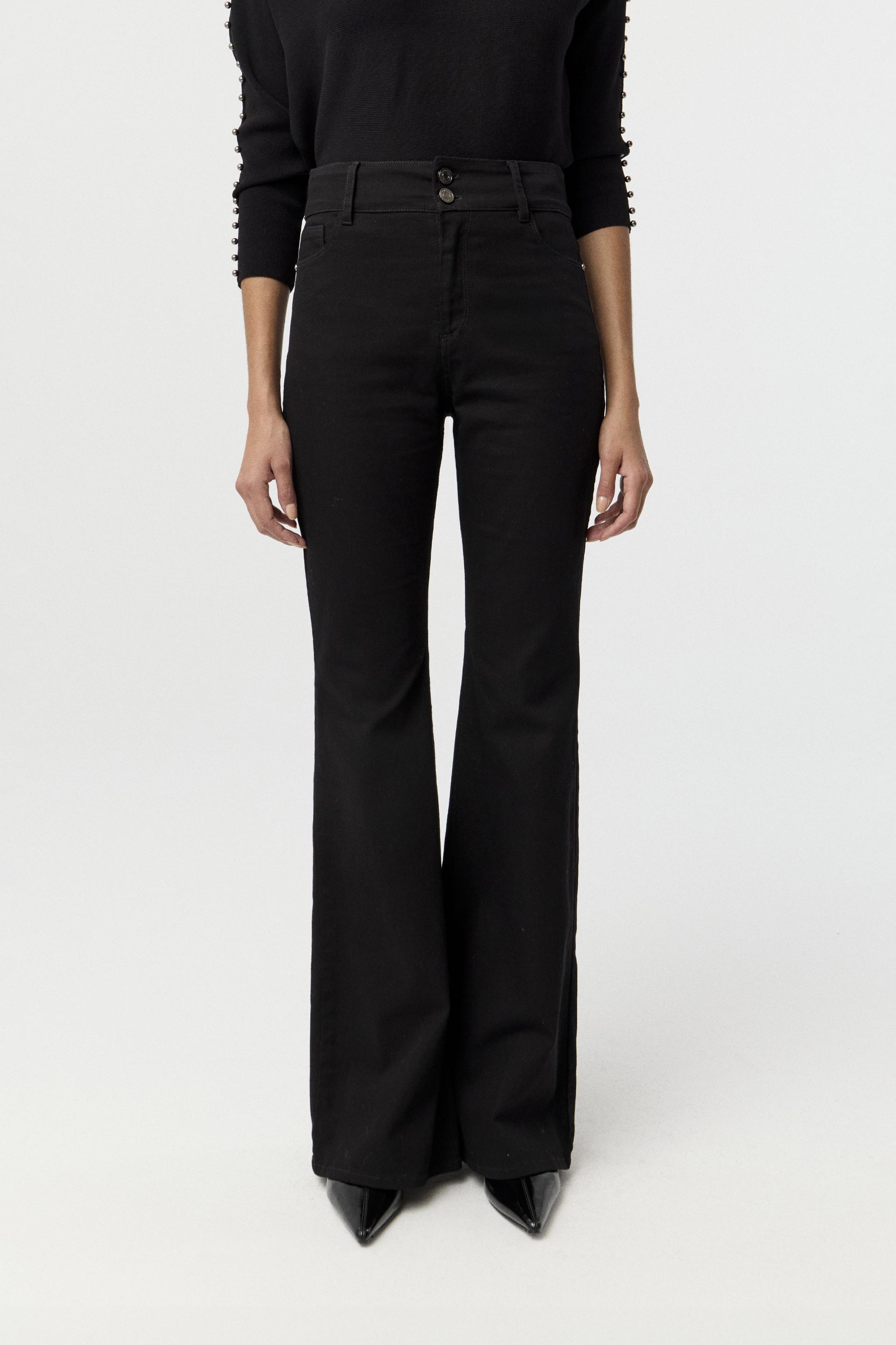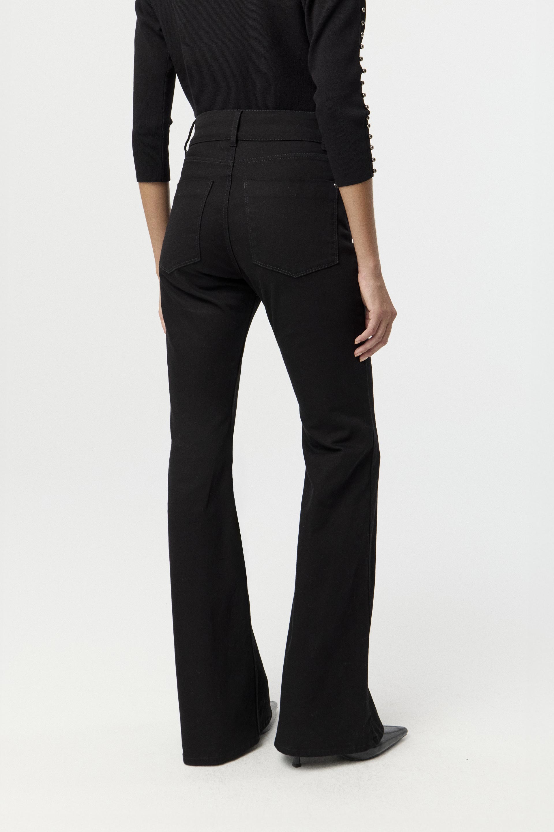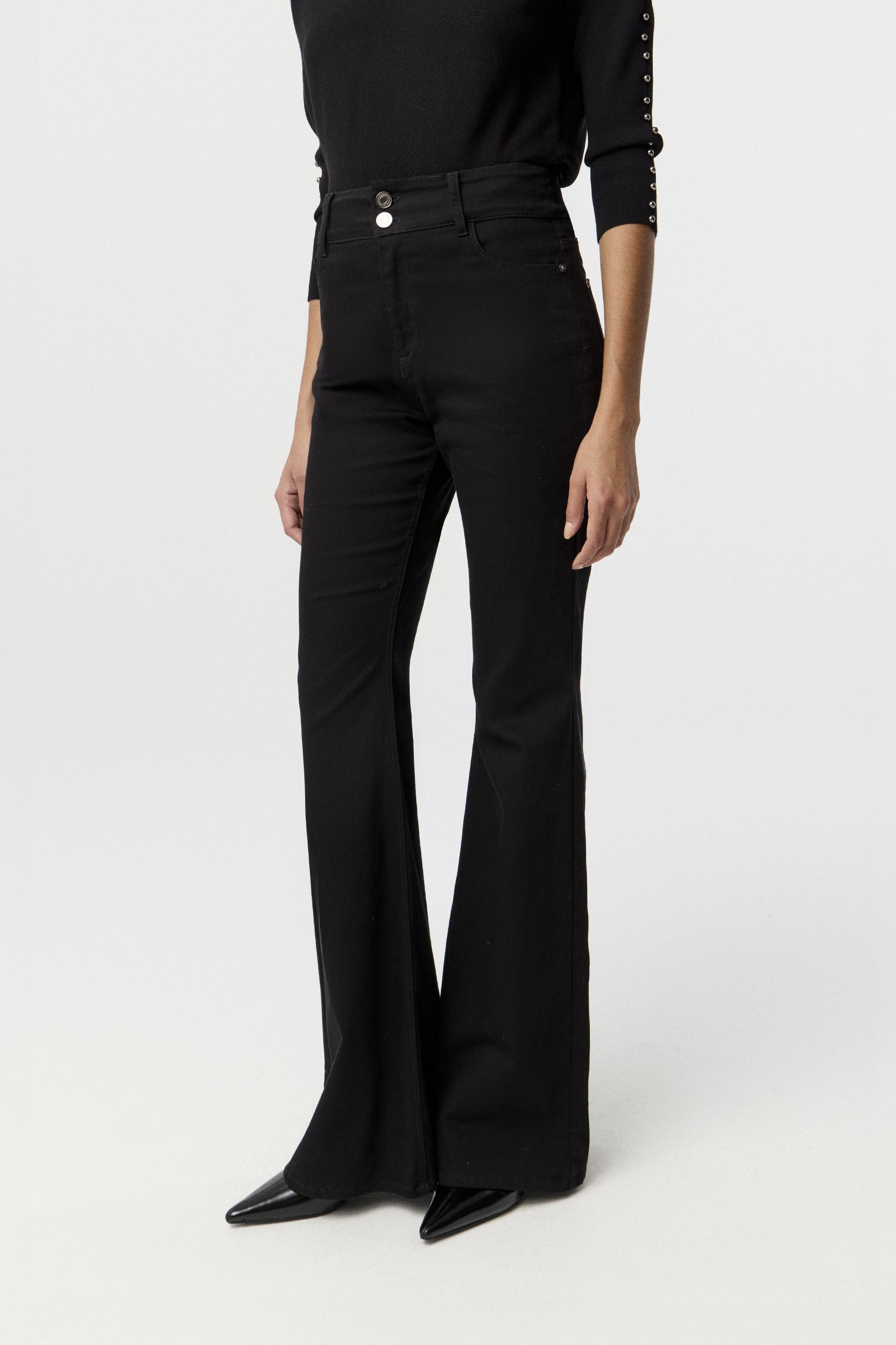 Jean elastizado de tiro alto, pierna flare y calce al cuerpo, con diseño 5 bolsillos. Presenta botones y remaches metálicos MKV, y lavado suavizado que mantiene el color pleno del género con tacto suave. Su cintura ancha con doble botón y la pierna flare le dan un toque clásico con un giro moderno, ideal tanto para la oficina como para salidas informales.